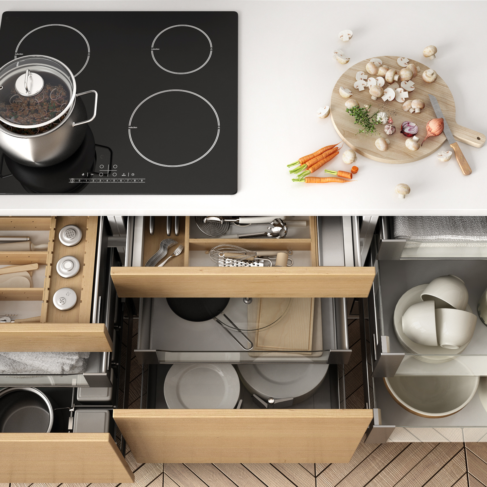Schränke und Schubladen sind der Schlüssel zu einer aufgeräumten Küche. Nerviges Suchen wichtiger Kochutensilien und ein durcheinander in den Schränken gehört damit der Vergangenheit an. Ecklösungen zum Ausziehen, sinnvoll unterteilte Schubladen, herunterklappbare Ablagen oder ein Hochschrank mit Auszug (Apothekerschrank) schaffen den perfekten Überblick und machen den Stauraum bis in den letzten Winkel nutzbar.