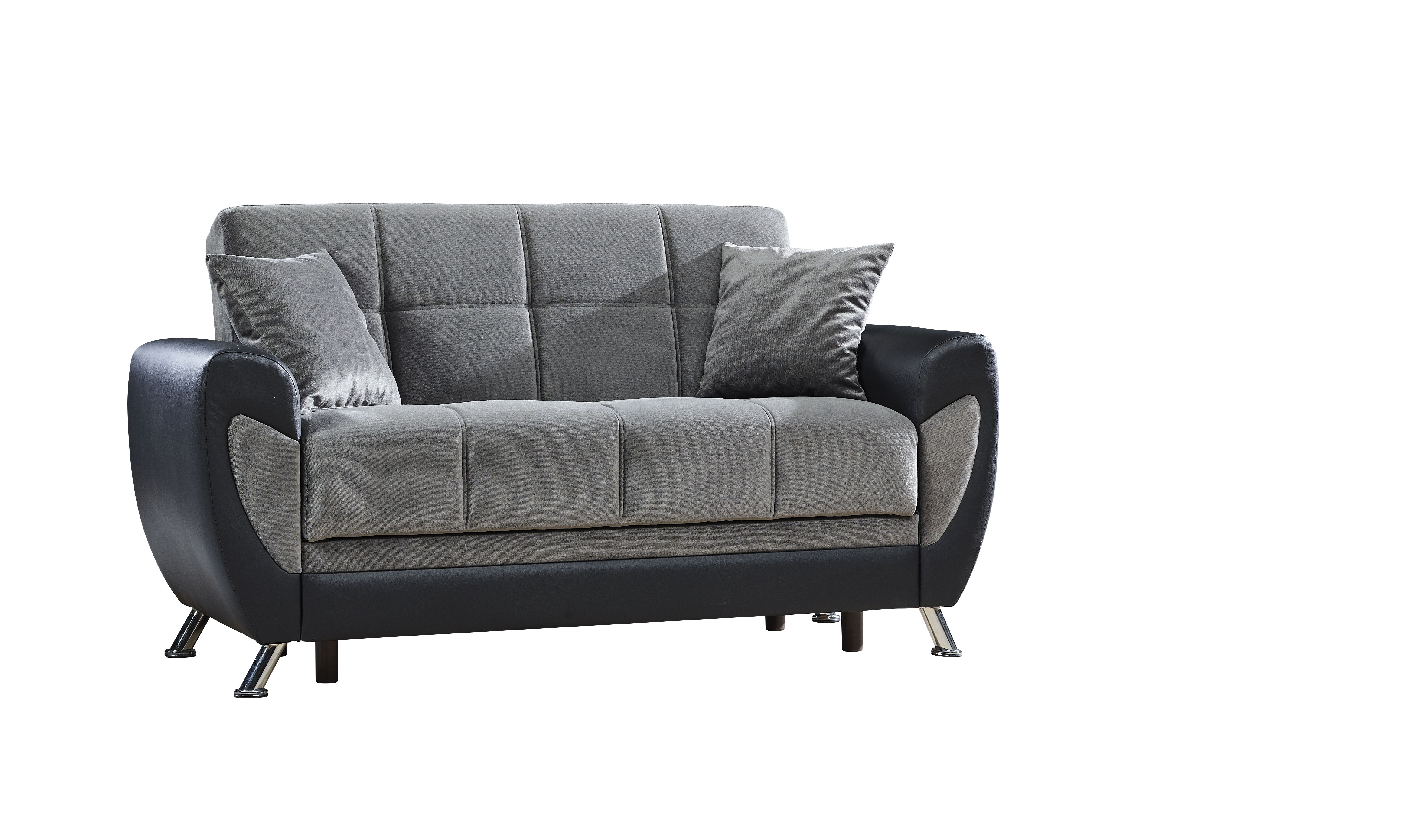 Bezug: Sitz und Rücken im Stoff Melon 715 in der Farbe grau aus 70% Polyester und 30% Baumwolle; Korpus in einem schwarzen Kunstleder aus 100% Polyurethan