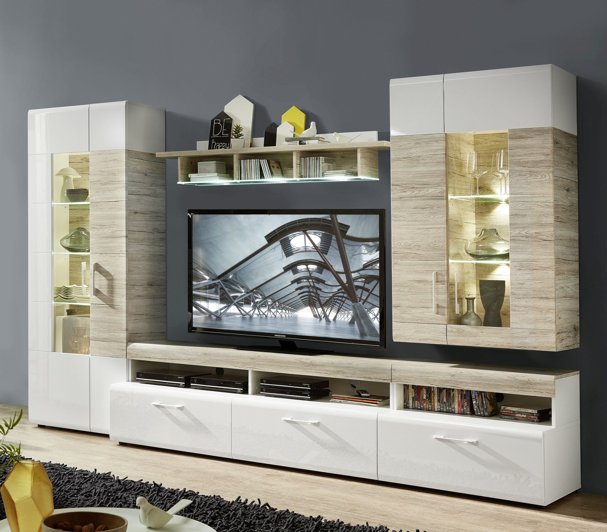 Front: Weiß Hochglanz MDF (Mitteldichte Holzfaserplatte) mit Absetzungen in Sandeiche MDF / Klarglas