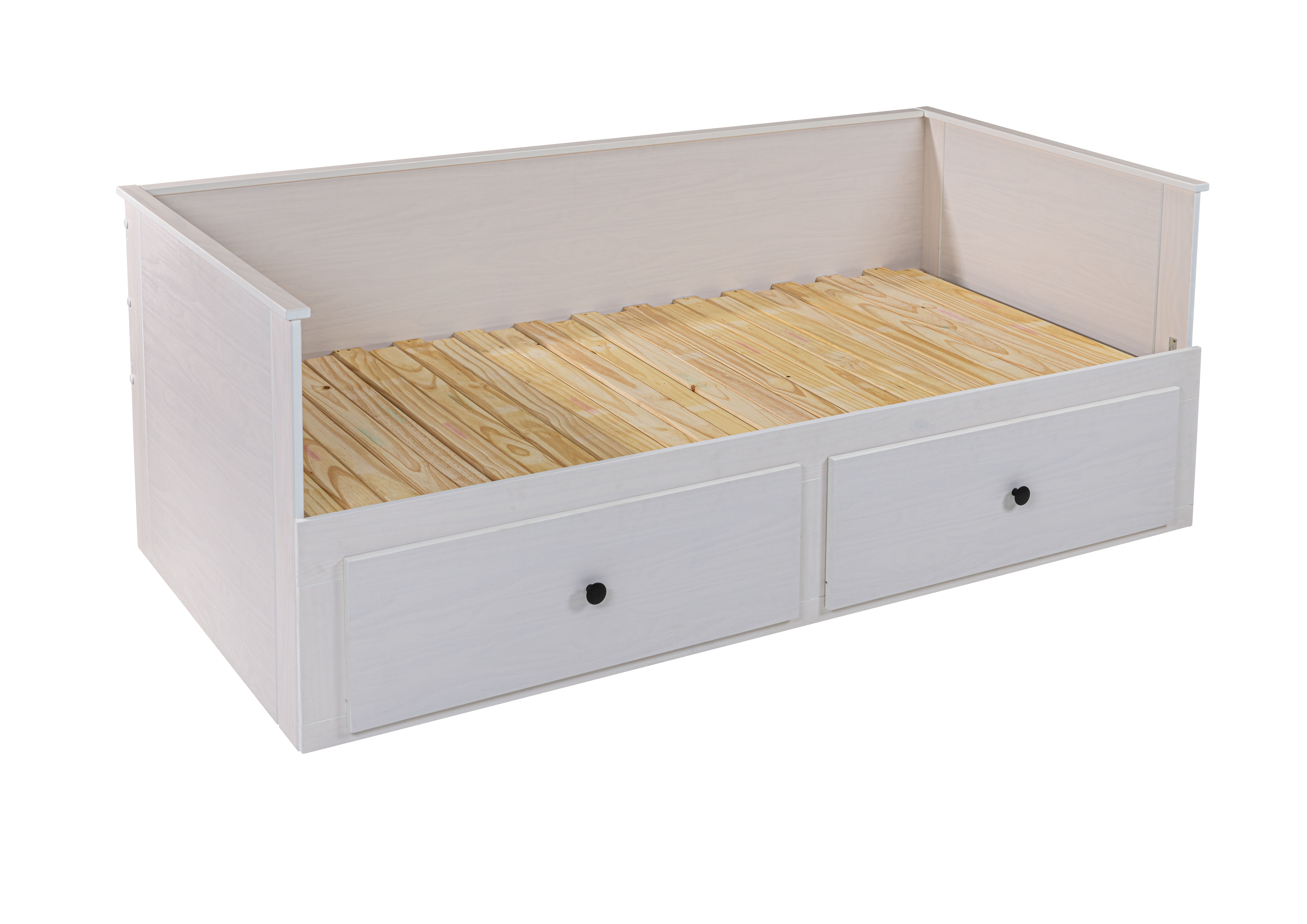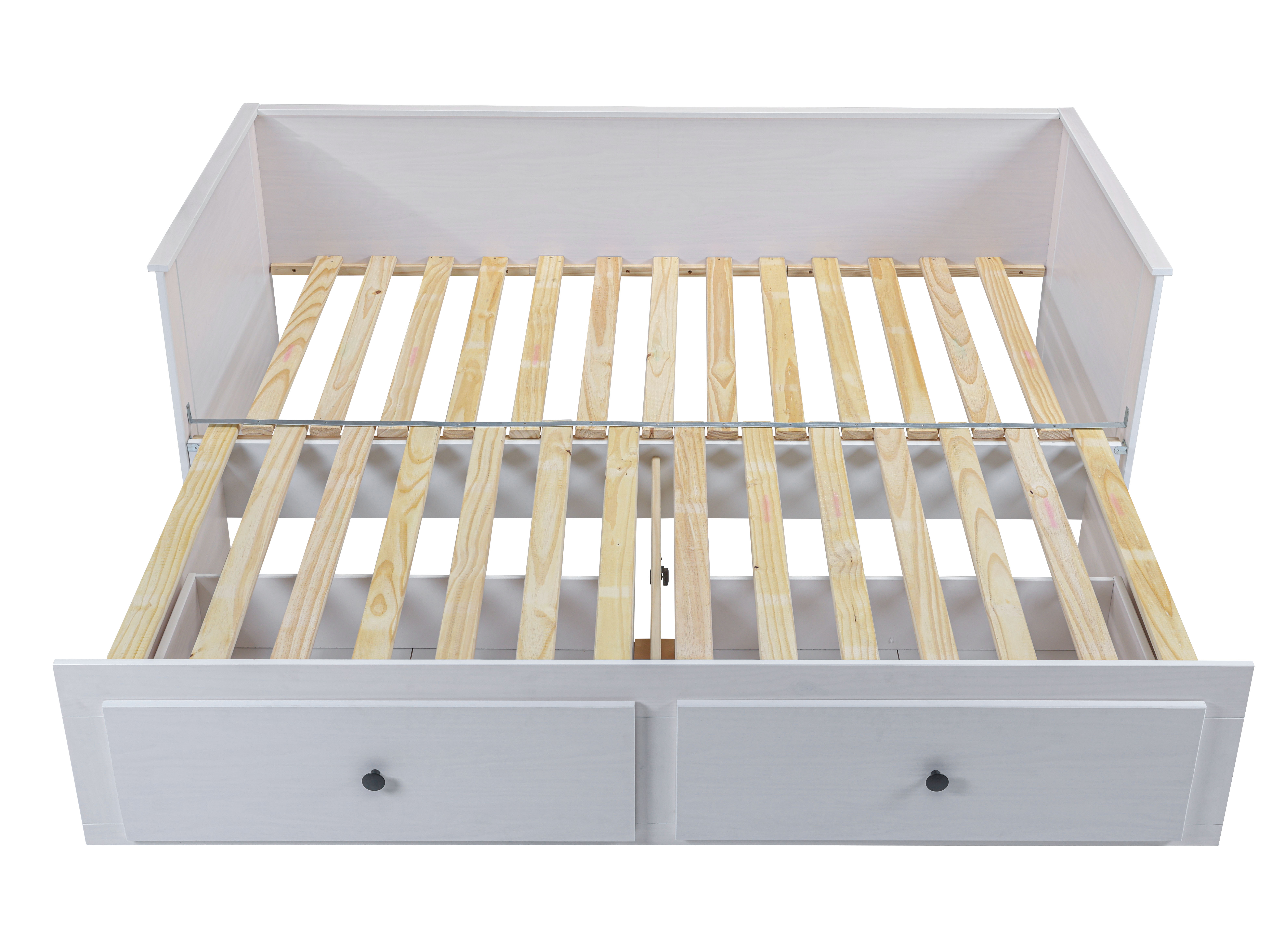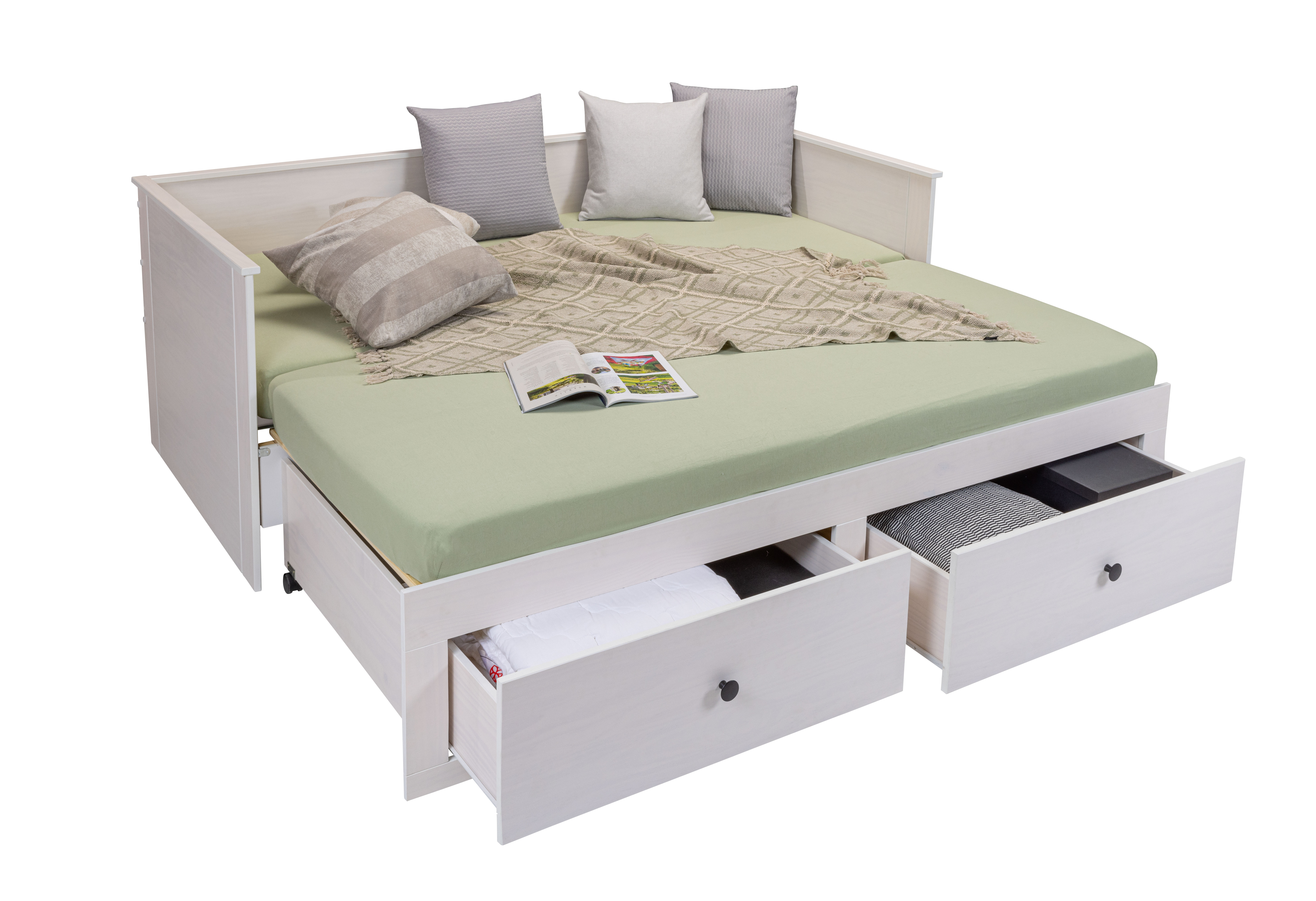 2 Liegeflächen; das Unterteil ist auf Rollen ausziehbar für eine zweite Schlafmöglichkeit