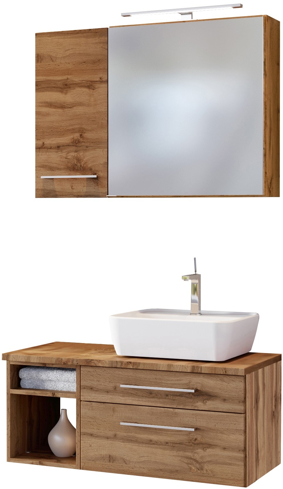 1 Spiegelschrank mit 1 Tür, 2 Einlegeböden, 1 LED-Aufbauleuchte (9,6 Watt), inklusive Trafobox, Schalter und Steckdose