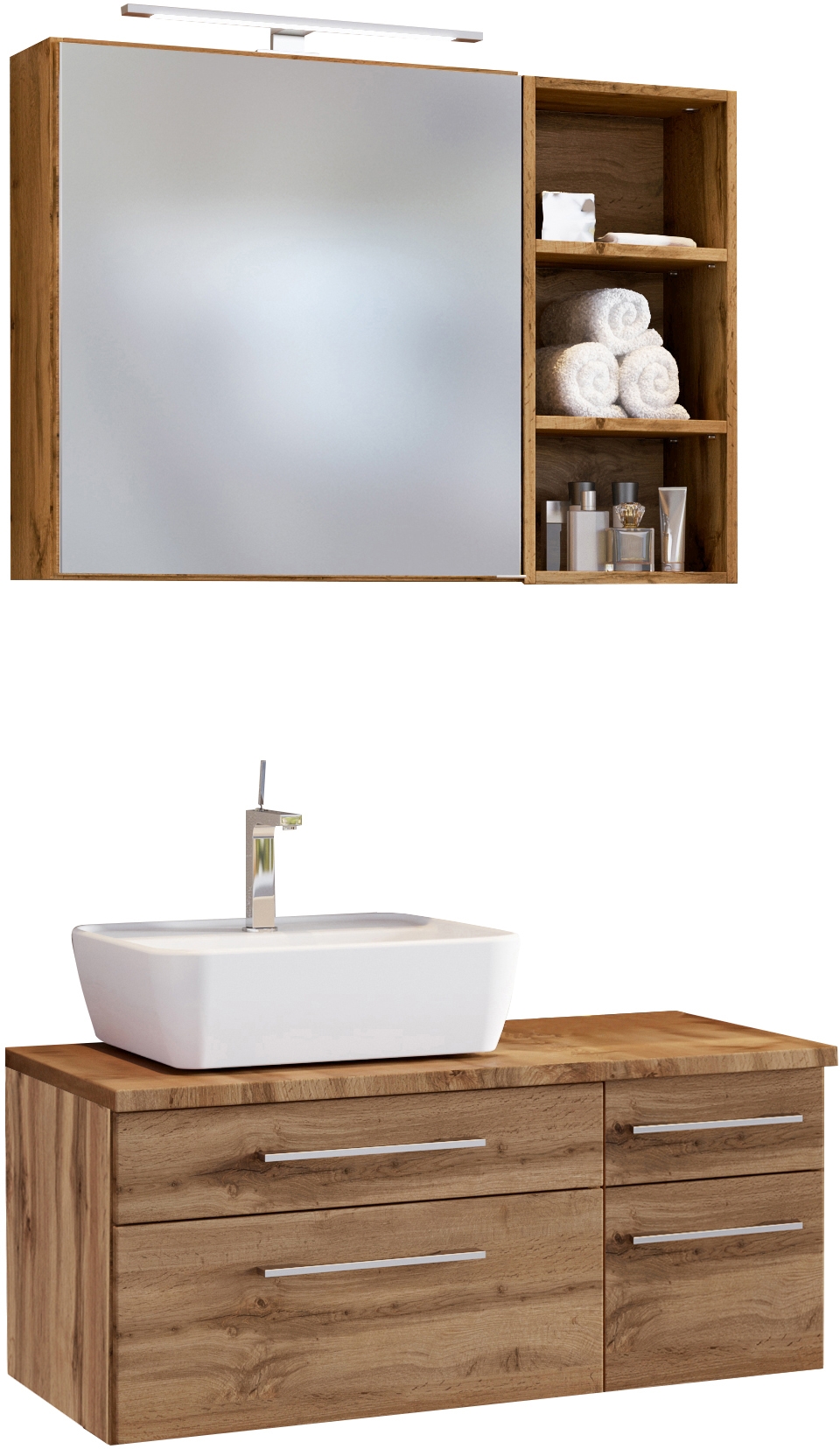 1 Spiegelschrank mit 1 Tür, 2 Einlegeböden, 1 LED-Aufbauleuchte (9,6 Watt), inklusive Trafobox, Schalter und Steckdose