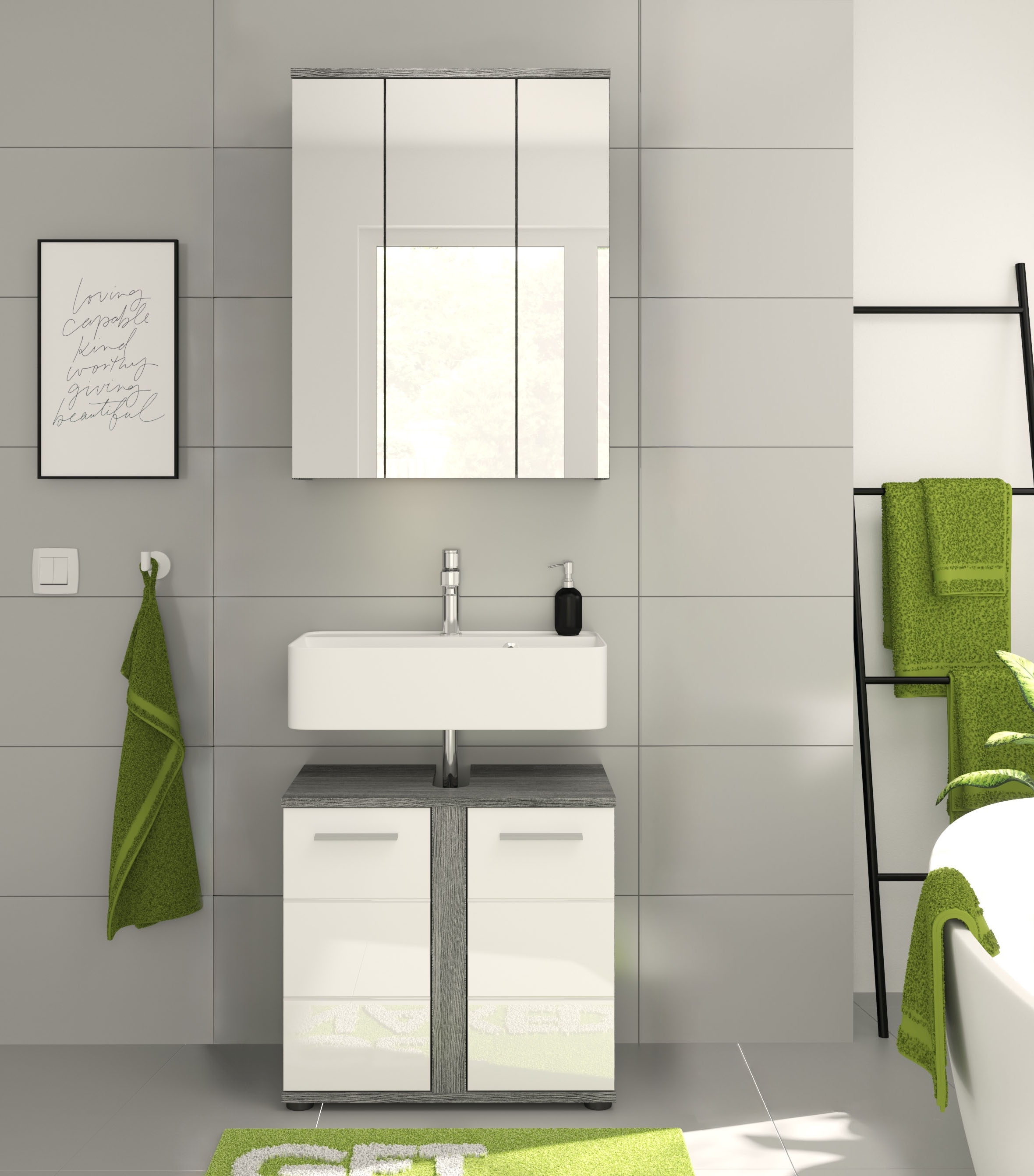Unsere Badkombination vereint Stil und Funktionalität in einem eleganten Design. Die Rauchsilber-Nachbildung in Kombination mit dem strahlenden Weiß-Hochglanz verleiht Ihrem Badezimmer einen modernen und attraktiven Look. Entdecken Sie jetzt diese vielseitige Lösung für Ihr Bad und verwandeln Sie Ihren Raum in eine stilvolle Wohlfühloase.