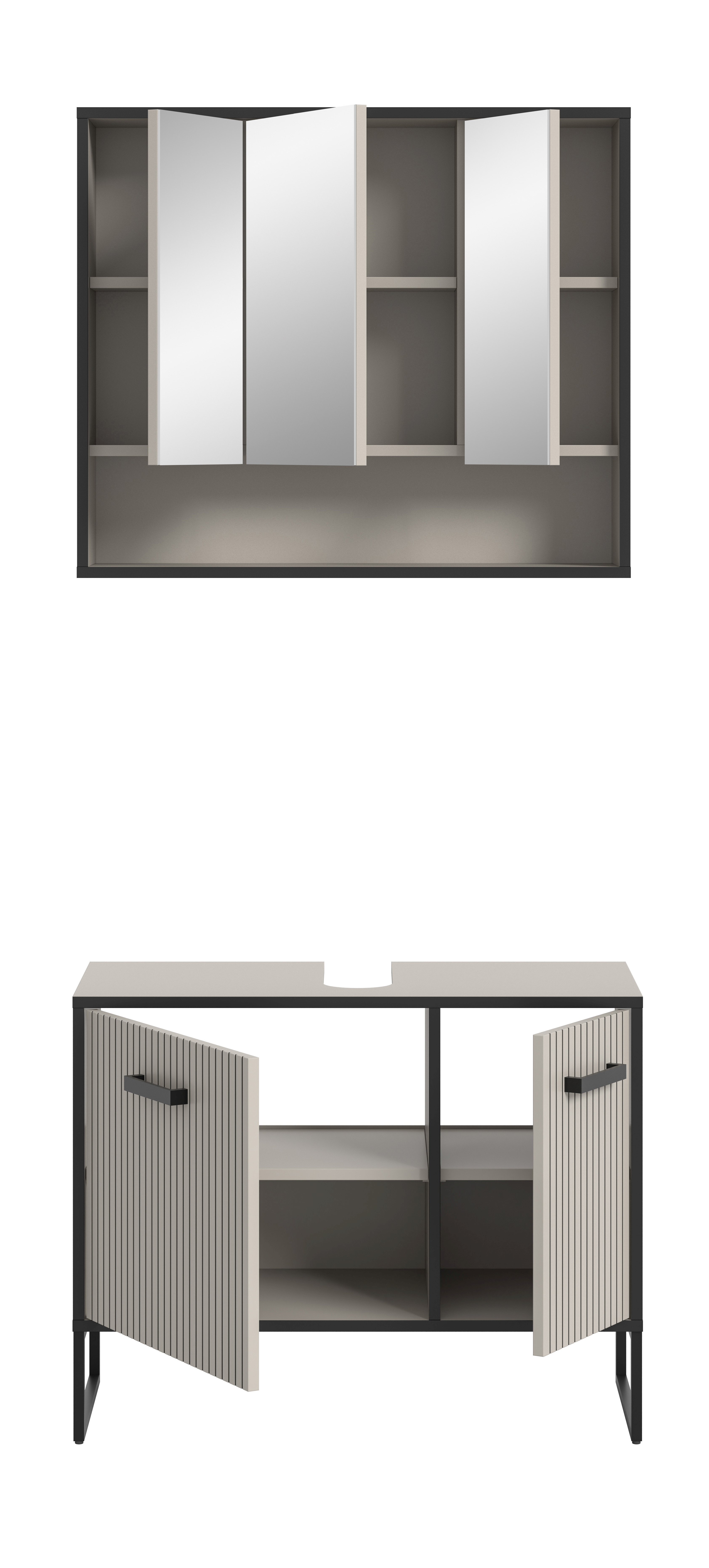 Kompakt und funktional – die 2-teilige Badkombination (B/H/T: 80x192x36 cm) in Kaschmir Holznachbildung bringt Stil in kleine Badezimmer. Ausgestattet mit einem Waschbeckenunterschrank und einem praktischen Spiegelschrank, bietet dieses Set die perfekte Lösung für begrenzte Räume. Die pflegeleichte Oberfläche sorgt dafür, dass Ihr Badezimmer immer frisch und ansprechend aussieht, während die moderne Rillenoptik Ihrer Einrichtung einen eleganten Touch verleiht.