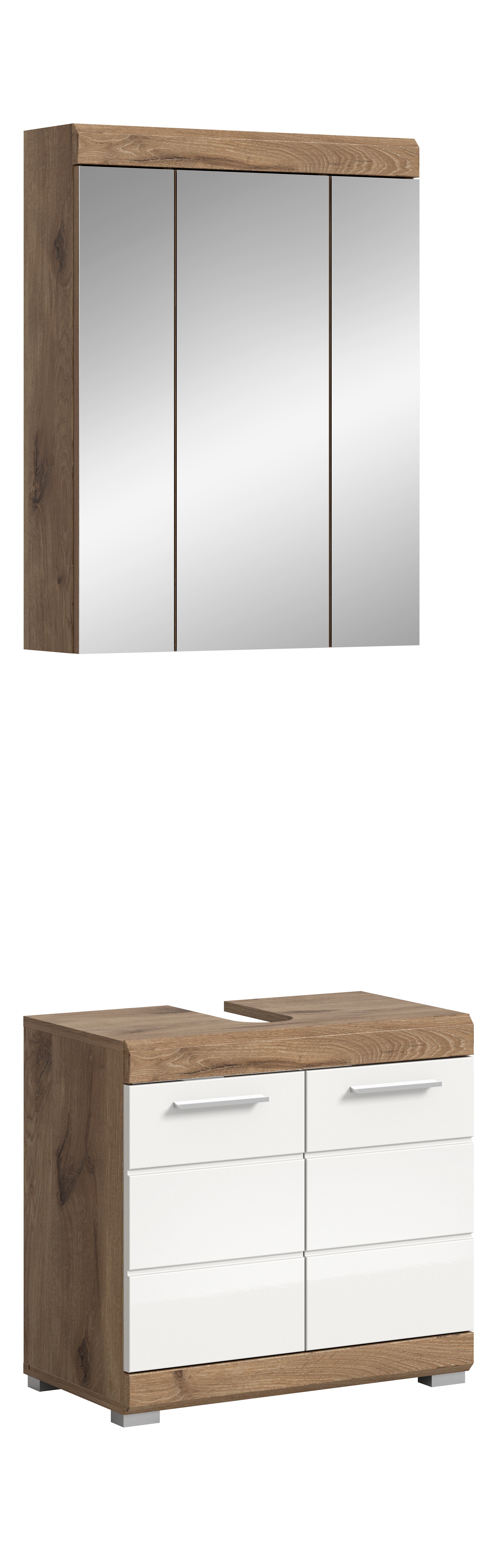 Diese stilvolle Badkombination kombiniert modernes Design mit praktischer Funktionalität. Sie bietet eine platzsparende Lösung für kleinere Badezimmer, ohne dabei auf Stauraum zu verzichten. Die elegante Kombination aus weißem Hochglanz und Nox Oak Nachbildung verleiht Ihrem Badezimmer ein zeitgemäßes und einladendes Ambiente. Die Kombination verfügt über zwei Türen und drei Spiegeltüren, die nicht nur Ihre Utensilien optimal verstauen, sondern auch eine praktische Spiegeloberfläche für Ihre tägliche Routine bieten. Das Design sorgt für eine klare Linienführung und einen aufgeräumten Look.
