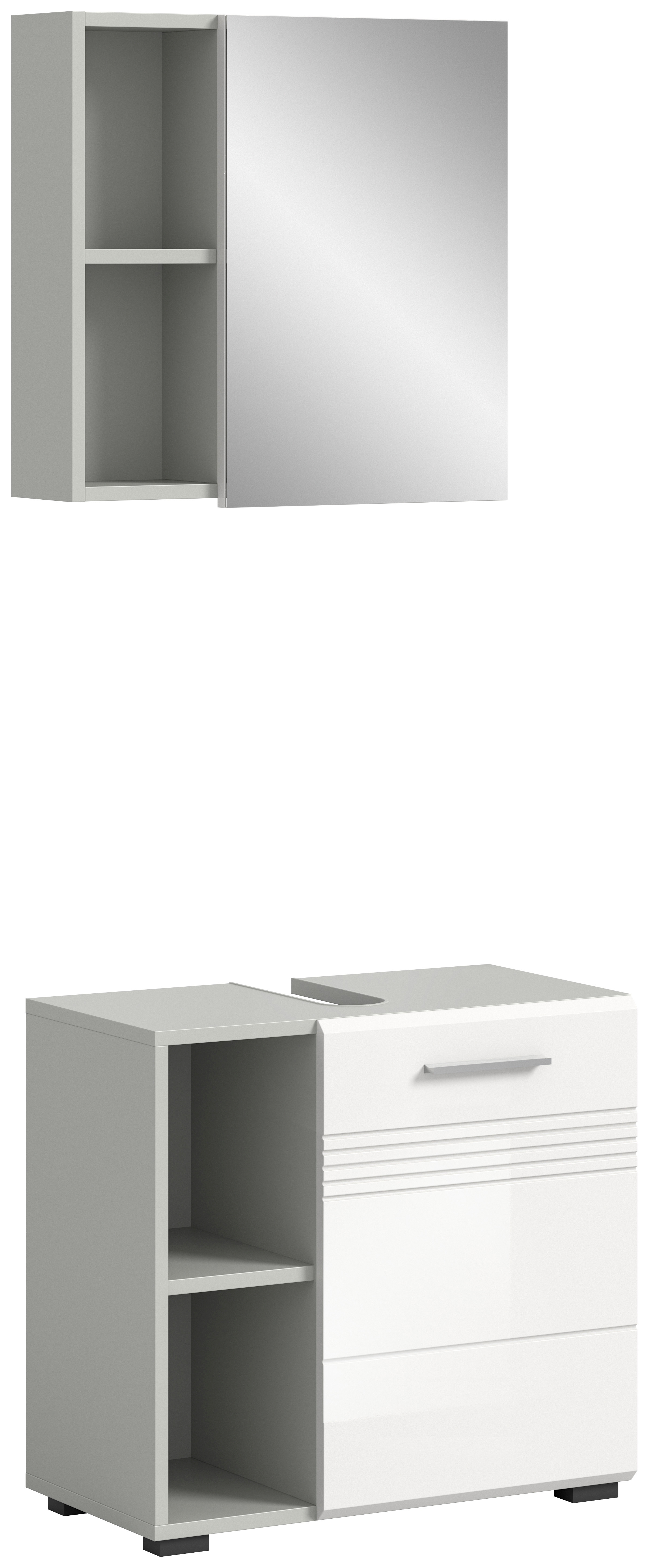 Entdecken Sie unsere moderne Badkombination in eleganter Hellgrau Nachbildung und strahlendem weißem Hochglanz, tiefgezogen für ein glänzendes Finish. Diese Kombination vereint Funktionalität und Stil und bietet mit ihrem zeitgemäßen Design eine perfekte Lösung für Ihr Badezimmer. Mit hochwertiger Verarbeitung und praktischem Stauraum ist sie die ideale Wahl für eine stilvolle und organisierte Badezimmereinrichtung.