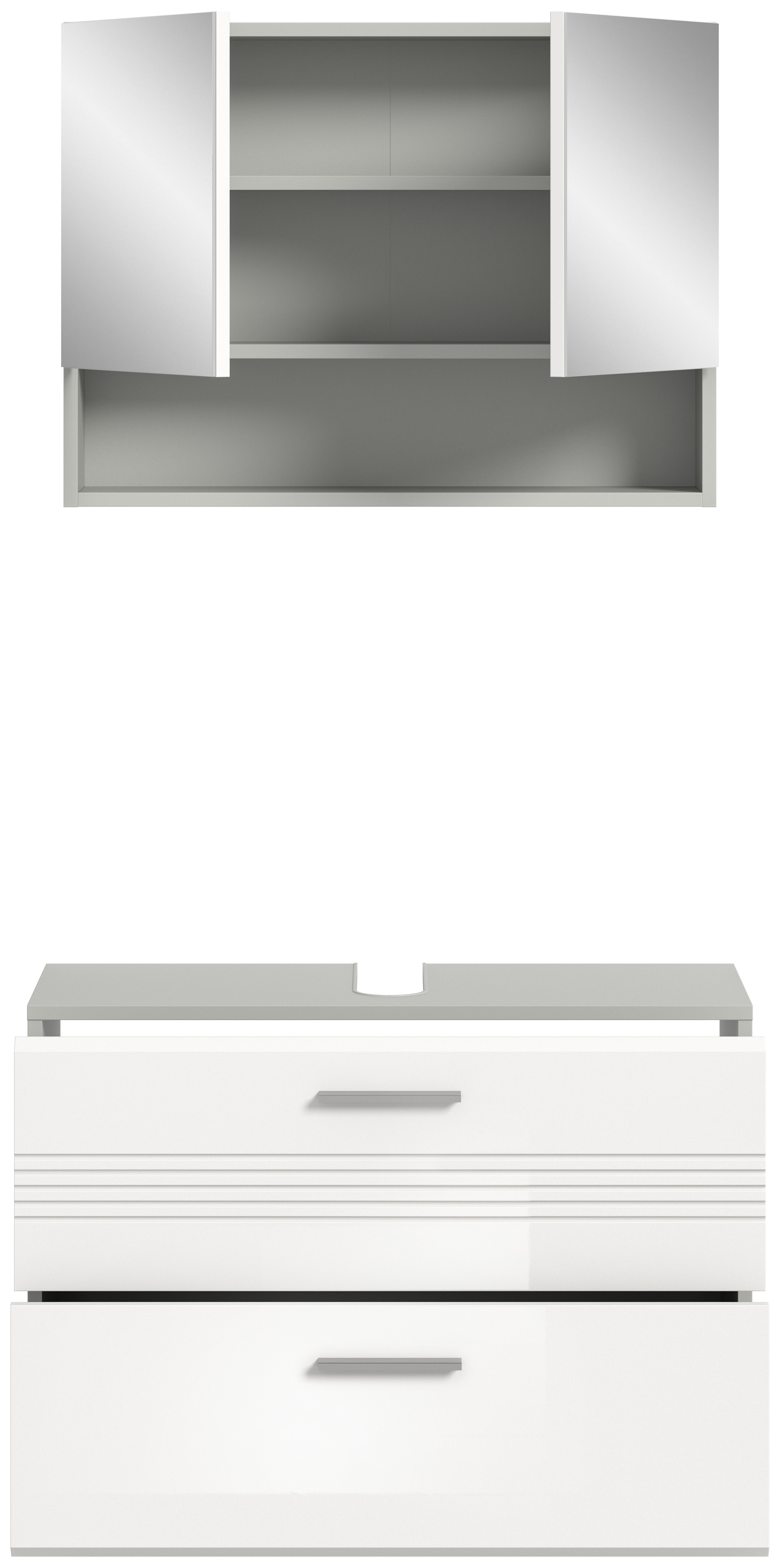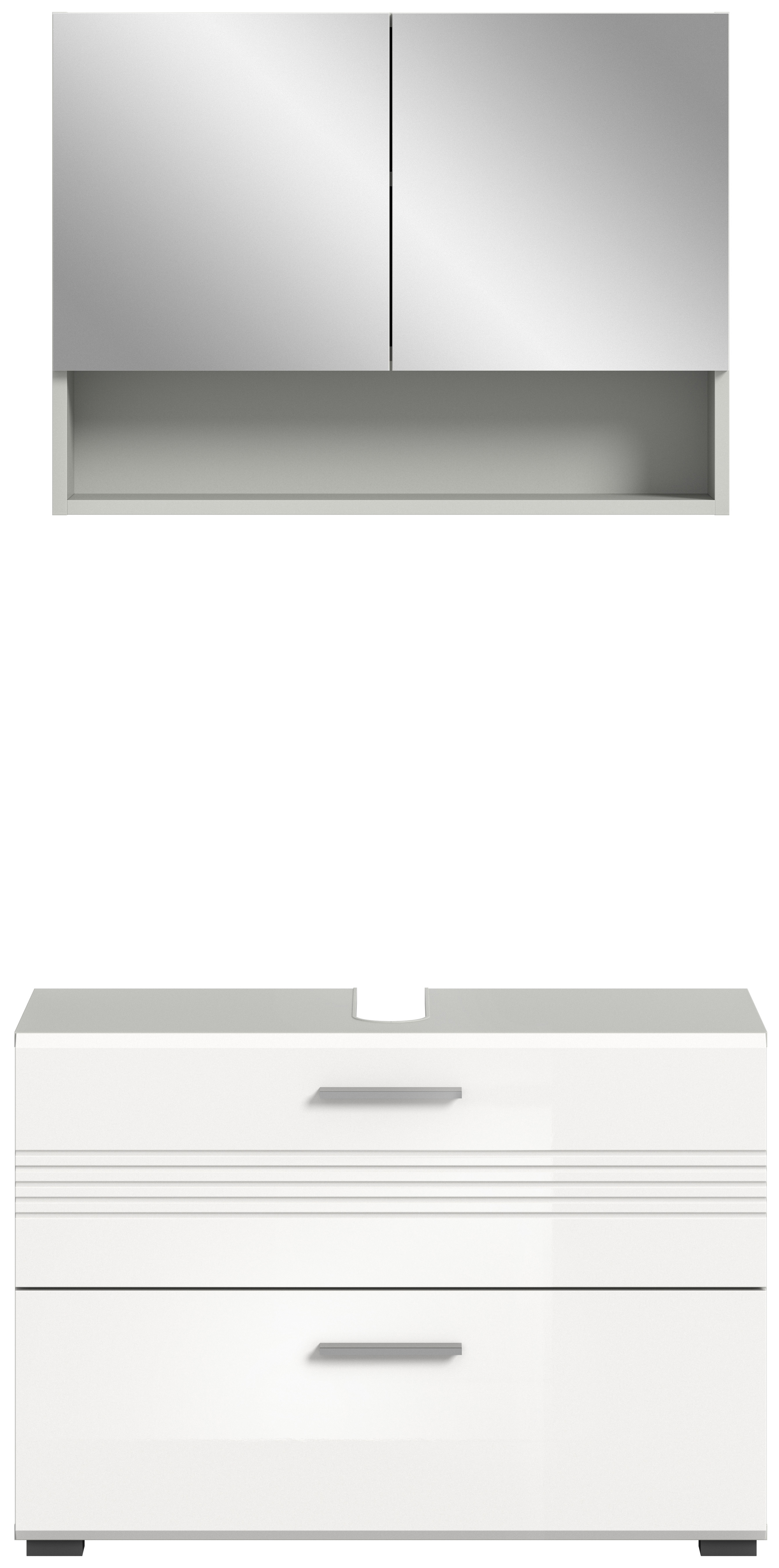 Entdecken Sie unsere moderne Badkombination in eleganter Hellgrau Nachbildung und strahlendem weißem Hochglanz, tiefgezogen für ein glänzendes Finish. Diese Kombination vereint Funktionalität und Stil und bietet mit ihrem zeitgemäßen Design eine perfekte Lösung für Ihr Badezimmer. Mit hochwertiger Verarbeitung und praktischem Stauraum ist sie die ideale Wahl für eine stilvolle und organisierte Badezimmereinrichtung.