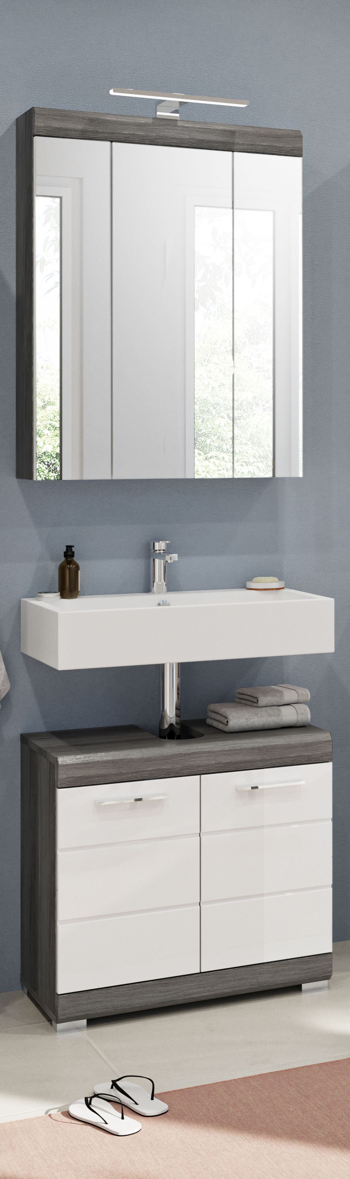 Verleihe deinem Badezimmer den ultimativen Style mit unserer Badkombination in angesagtem Rauchsilber Nachbildung und weißem Hochglanz tiefgezogenem Finish. Mit ihrem trendigen Design und der hochwertigen Verarbeitung setzt sie ein modernes Statement in deinem Zuhause. Entdecke jetzt die perfekte Verbindung von Coolness und Funktionalität für dein Badezimmer!