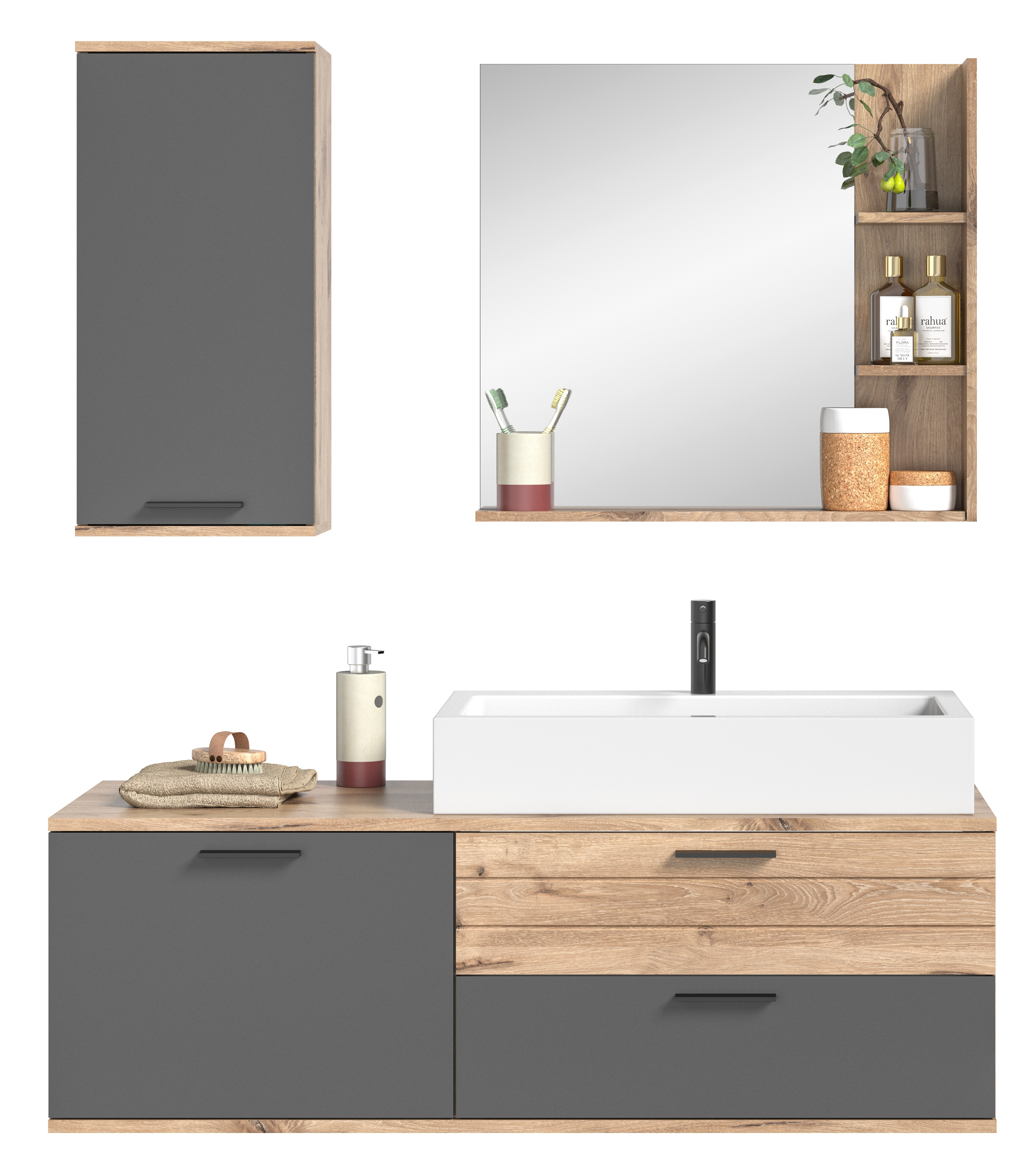 Entdecken Sie unsere moderne Badezimmer-Badkombination in Nox Oak und Basalt grau Nachbildung, die Ihrem Badezimmer eine stilvolle Note verleiht. Diese Kombination aus Waschbeckenunterschrank mit Waschbecken, Hängeschrank und Spiegel bietet nicht nur großzügigen Stauraum, sondern auch eine harmonische Ästhetik. Mit ihrer hochwertigen Verarbeitung und dem zeitlosen Design ist sie die perfekte Wahl für eine elegante Badezimmereinrichtung.,