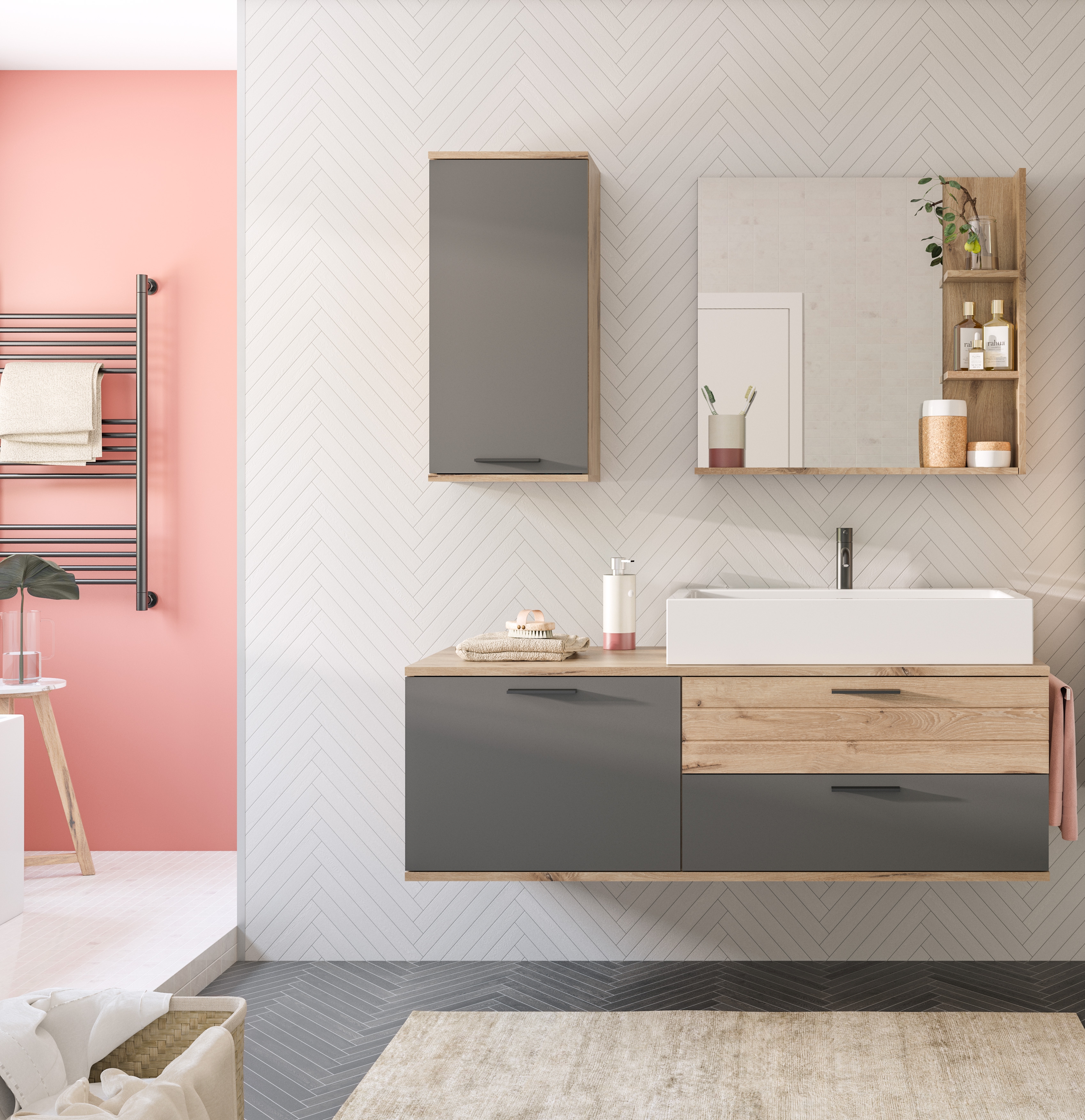 - Design/Stil: Die Badkombination mit Nox Oak Nachbildung und Basalt grau Nachbildung besticht durch ihr modernes und ansprechendes Design. Die Kombination der beiden Farben verleiht dem Badezimmermöbel einen zeitgemäßen Look mit einem Hauch von Eleganz.