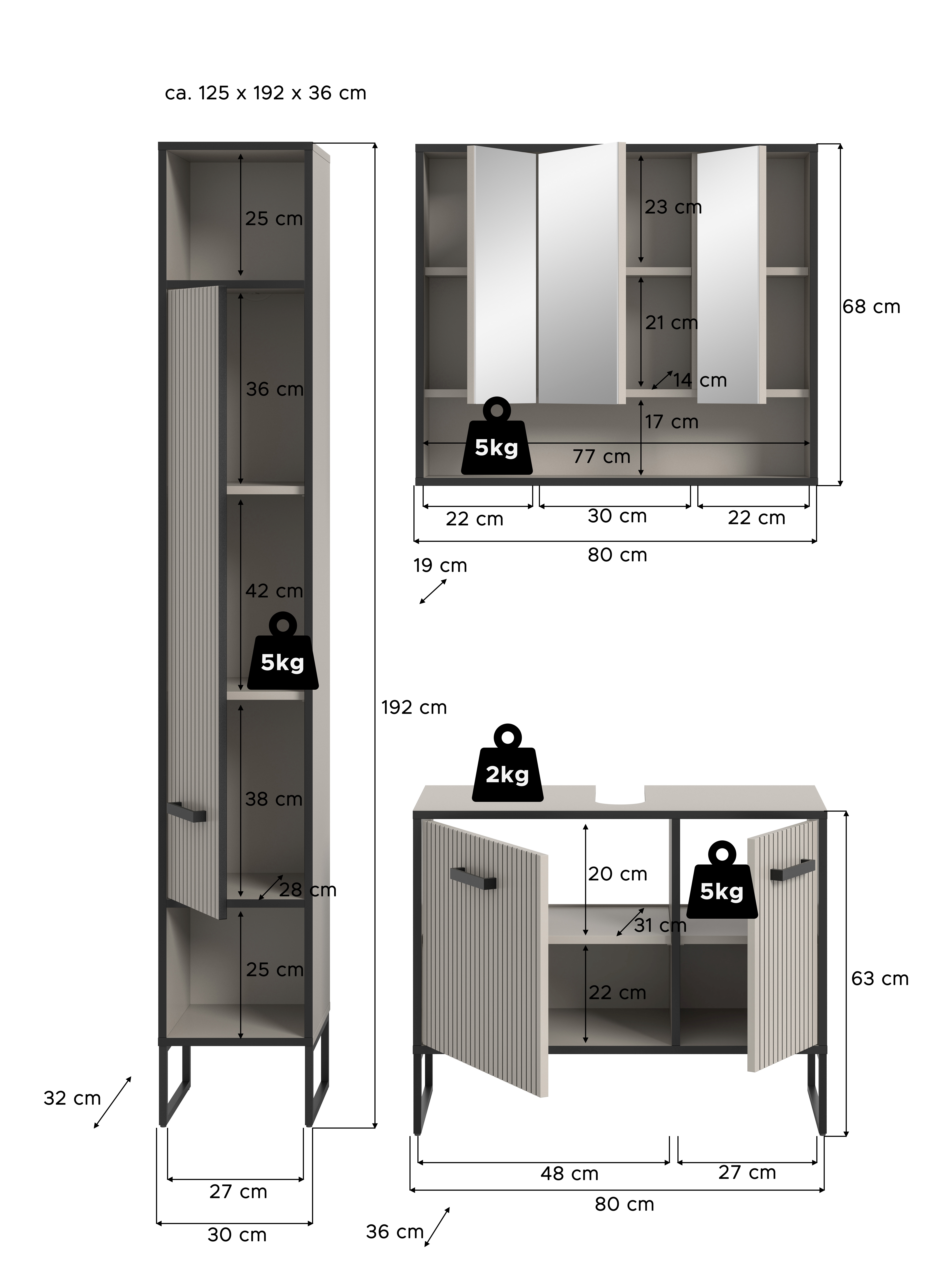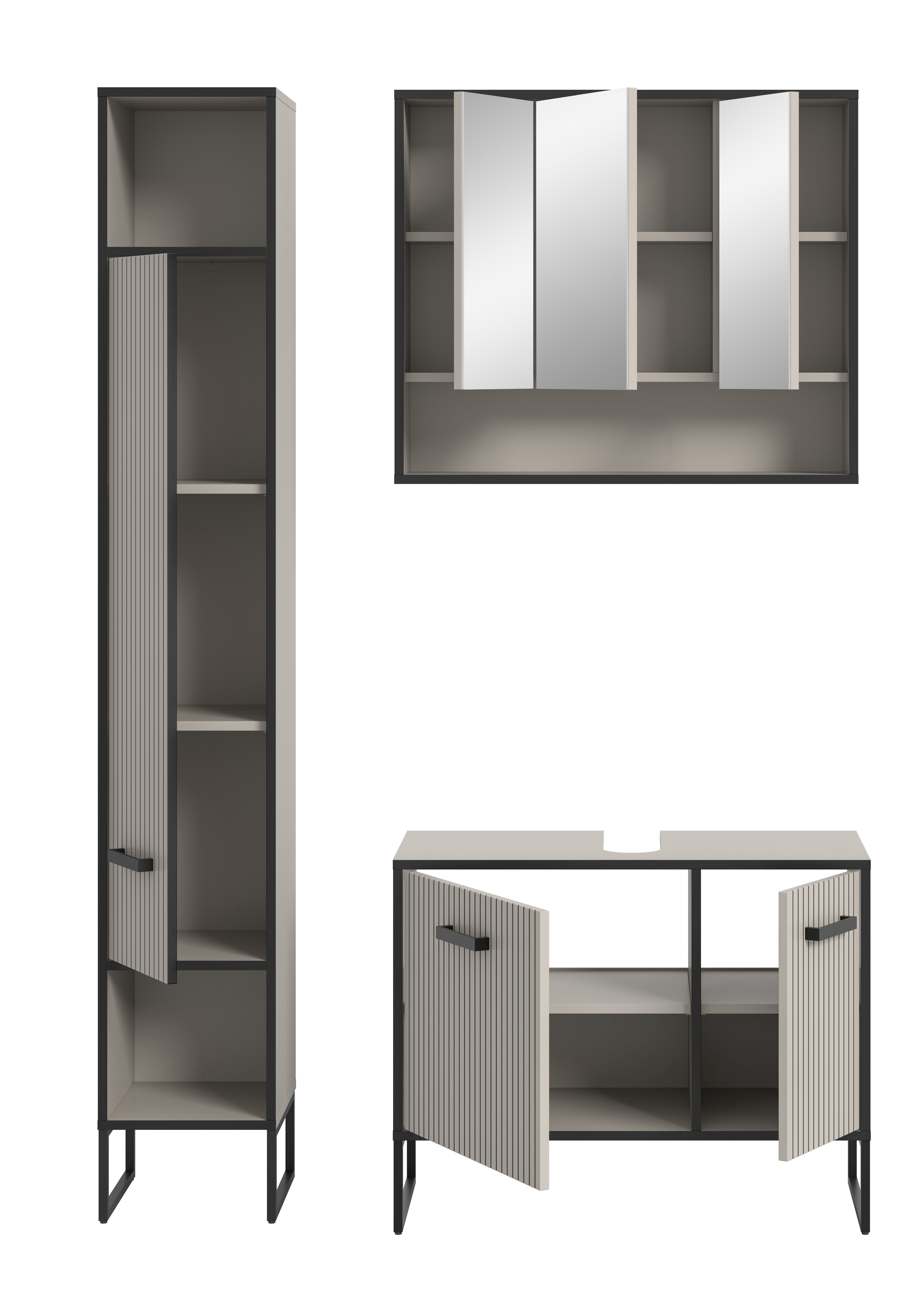 - 3-teilige Badkombination, bestehend aus: 1x Hochschrank, Waschbeckenunterschrank, 1x Spiegelschrank