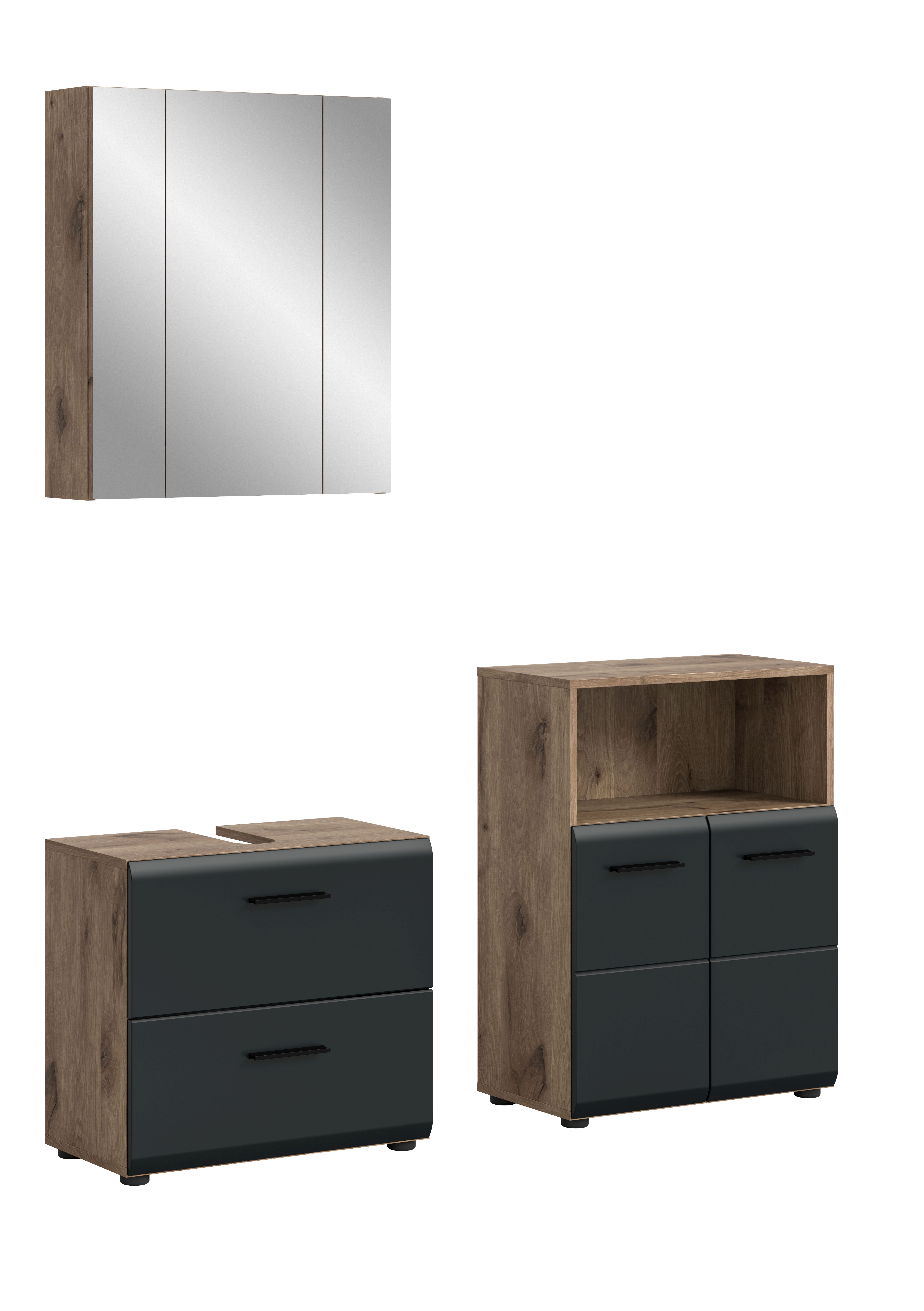 Entdecken Sie unsere elegante Badezimmer Badkombination in Schwarz matt und Nox Eiche Holznachbildung. Diese durchdachte Kombination aus verschiedenen Badmöbeln bietet nicht nur Stauraum für Ihre Badutensilien, sondern verleiht Ihrem Badezimmer auch einen modernen und aufgeräumten Look.