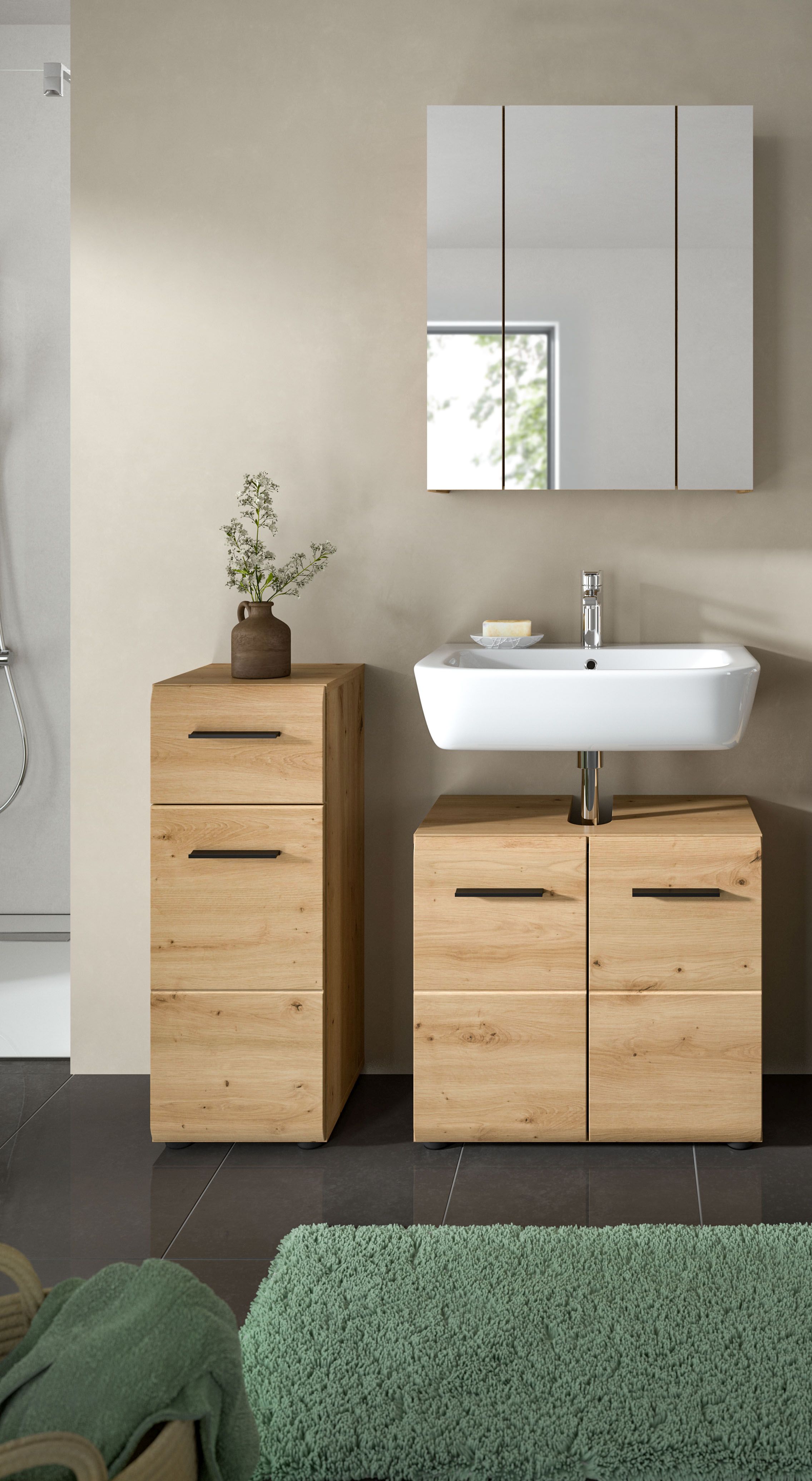 Entdecken Sie unsere elegante Badezimmer Badkombination in Artisan Eiche Holznachbildung. Diese durchdachte Kombination aus verschiedenen Badmöbeln bietet nicht nur Stauraum für Ihre Badutensilien, sondern verleiht Ihrem Badezimmer auch einen modernen und aufgeräumten Look.