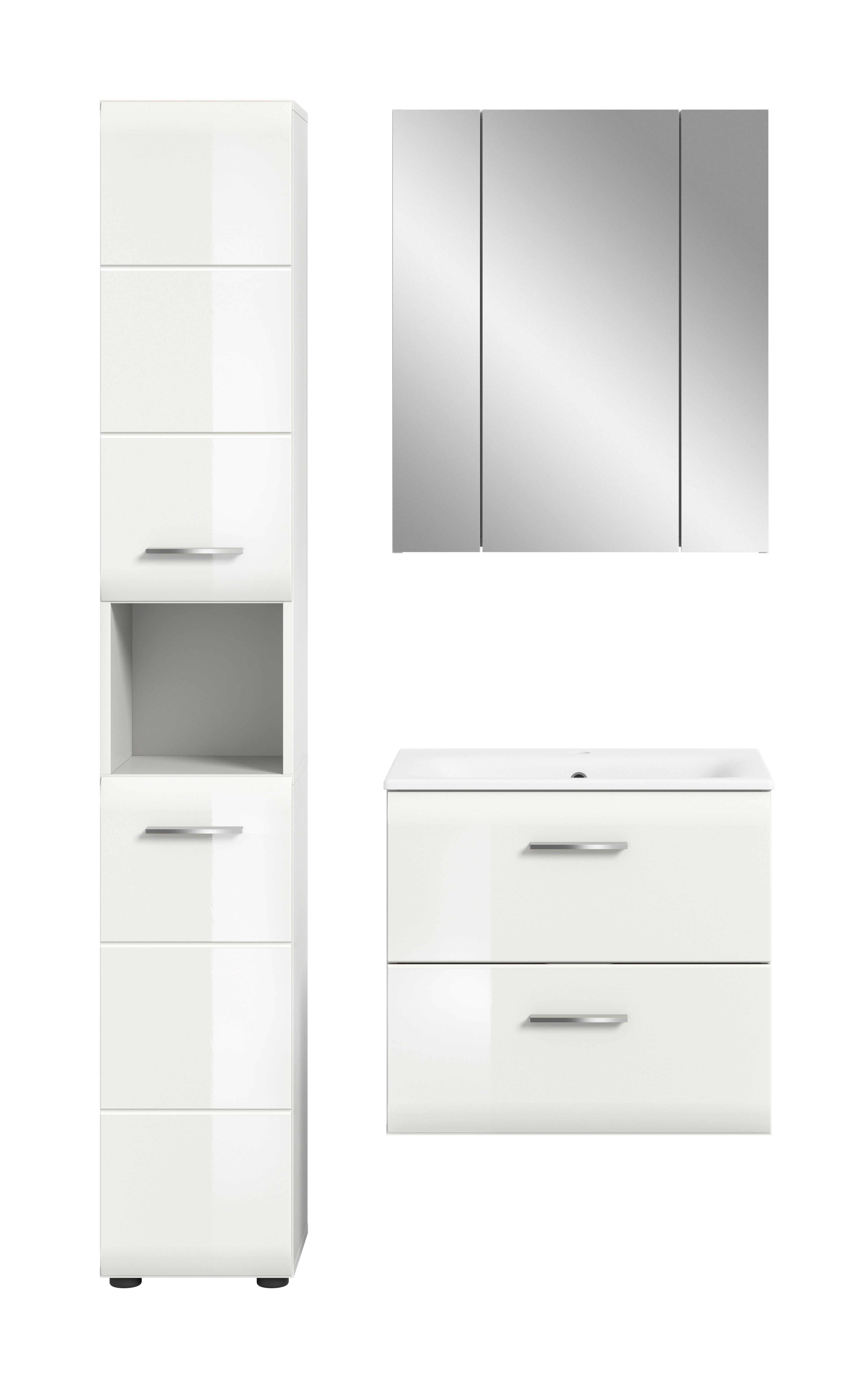 Verleihen Sie Ihrem Badezimmer mit unserer eleganten 3-teiligen Badkombination neuen Glanz! Diese durchdachte Kombination umfasst einen geräumigen Hochschrank, einen funktionalen Waschtisch inklusive Waschbecken und einen stilvollen Spiegelschrank, die Ihnen eine optimale Nutzung des verfügbaren Platzes ermöglichen. Mit den Abmessungen von 105 x 185 x 46 cm und einem Typenabstand von 15 cm bietet diese Badkombination ausreichend Stauraum für all Ihre Badutensilien. Die hochwertige MDF-Front mit moderner Rillenfräsung verleiht Ihrem Badezimmer nicht nur eine zeitgemäße Ästhetik, sondern sorgt auch für Langlebigkeit und einfache Pflege. Jedes Element ist darauf ausgelegt, sowohl Funktionalität als auch Stil zu gewährleisten. Ein sauberer und aufgeräumter Look, kombiniert mit einem modernen Design, macht diese Badkombination zur idealen Wahl für jedes Badezimmer. Genießen Sie die perfekte Symbiose aus platzsparenden Lösungen und ansprechendem Design – machen Sie Ihr Badezimmer zu einem Ort der Entspannung und des Wohlbefindens!