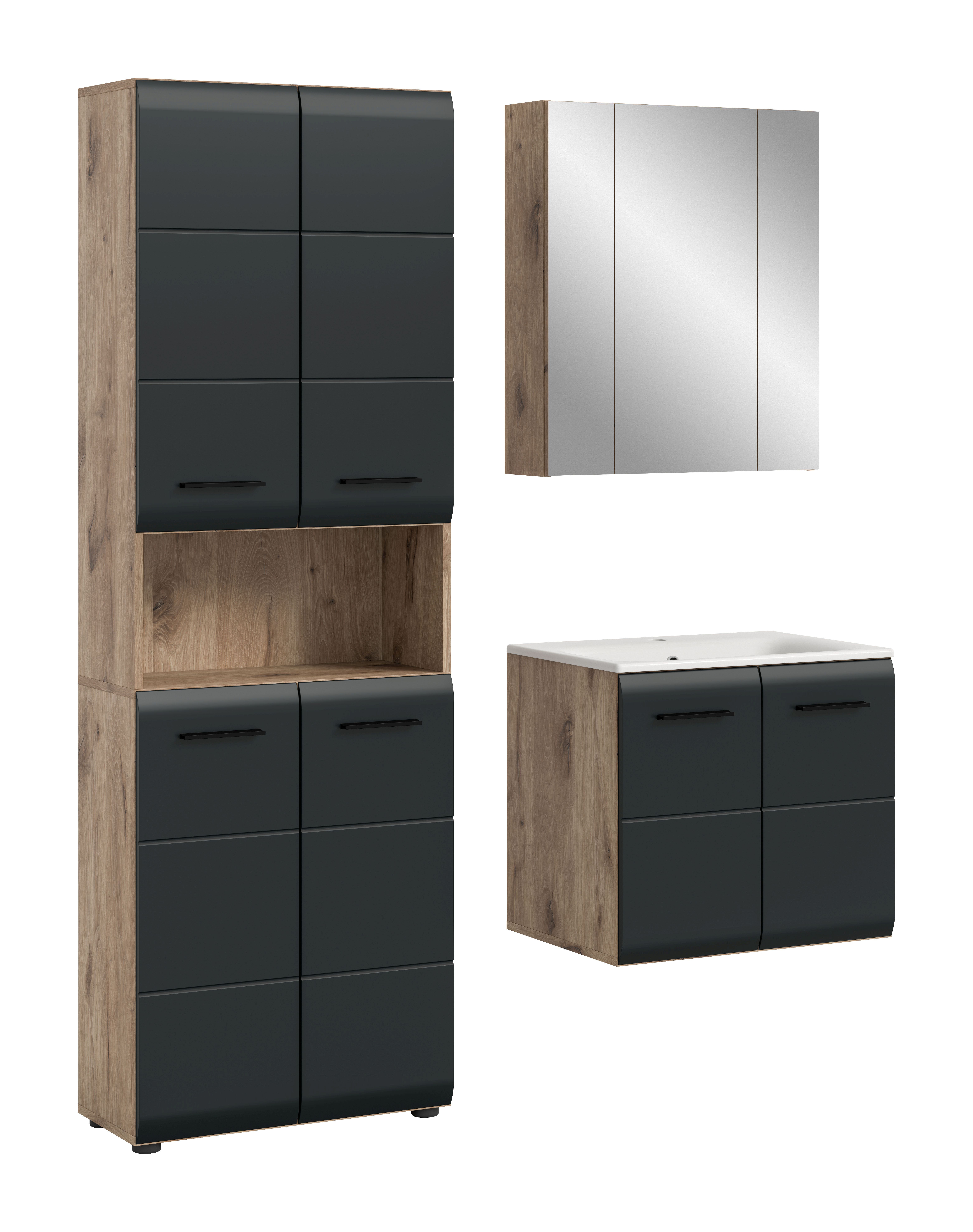 Verleihen Sie Ihrem Badezimmer mit unserer eleganten 3-teiligen Badkombination neuen Glanz! Diese durchdachte Kombination umfasst einen geräumigen Hochschrank, einen funktionalen Waschtisch inklusive Waschbecken und einen stilvollen Spiegelschrank, die Ihnen eine optimale Nutzung des verfügbaren Platzes ermöglichen. Mit den Abmessungen von 135 x 185 x 46 cm und einem Typenabstand von 15 cm bietet diese Badkombination ausreichend Stauraum für all Ihre Badutensilien. Die hochwertige MDF-Front mit moderner Rillenfräsung verleiht Ihrem Badezimmer nicht nur eine zeitgemäße Ästhetik, sondern sorgt auch für Langlebigkeit und einfache Pflege. Jedes Element ist darauf ausgelegt, sowohl Funktionalität als auch Stil zu gewährleisten. Ein sauberer und aufgeräumter Look, kombiniert mit einem modernen Design, macht diese Badkombination zur idealen Wahl für jedes Badezimmer. Genießen Sie die perfekte Symbiose aus platzsparenden Lösungen und ansprechendem Design – machen Sie Ihr Badezimmer zu einem Ort der Entspannung und des Wohlbefindens!