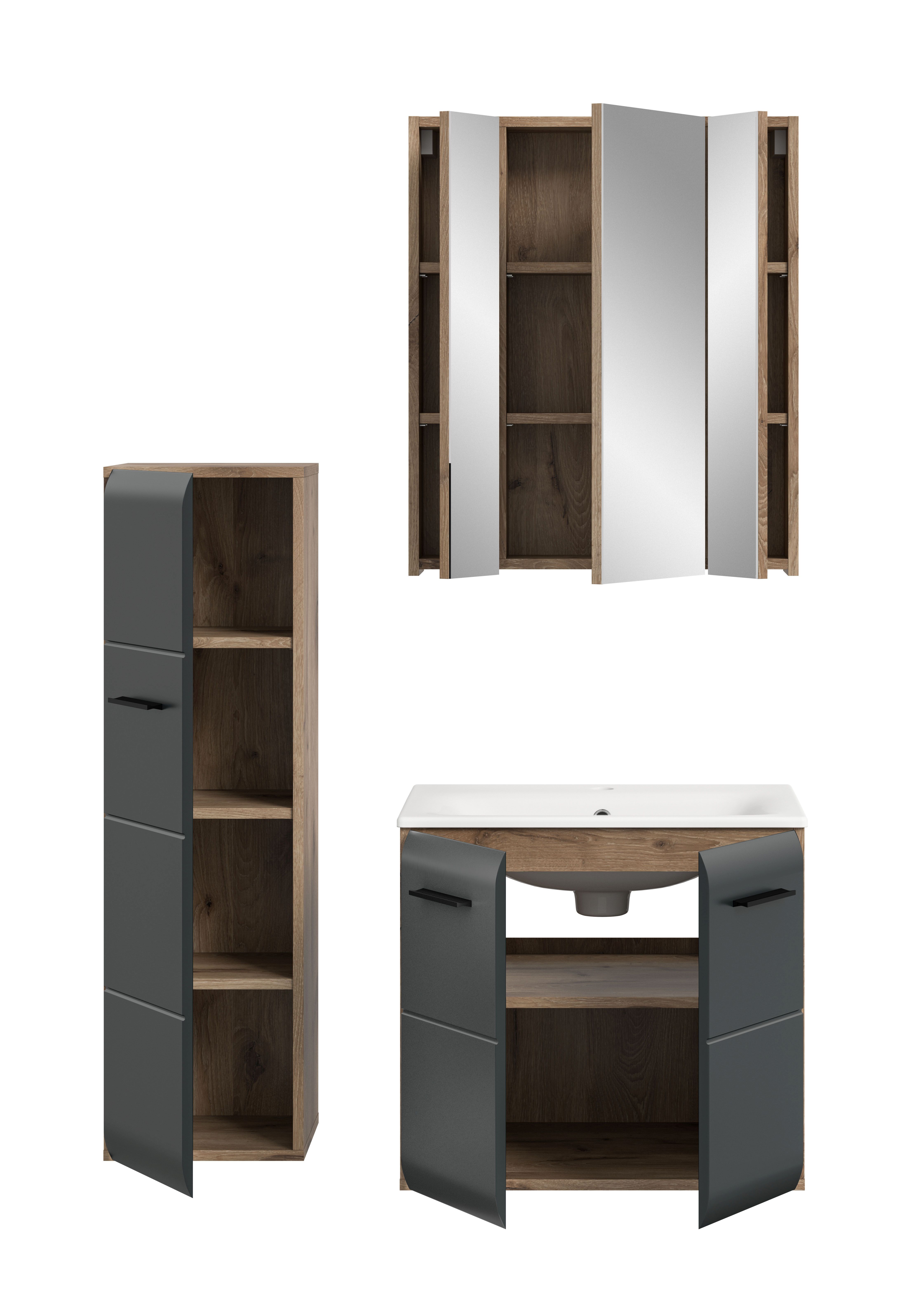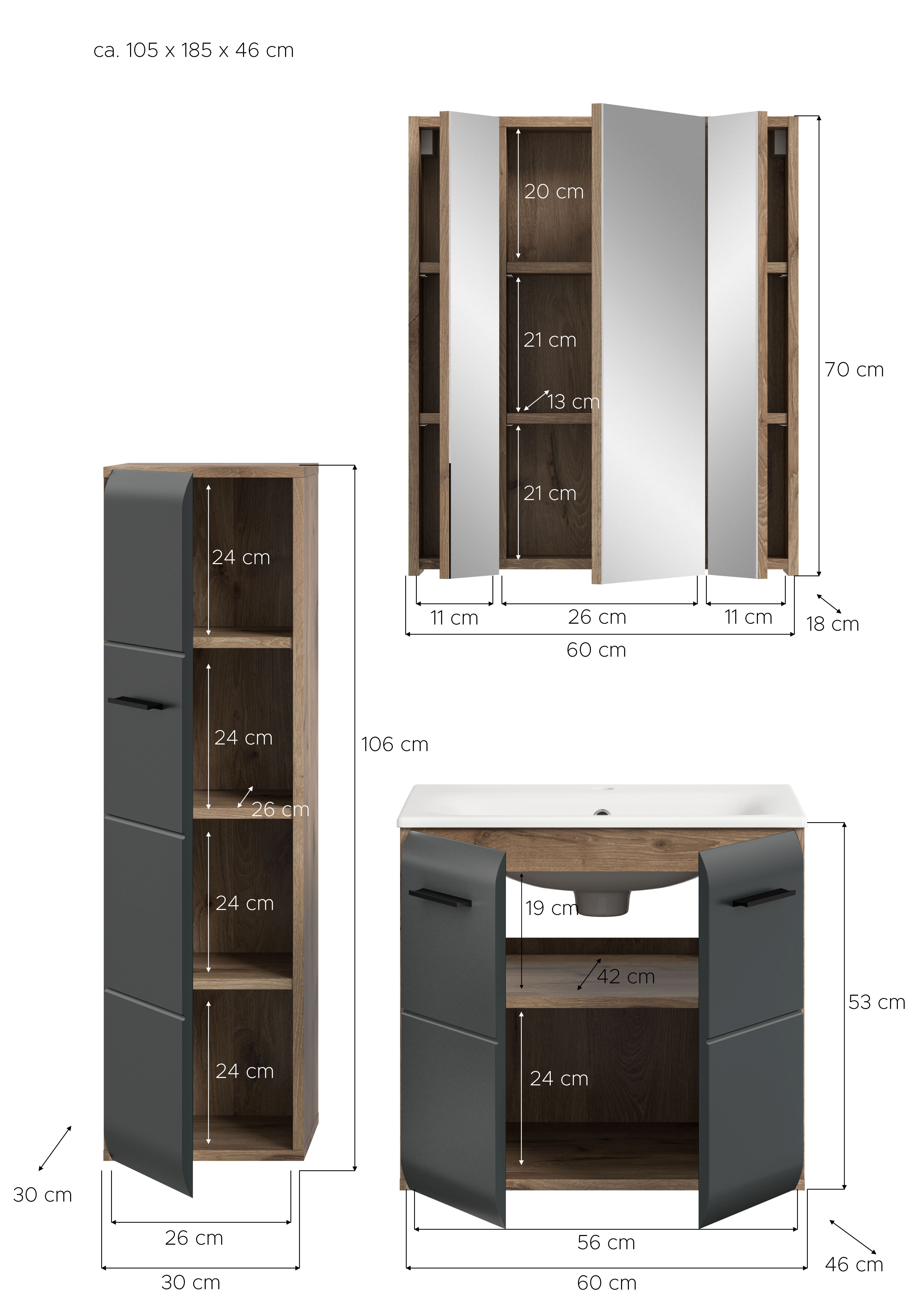 - 3-teilige Badkombination beteht aus 1x Stauraumtype, 1x Waschtisch inkl. Waschbecken, 1x Spiegelschrank