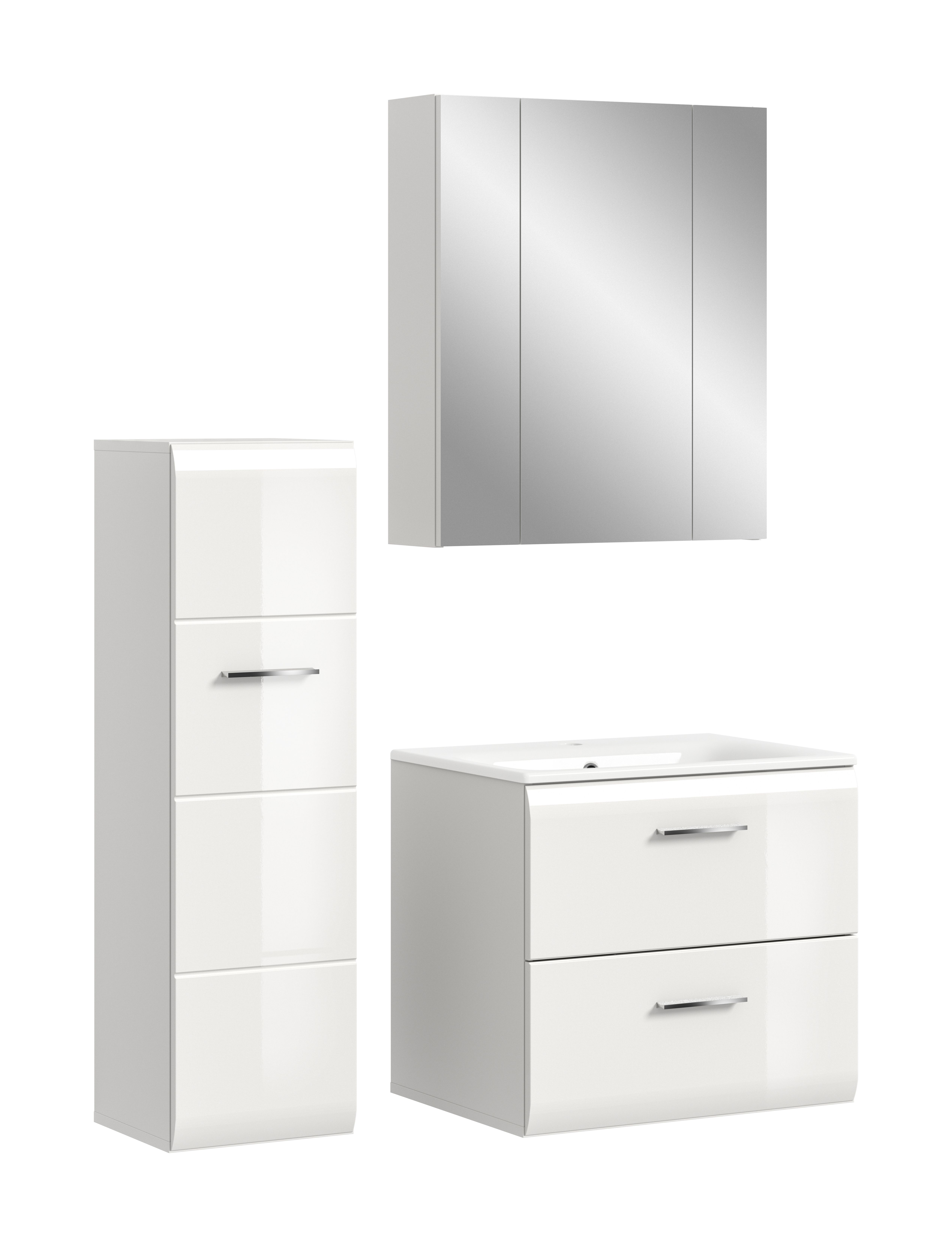- 3-teilige Badkombination beteht aus 1x Stauraumtype, 1x Waschtisch inkl. Waschbecken, 1x Spiegelschrank