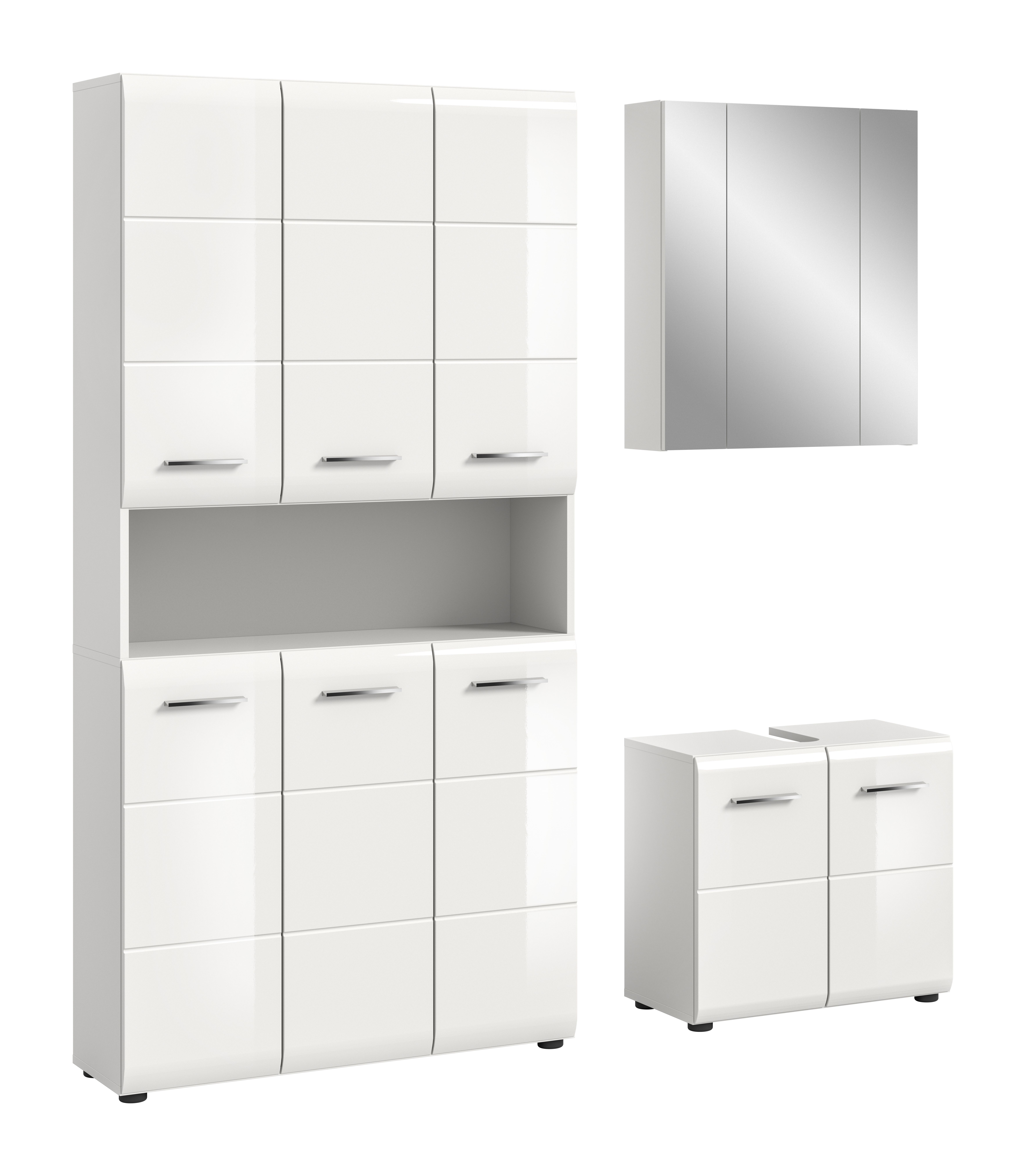 - 3-teilige Badkombination beteht aus 1x Stauraumschrank, 1x WBU, 1x Spiegelschrank