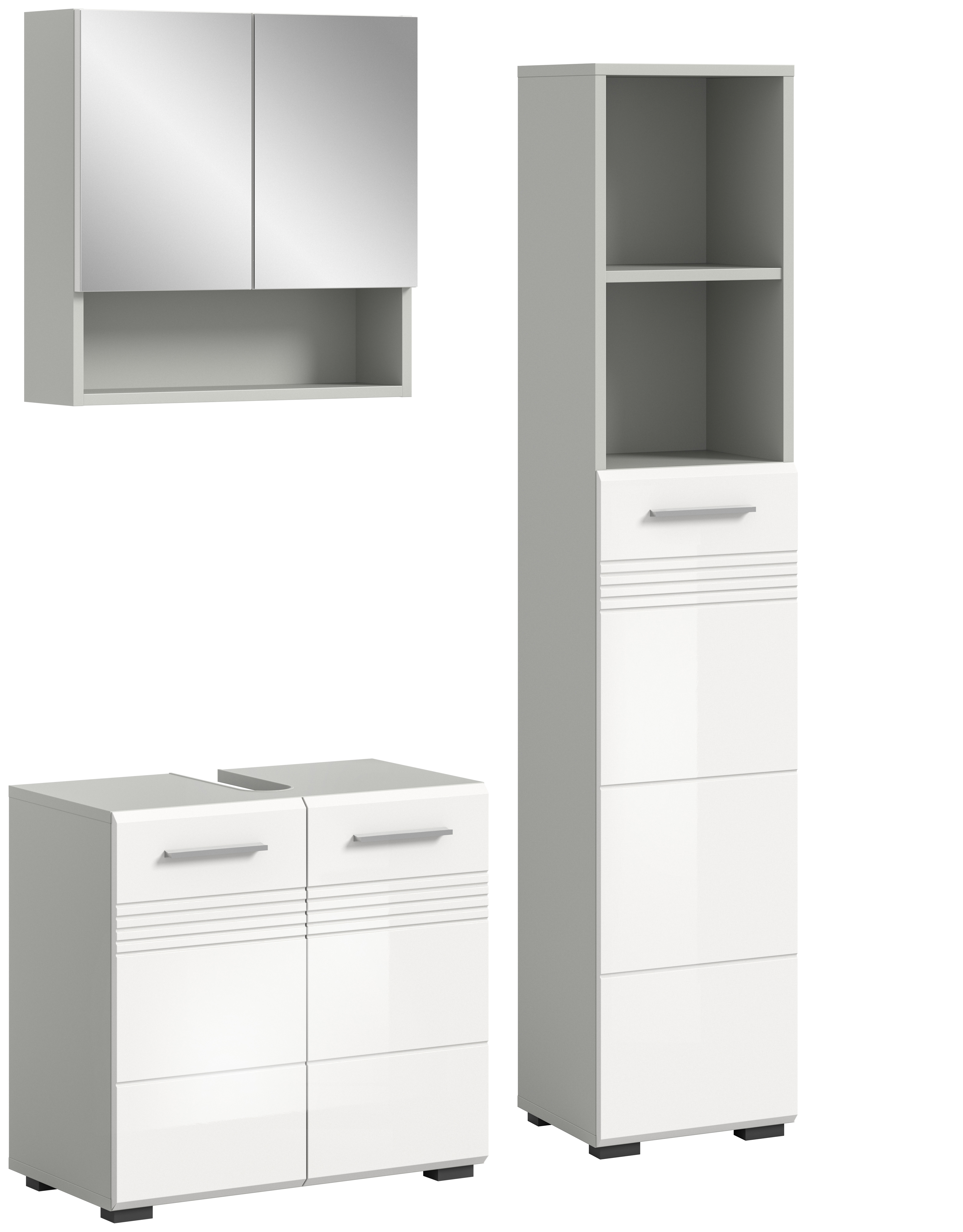 Entdecken Sie unsere moderne Badkombination in eleganter Hellgrau Nachbildung und strahlendem weißem Hochglanz, tiefgezogen für ein glänzendes Finish. Diese Kombination vereint Funktionalität und Stil und bietet mit ihrem zeitgemäßen Design eine perfekte Lösung für Ihr Badezimmer. Mit hochwertiger Verarbeitung und praktischem Stauraum ist sie die ideale Wahl für eine stilvolle und organisierte Badezimmereinrichtung.