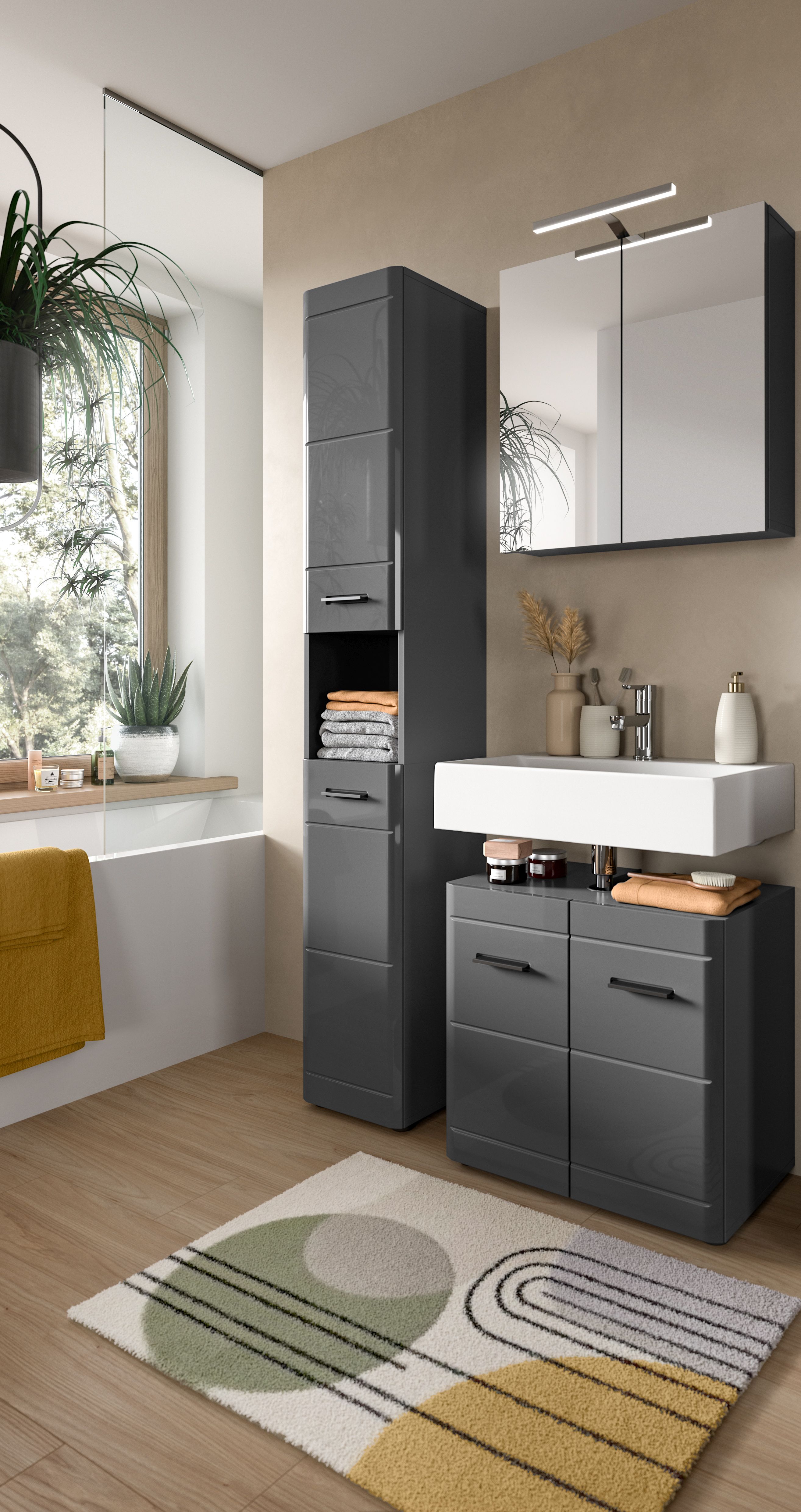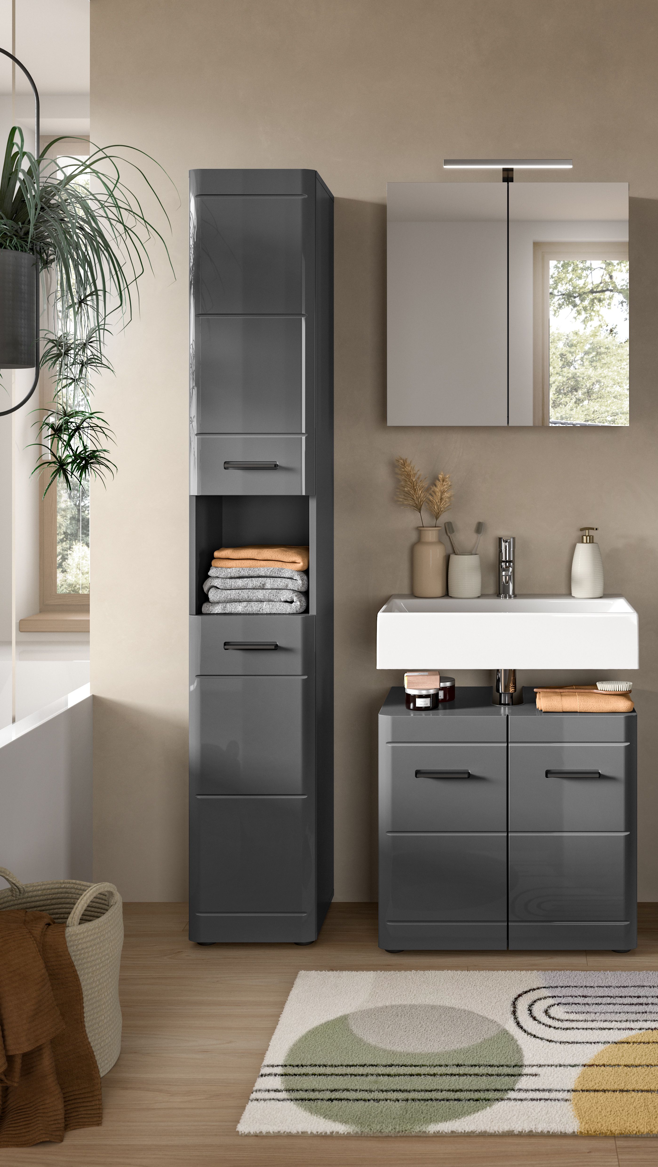 - Design/Stil: Die Badkombination in grauer Nachbildung mit grauem Hochglanz tiefzieh präsentiert sich mit einem modernen und eleganten Design, das durch seine glänzende Oberfläche und klare Linien eine zeitgemäße Ästhetik im Badezimmer schafft, die gleichzeitig funktional und ansprechend ist.