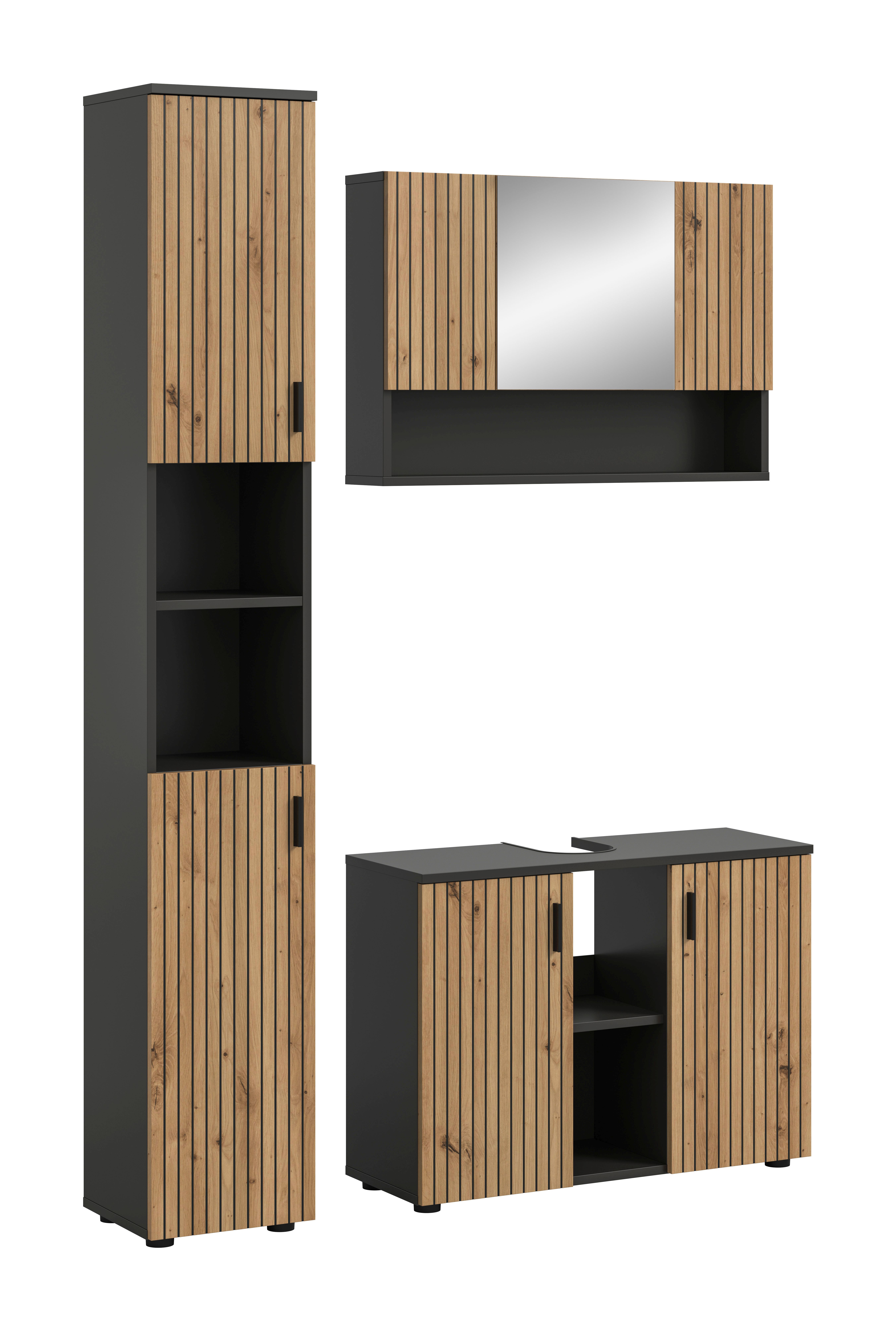 Diese 3-teilige Badkombination in Basalt und Artisan Oak Nachbildung (125 x 192 x 30 cm) bietet dir eine durchdachte Lösung für dein Badezimmer. Das Set besteht aus einem Badschrank, einem Waschbeckenunterschrank und einem Spiegelschrank, die perfekt aufeinander abgestimmt sind. Die pflegeleichte Front mit eingefräster Paneeloptik sorgt für eine moderne, elegante Optik und ist besonders einfach zu reinigen. Mit ausreichend Stauraum für Pflegeprodukte, Handtücher und mehr unterstützt diese Kombination eine aufgeräumte und funktionale Badgestaltung. Die hochwertigen Materialien garantieren Langlebigkeit und Stabilität. Zudem kannst du durch die vielfältigen Kombinationsmöglichkeiten der Serie dein Badezimmer individuell und flexibel gestalten. Dieses Set verbindet Design, Qualität und Funktionalität für dein Wohlfühlbad.