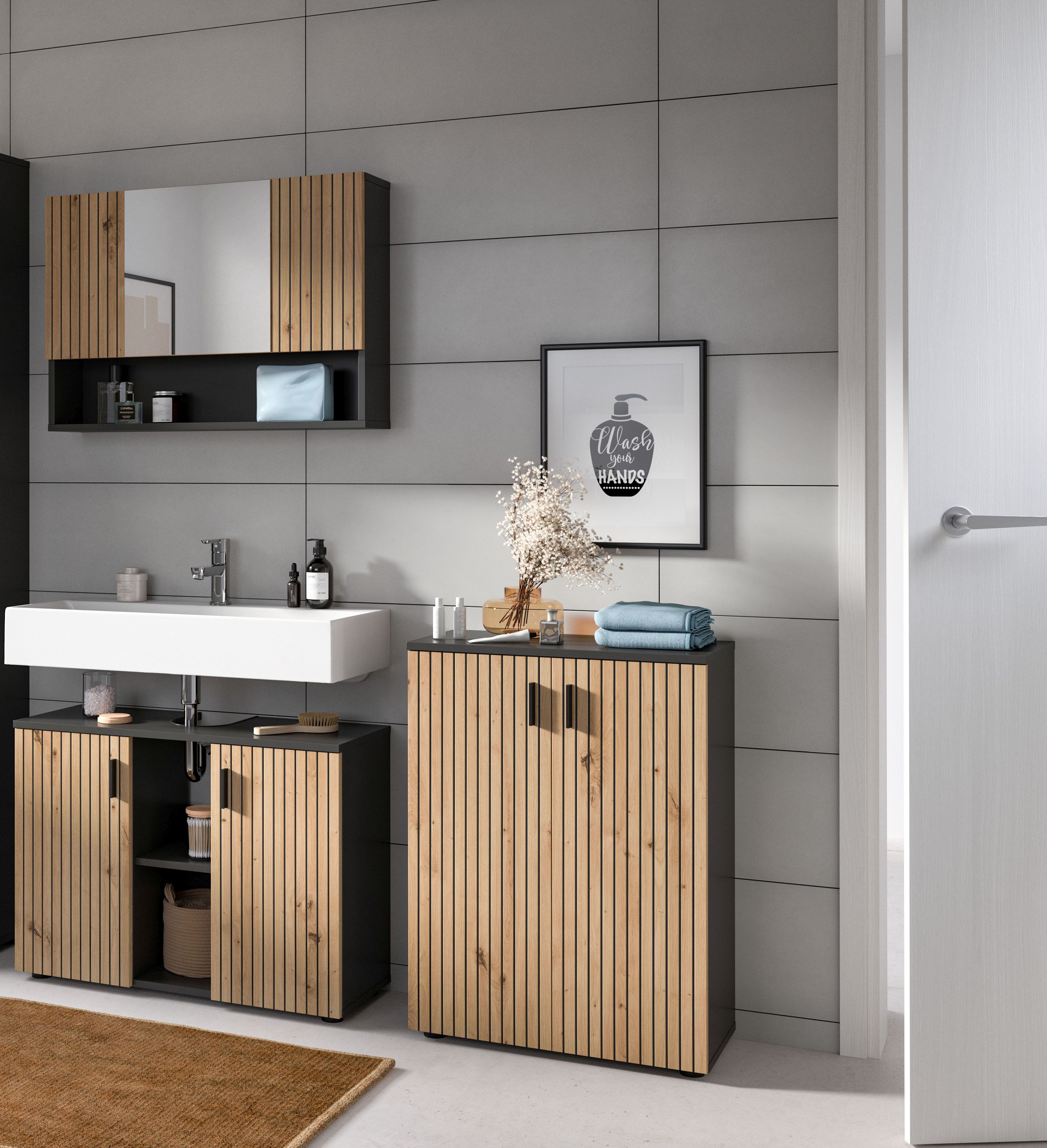 Das 3-teilige Badkombination Set in Basalt und Artisan Oak Nachbildung (155 x 180 x 30 cm) besteht aus einem Waschbeckenunterschrank, einem Spiegelschrank und einem Badschrank. Die pflegeleichte Front mit eingefräster Paneeloptik verleiht deinem Bad eine stilvolle und moderne Optik. Die Möbel sind hochwertig verarbeitet und bieten viel Stauraum für deine Badutensilien. Die Kombination ist ideal für Bäder, die Wert auf Ordnung und Design legen. Durch die verschiedenen Möbeltypen der Serie kannst du dein Bad flexibel und individuell gestalten. Die pflegeleichte Oberfläche erleichtert die Reinigung und sorgt für langanhaltende Schönheit. Mit diesem Set schaffst du eine harmonische Verbindung aus Funktionalität und Ästhetik.