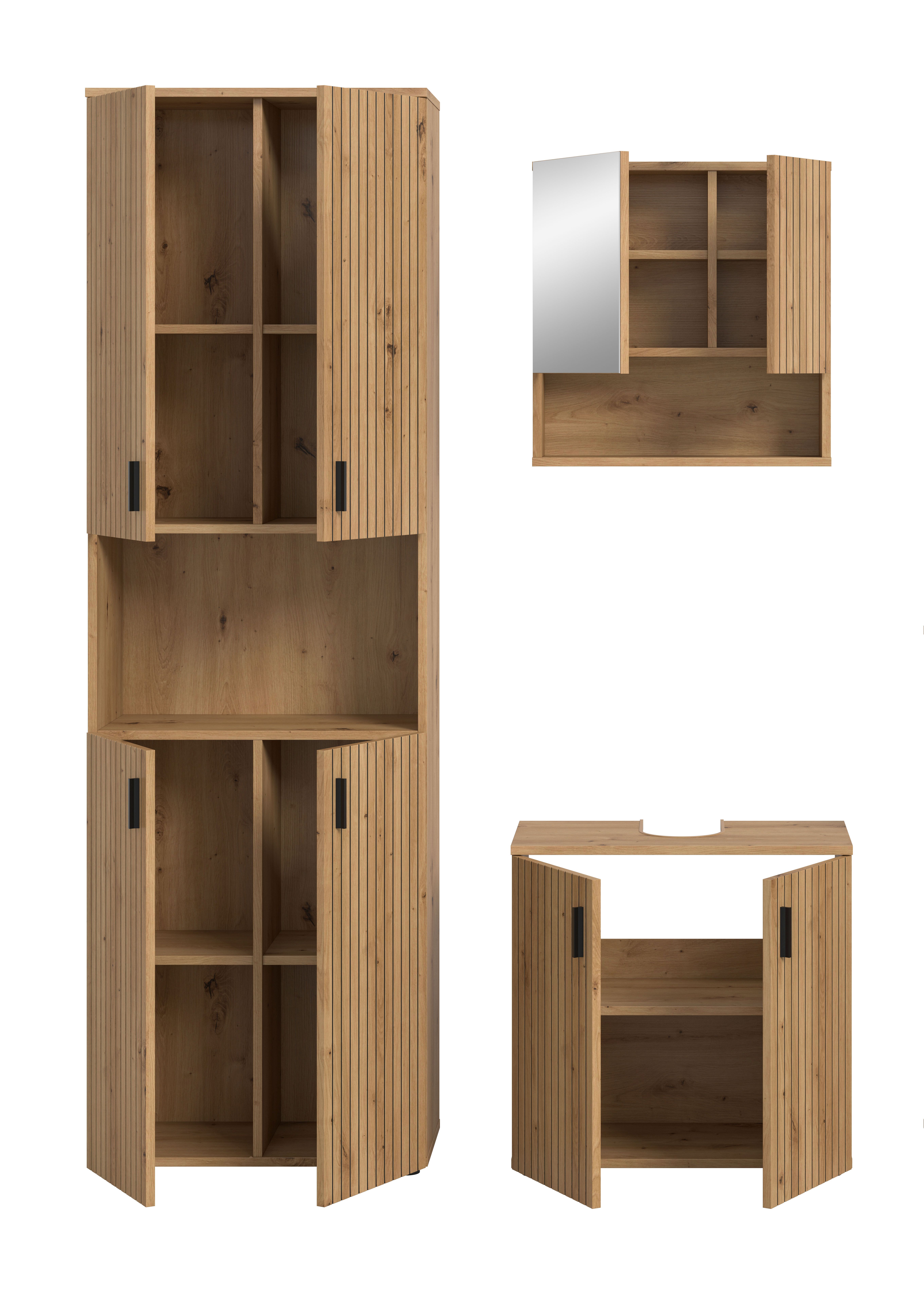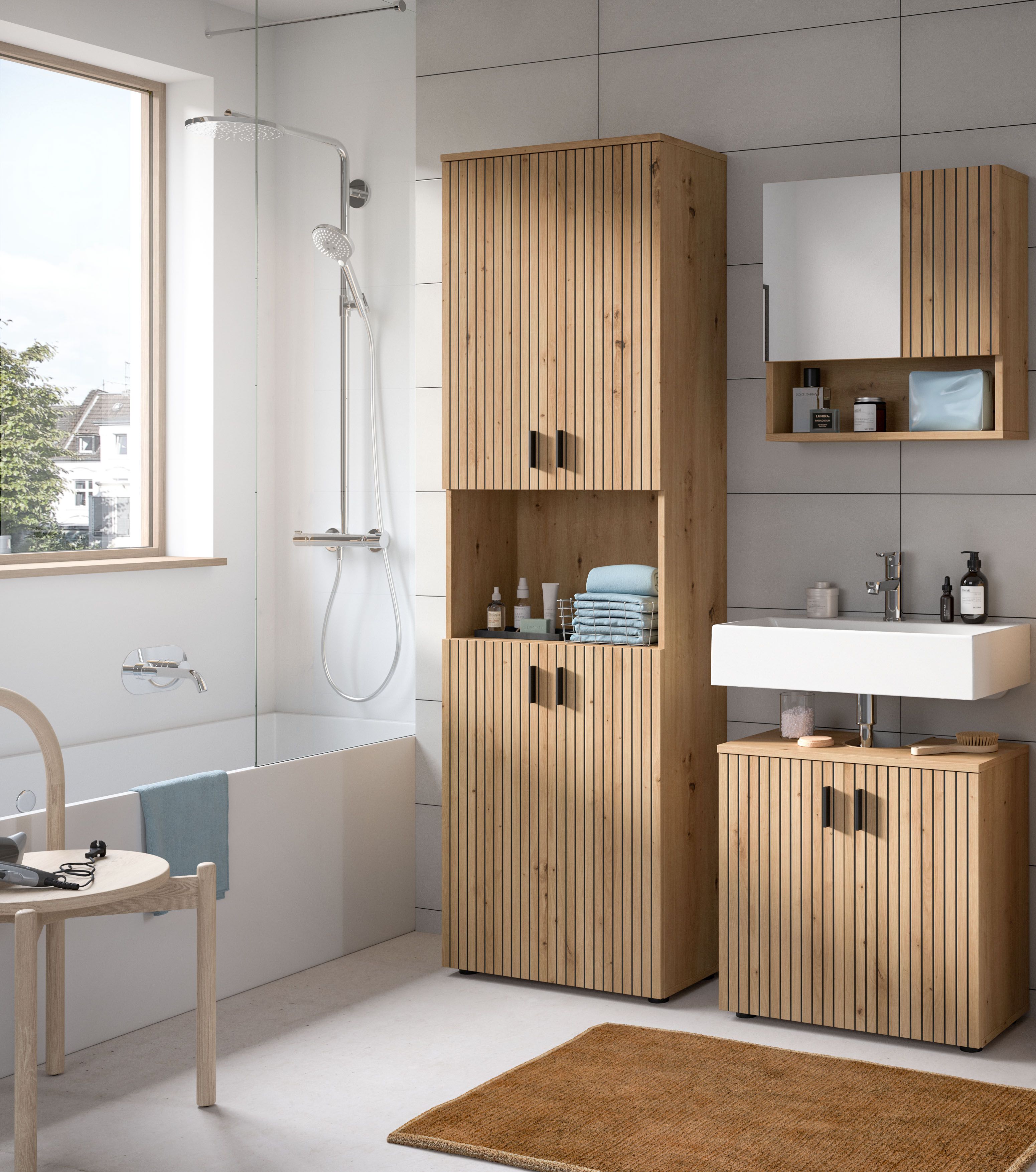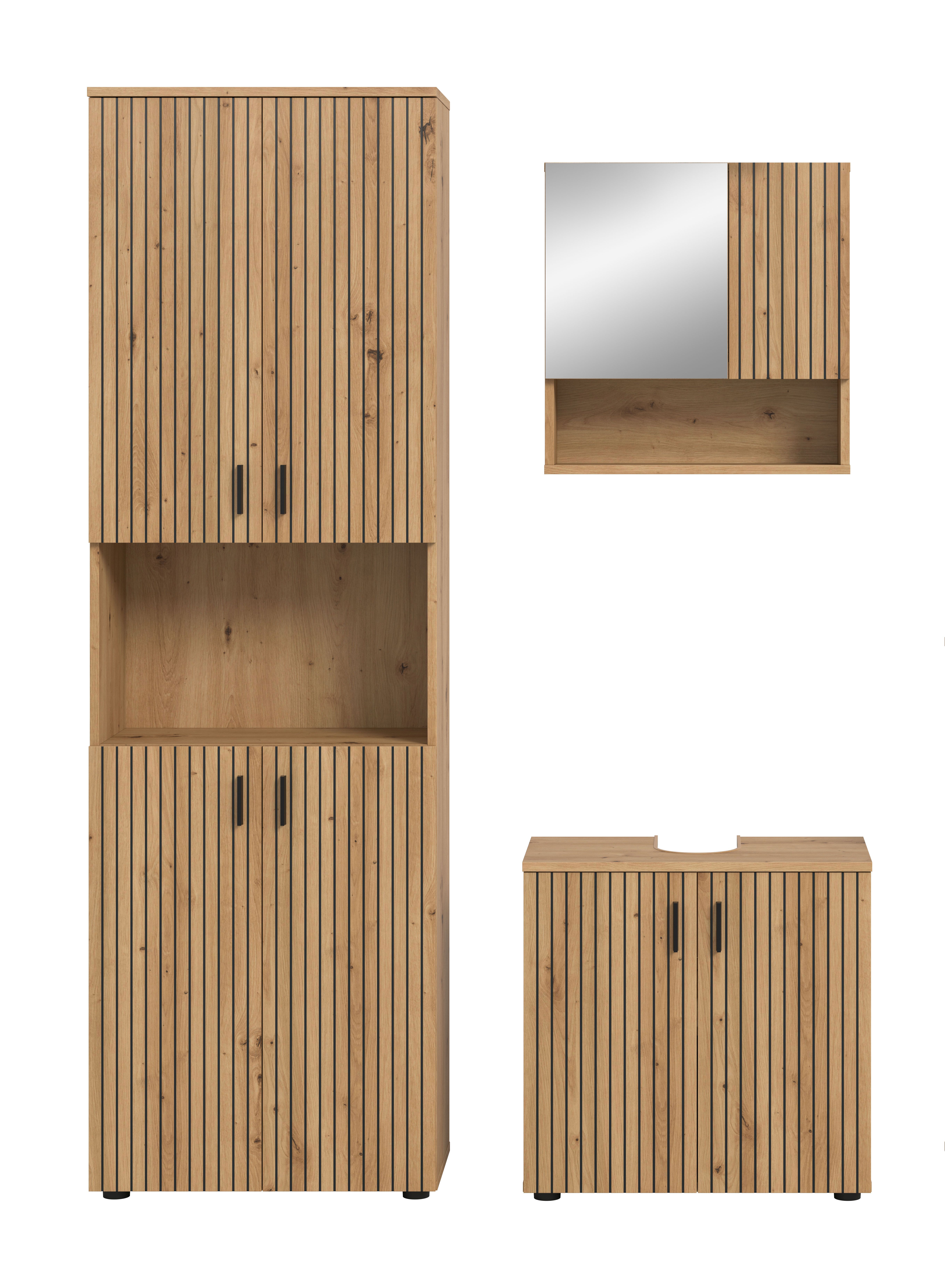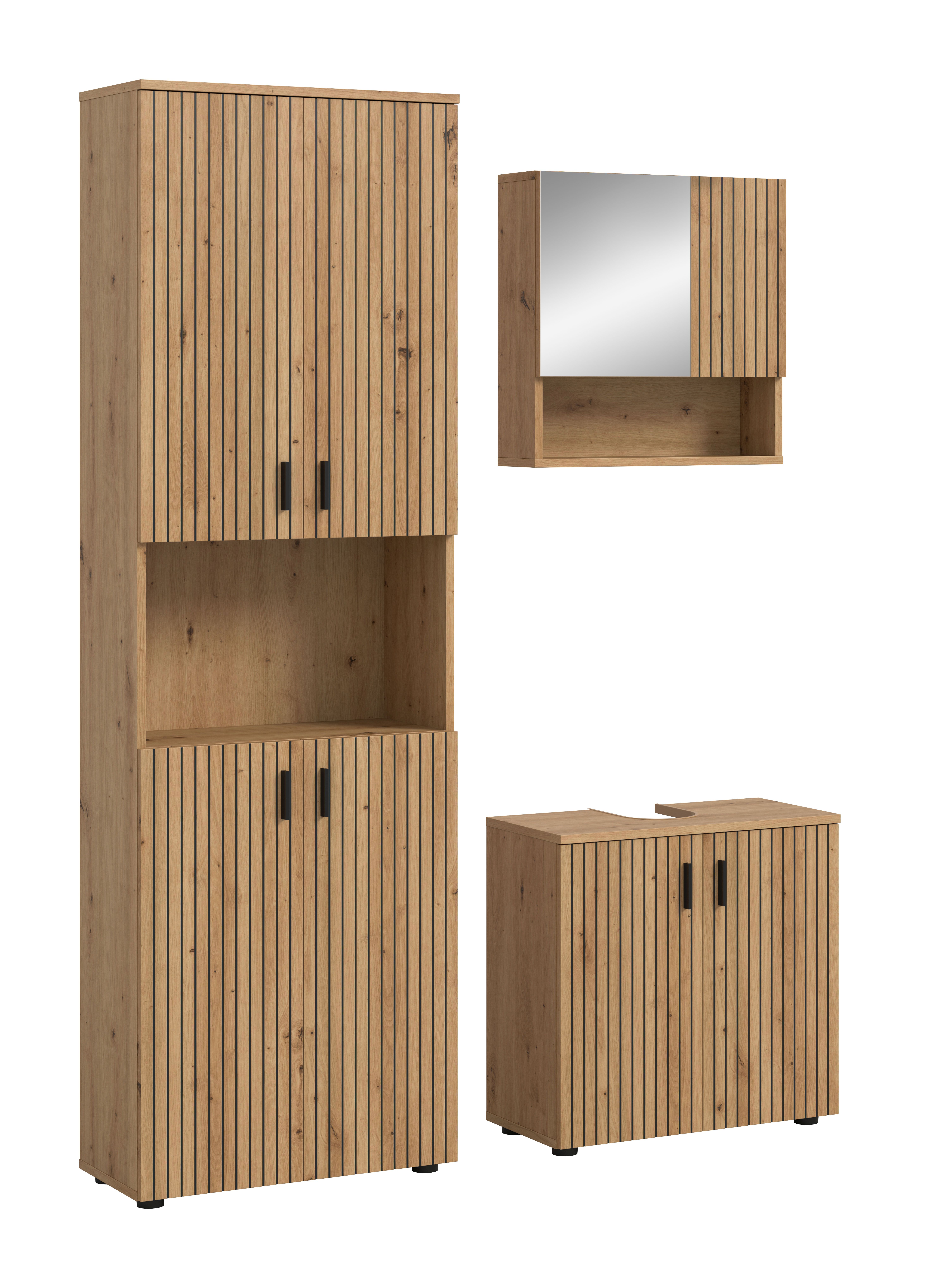 Diese 3-teilige Badkombination in Artisan Oak Nachbildung (135 x 192 x 30 cm) besteht aus einem Badschrank, einem Waschbeckenunterschrank und einem Spiegelschrank. Die pflegeleichte Front mit eingefräster Paneeloptik ist hochwertig verarbeitet und sorgt für eine natürliche, warme Optik. Das Set bietet dir ausreichend Stauraum und unterstützt eine aufgeräumte und funktionale Badgestaltung. Die Möbel sind robust und langlebig, sodass du lange Freude an deinem Bad hast. Durch die vielfältigen Kombinationsmöglichkeiten der Serie kannst du dein Bad individuell gestalten und flexibel erweitern. Dieses Set verbindet Design, Qualität und praktische Nutzung für dein Wohlfühlbad.