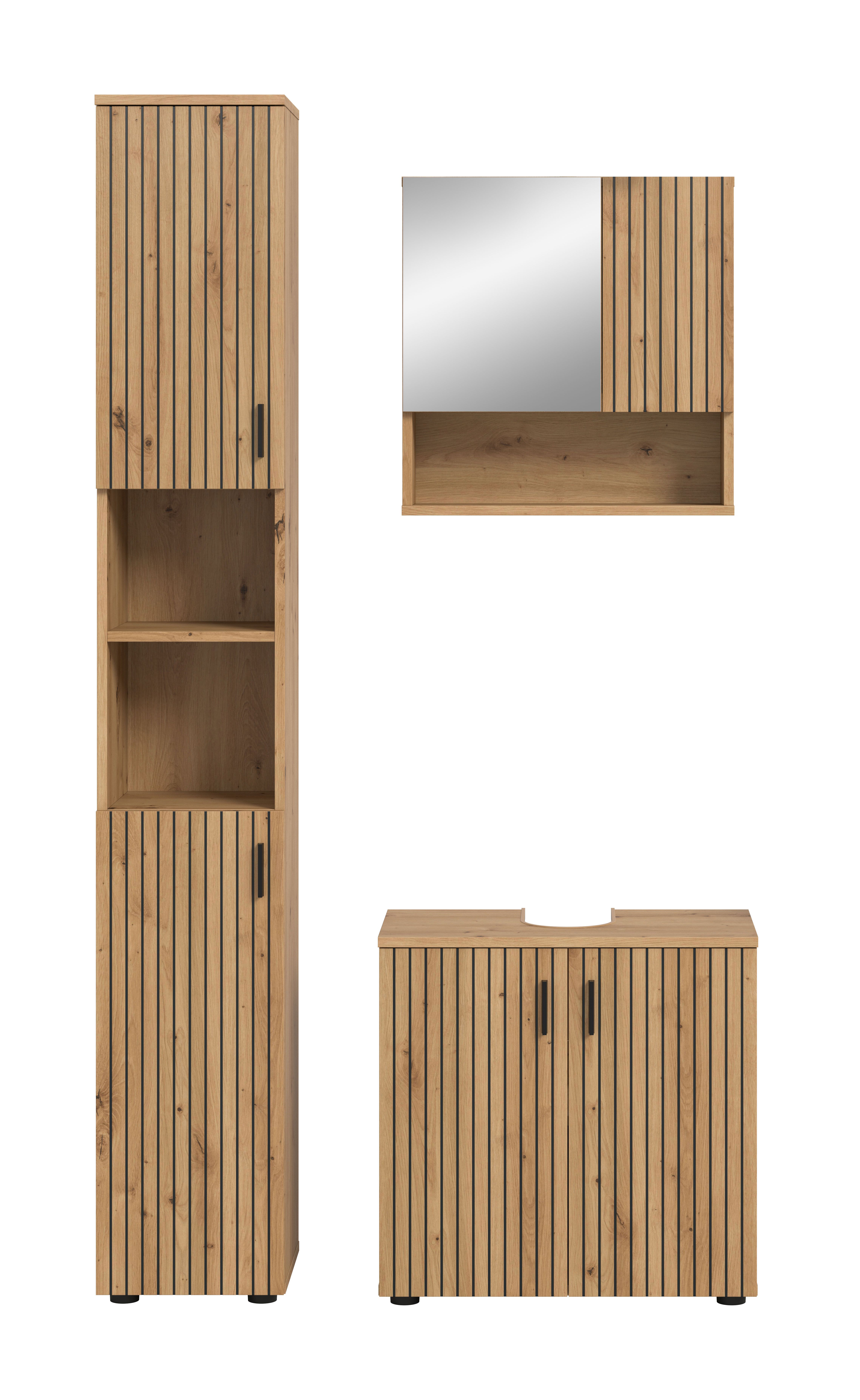 - 3-teiliges Set, bestehend aus: 1x Badschrank, 1x Waschbeckenunterschrank, 1x Spiegelschrank
