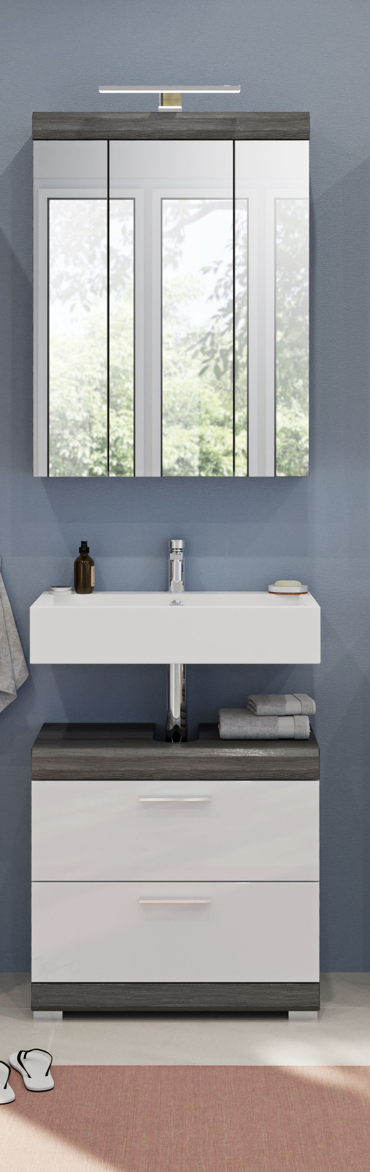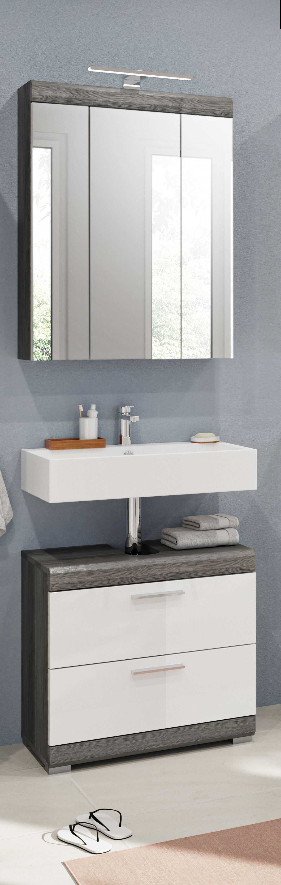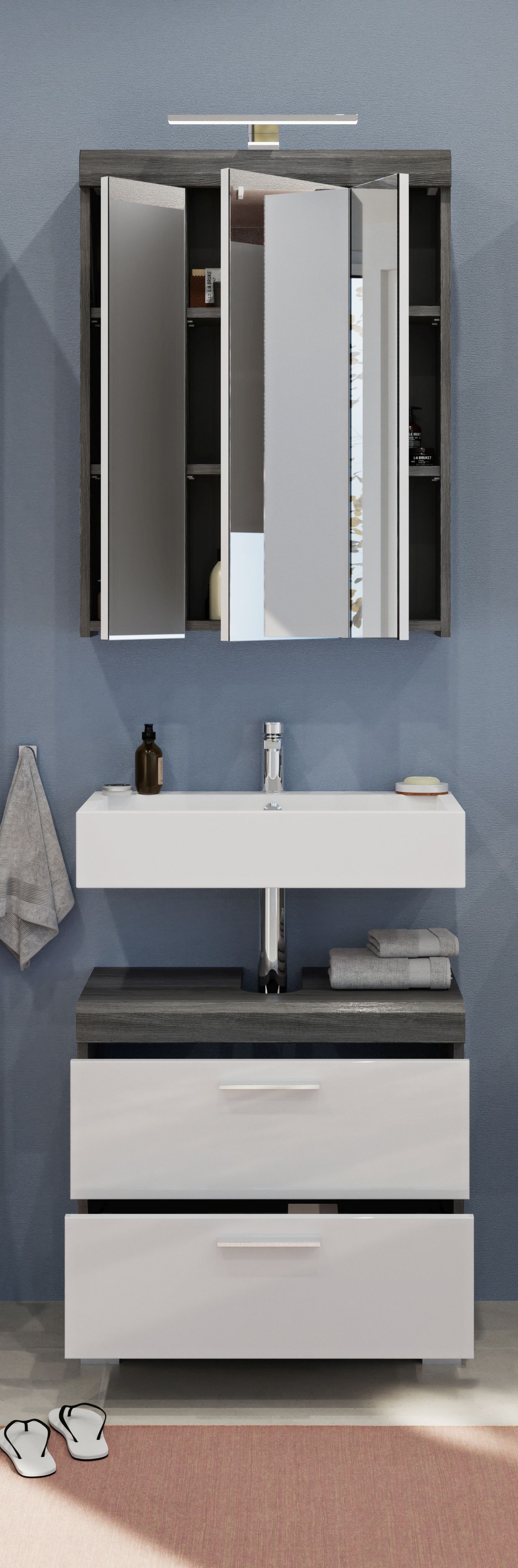Verleihe deinem Badezimmer den ultimativen Style mit unserer Badkombination in angesagtem Rauchsilber Nachbildung und weißem Hochglanz tiefgezogenem Finish. Mit ihrem trendigen Design und der hochwertigen Verarbeitung setzt sie ein modernes Statement in deinem Zuhause. Entdecke jetzt die perfekte Verbindung von Coolness und Funktionalität für dein Badezimmer!