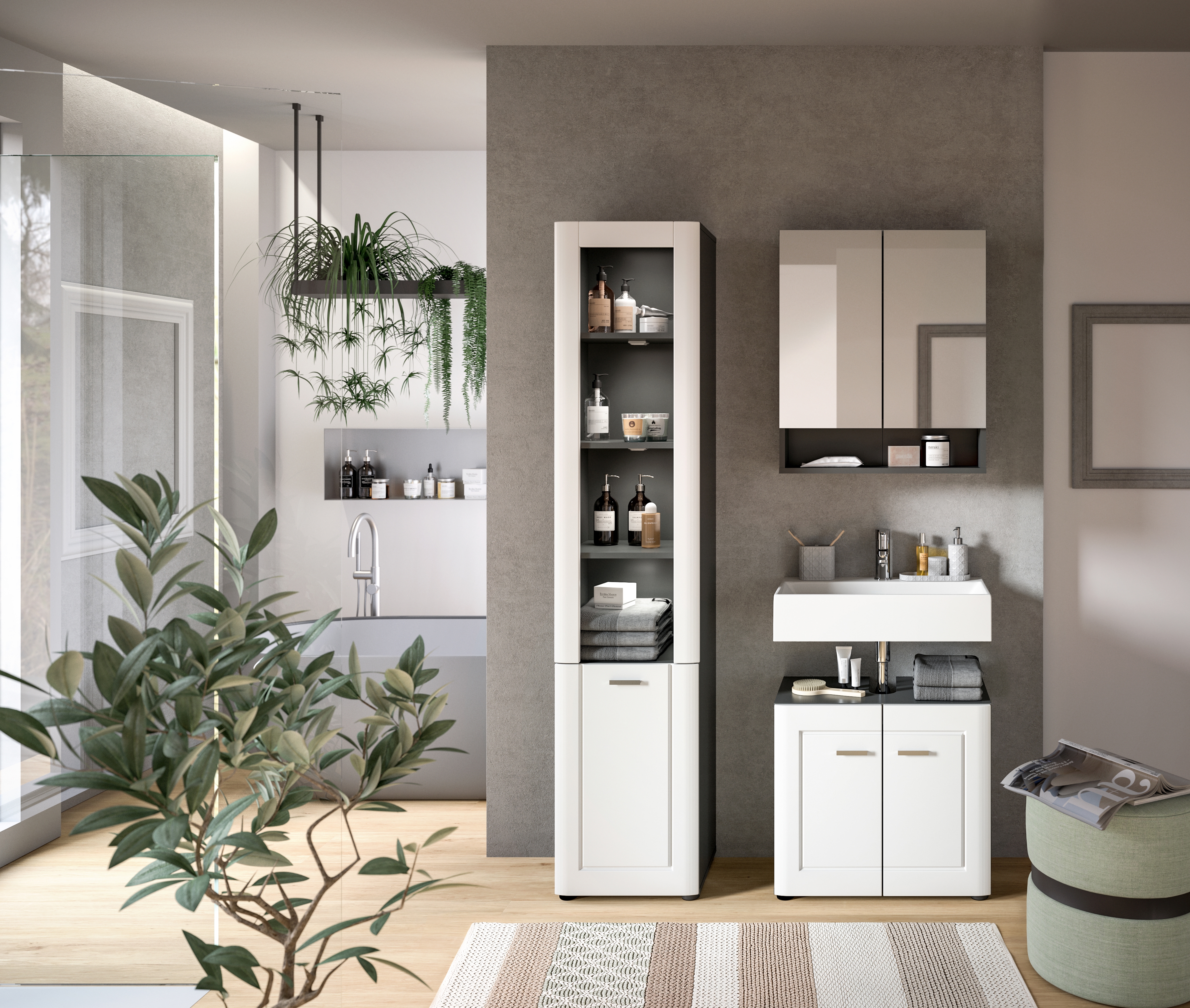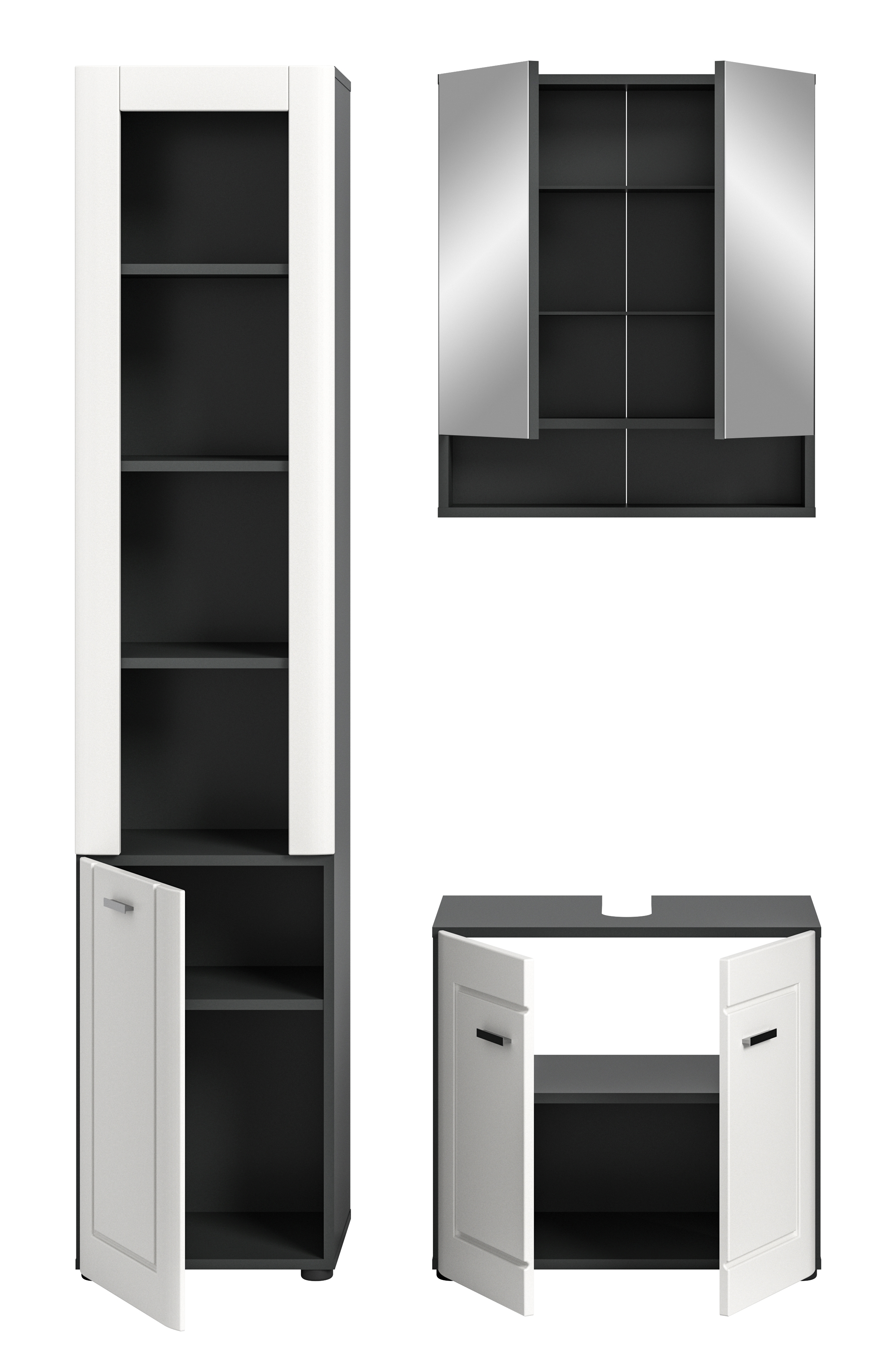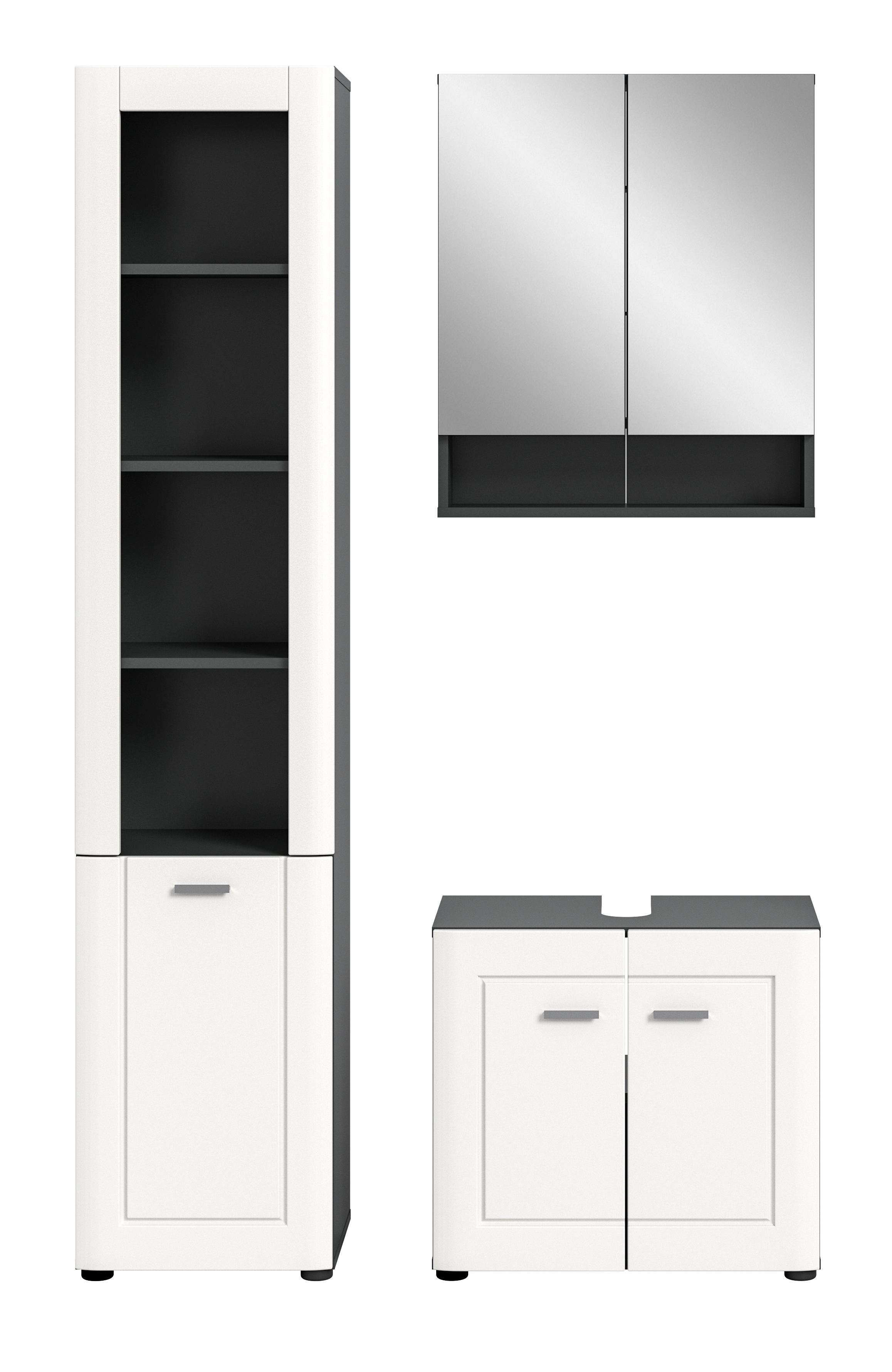 - Funktionalität: Umfassende Badkombination mit verschiedenen Elementen wie Waschbeckenunterschrank, Hochschrank und Spiegelschrank für eine optimale Nutzung des vorhandenen Raums und eine effiziente Aufbewahrung von Badutensilien und Reinigungsprodukten.