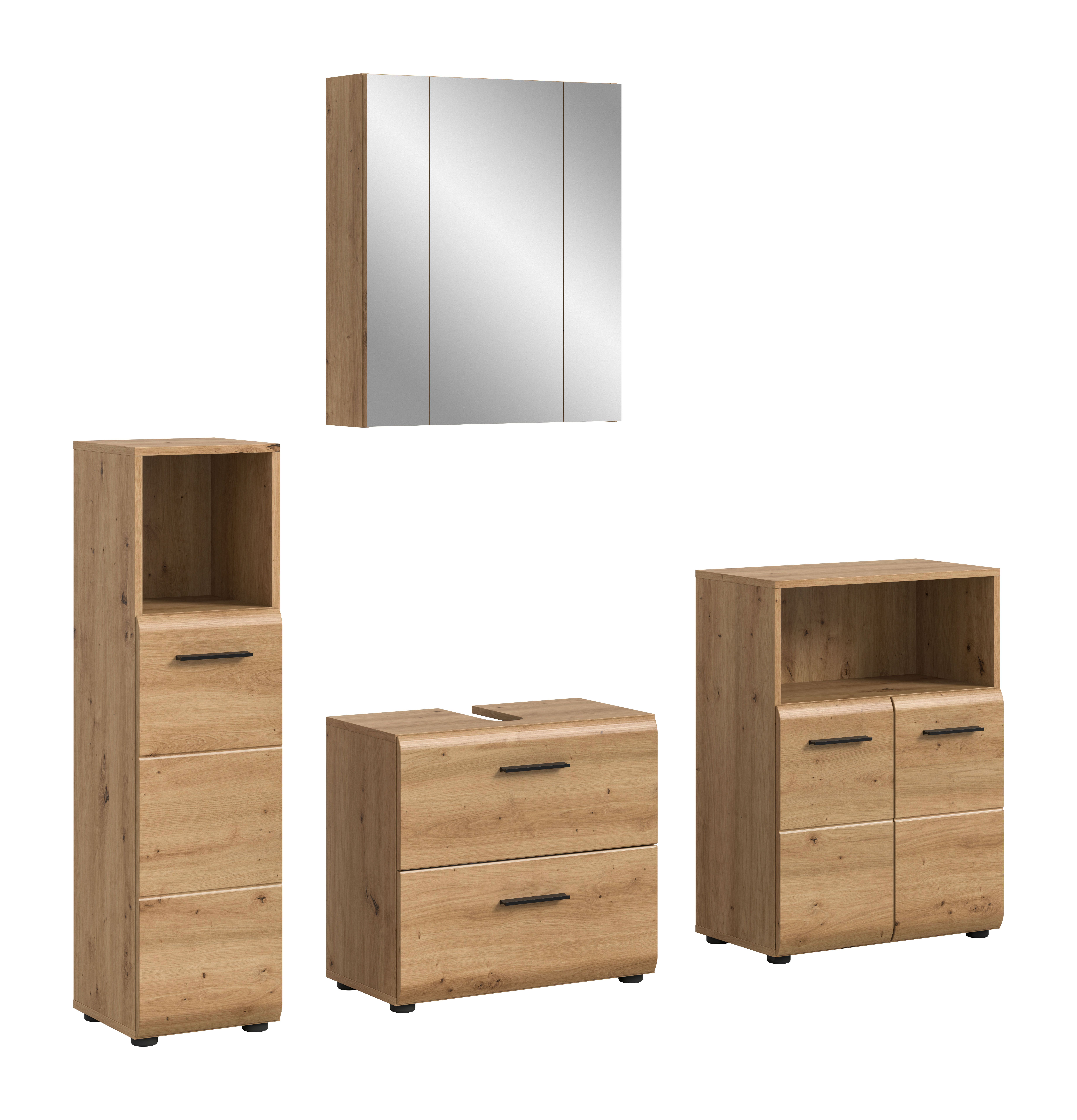 Entdecken Sie unsere elegante Badezimmer Badkombination in Artisan Eiche Holznachbildung. Diese durchdachte Kombination aus verschiedenen Badmöbeln bietet nicht nur Stauraum für Ihre Badutensilien, sondern verleiht Ihrem Badezimmer auch einen modernen und aufgeräumten Look.