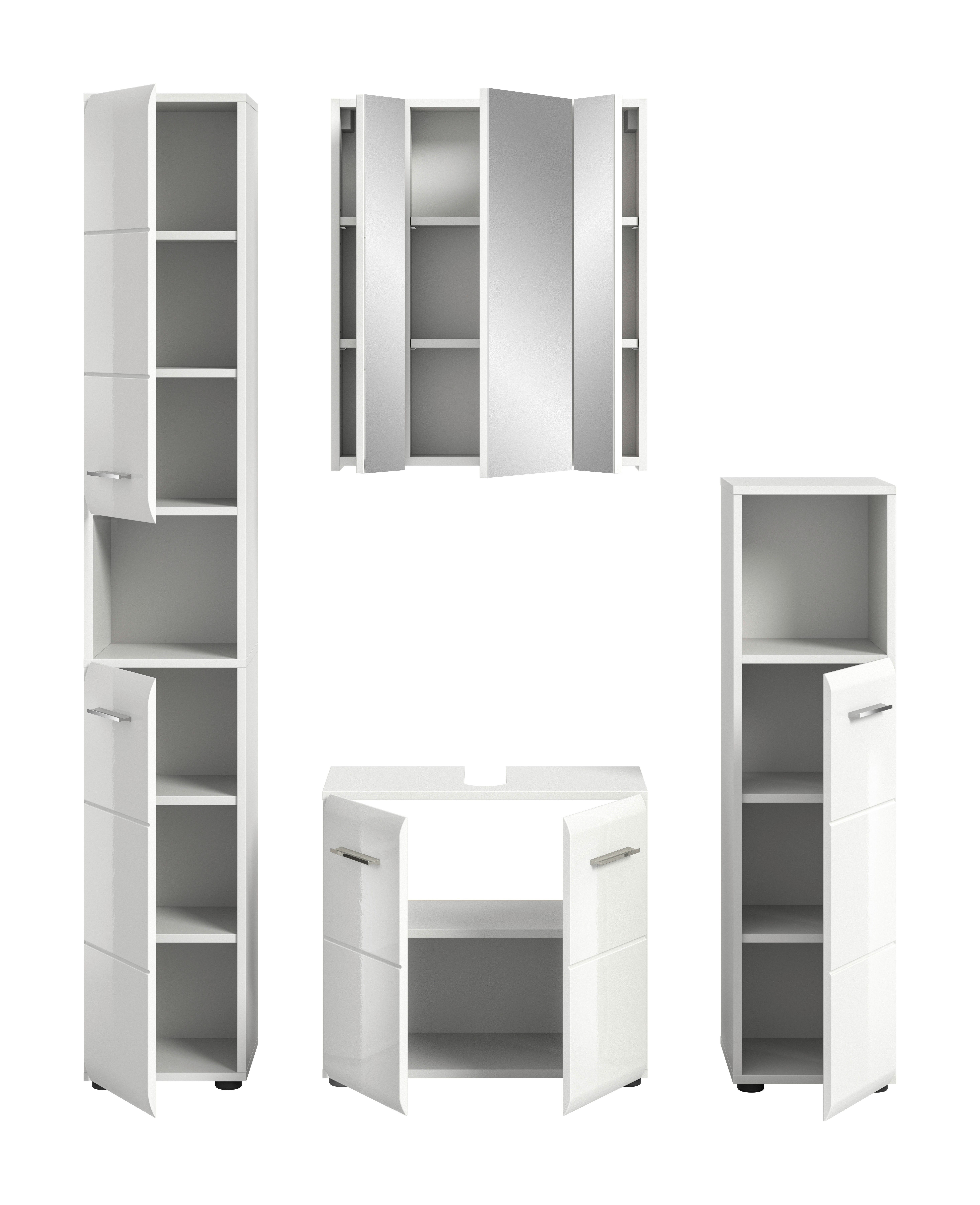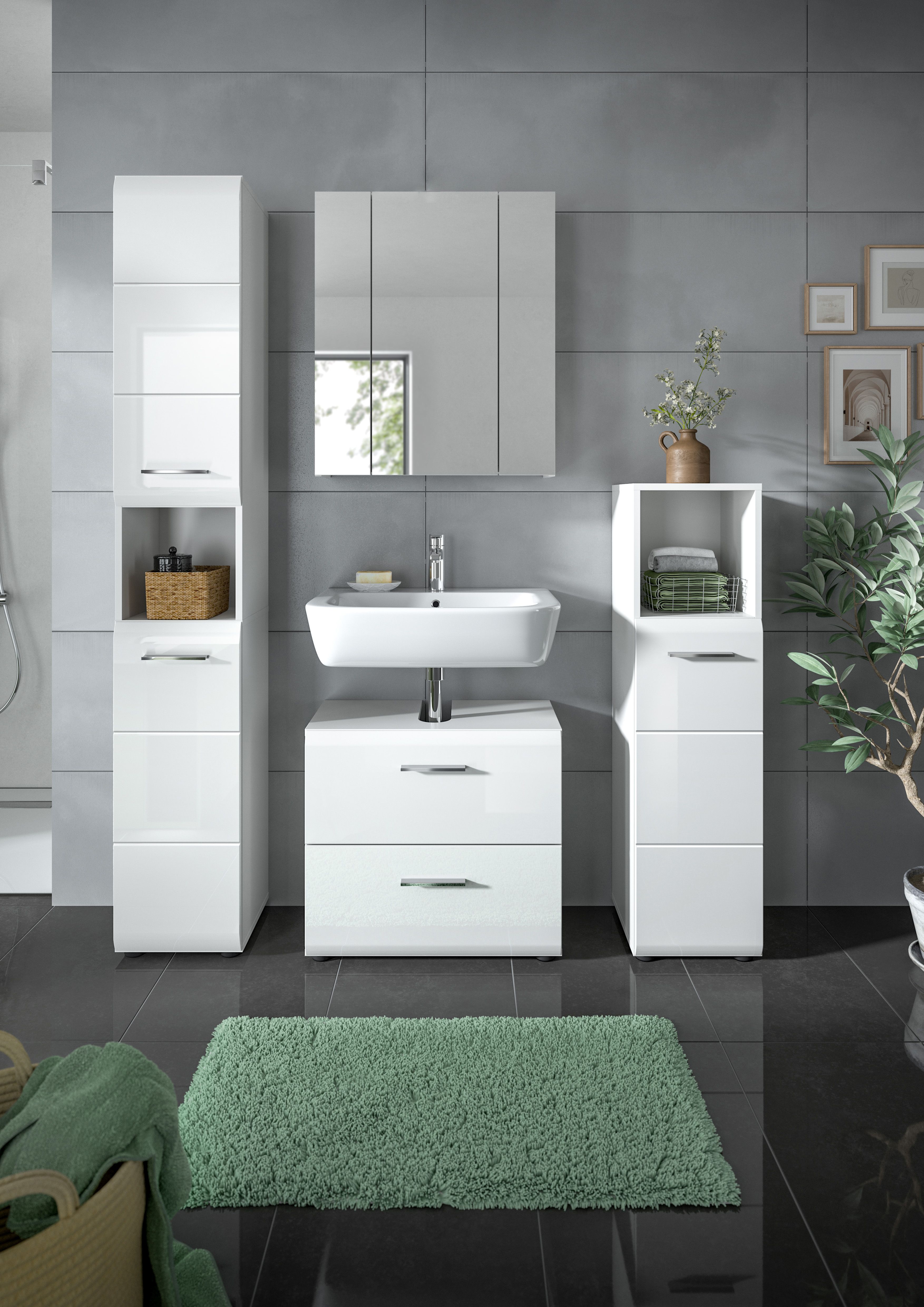 Entdecken Sie unsere elegante Badezimmer Badkombination in strahlendem Weiß, vereint mit hochglänzenden tiefgezogenen Elementen für zeitlose Eleganz. Diese durchdachte Kombination aus verschiedenen Badmöbeln in Weiß-Nachbildung bietet nicht nur Stauraum für Ihre Badutensilien, sondern verleiht Ihrem Badezimmer auch einen modernen und aufgeräumten Look.
