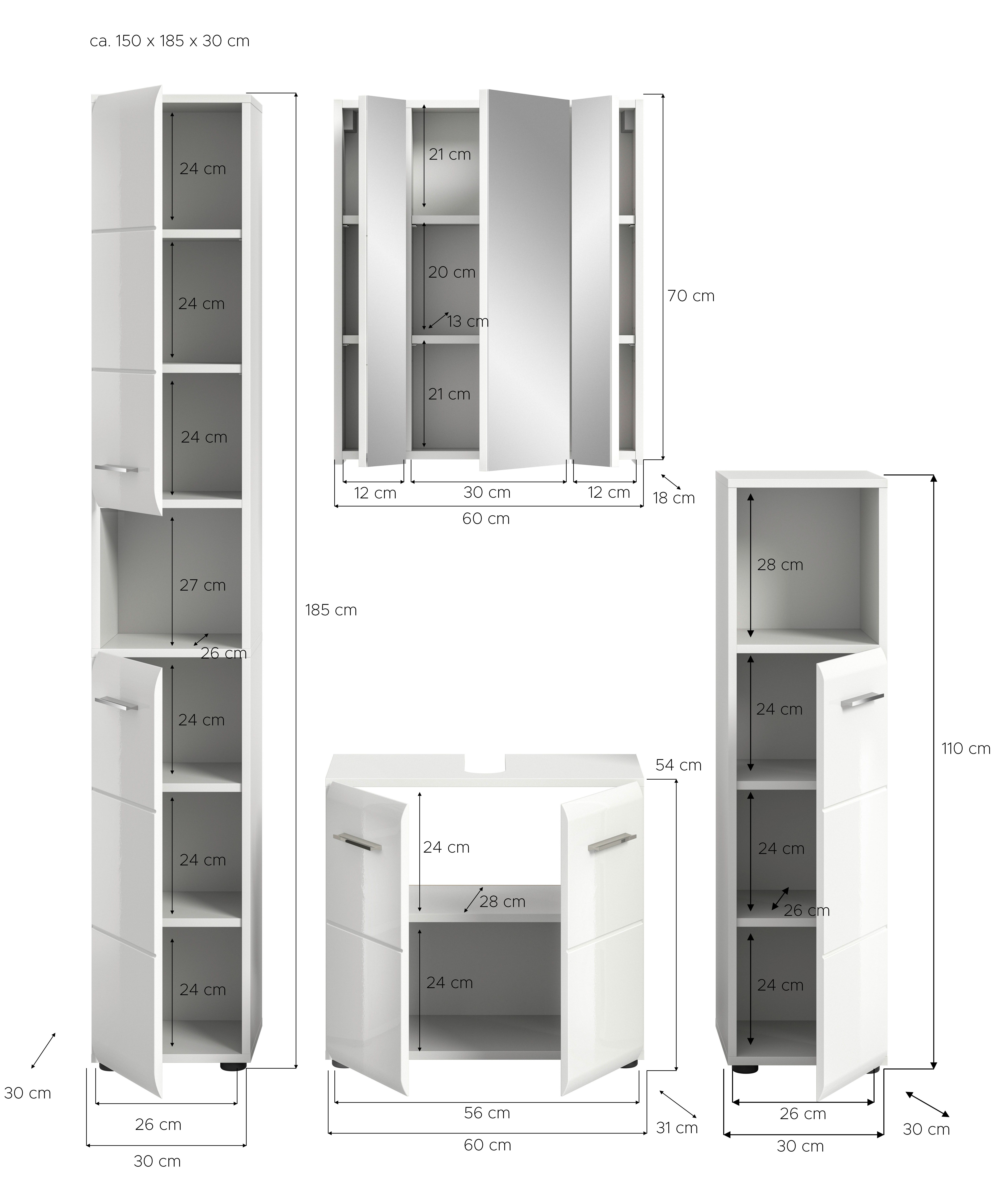 - Funktionalität: Kombination aus Waschbeckenunterschrank, Spiegelschrank, Hochschrank und Midischrank für eine umfassende und platzsparende Lösung zur Aufbewahrung und Nutzung im Badezimmer.
