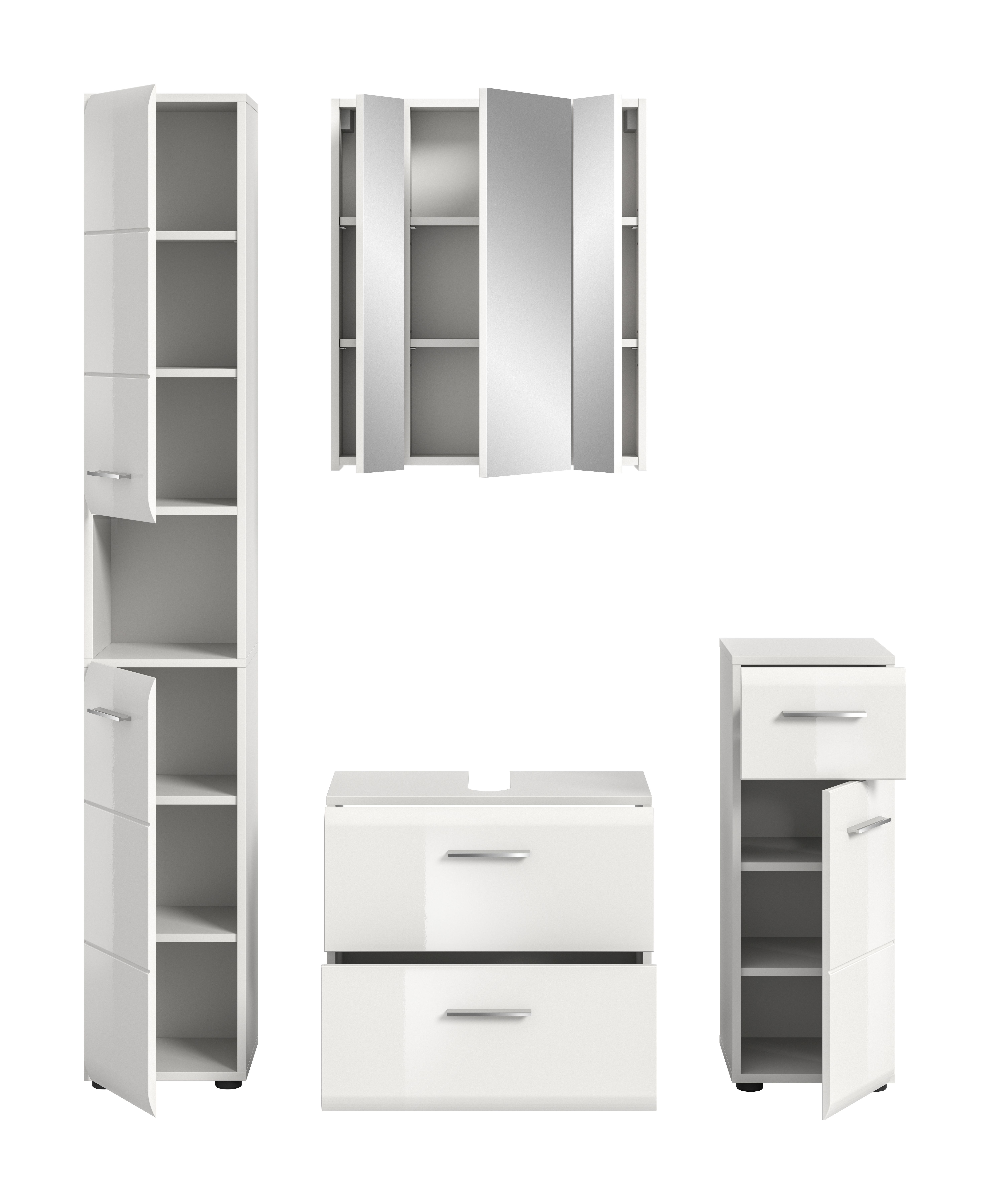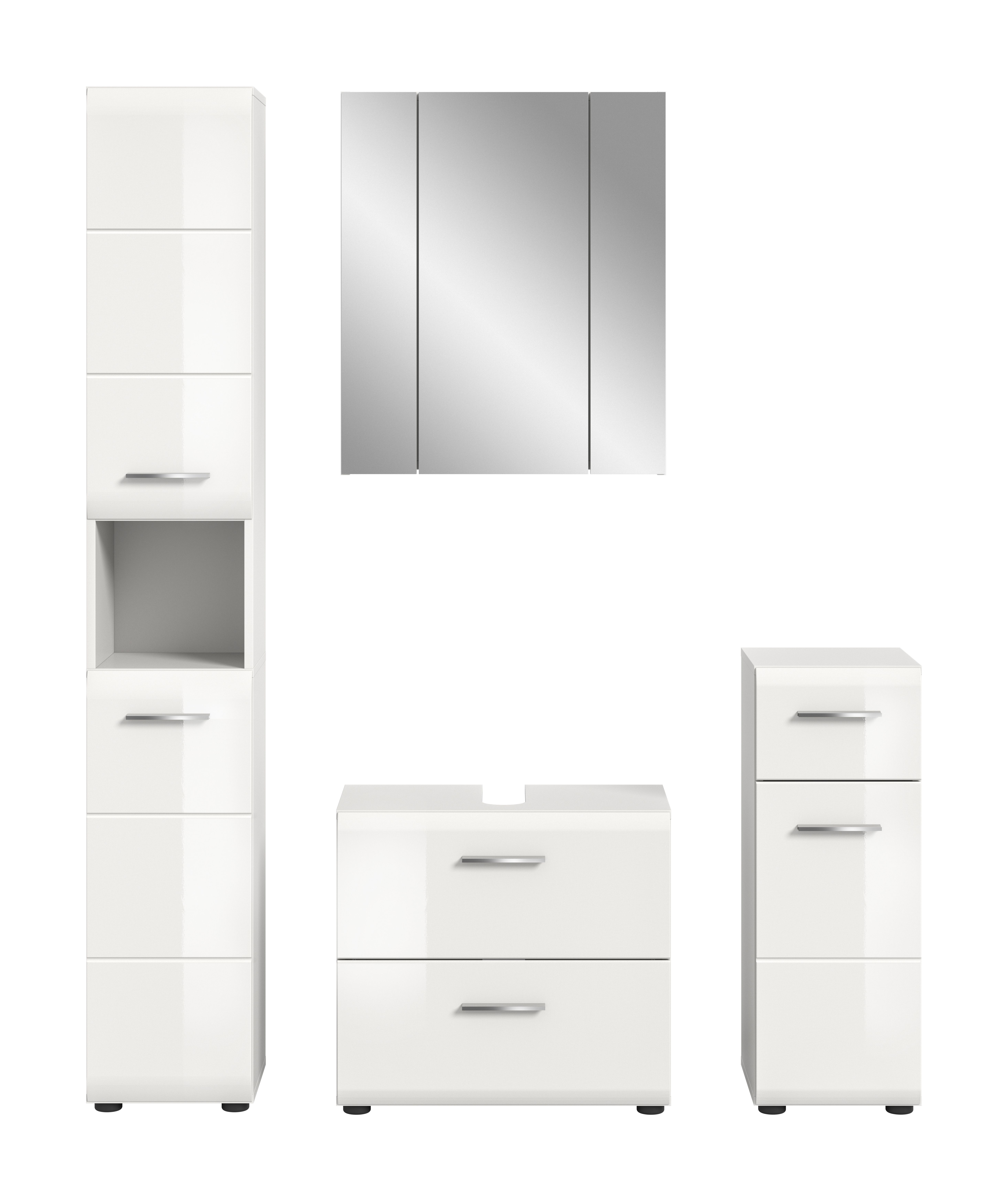 Entdecken Sie unsere elegante Badezimmer Badkombination in strahlendem Weiß, vereint mit hochglänzenden tiefgezogenen Elementen für zeitlose Eleganz. Diese durchdachte Kombination aus verschiedenen Badmöbeln in Weiß-Nachbildung bietet nicht nur Stauraum für Ihre Badutensilien, sondern verleiht Ihrem Badezimmer auch einen modernen und aufgeräumten Look.