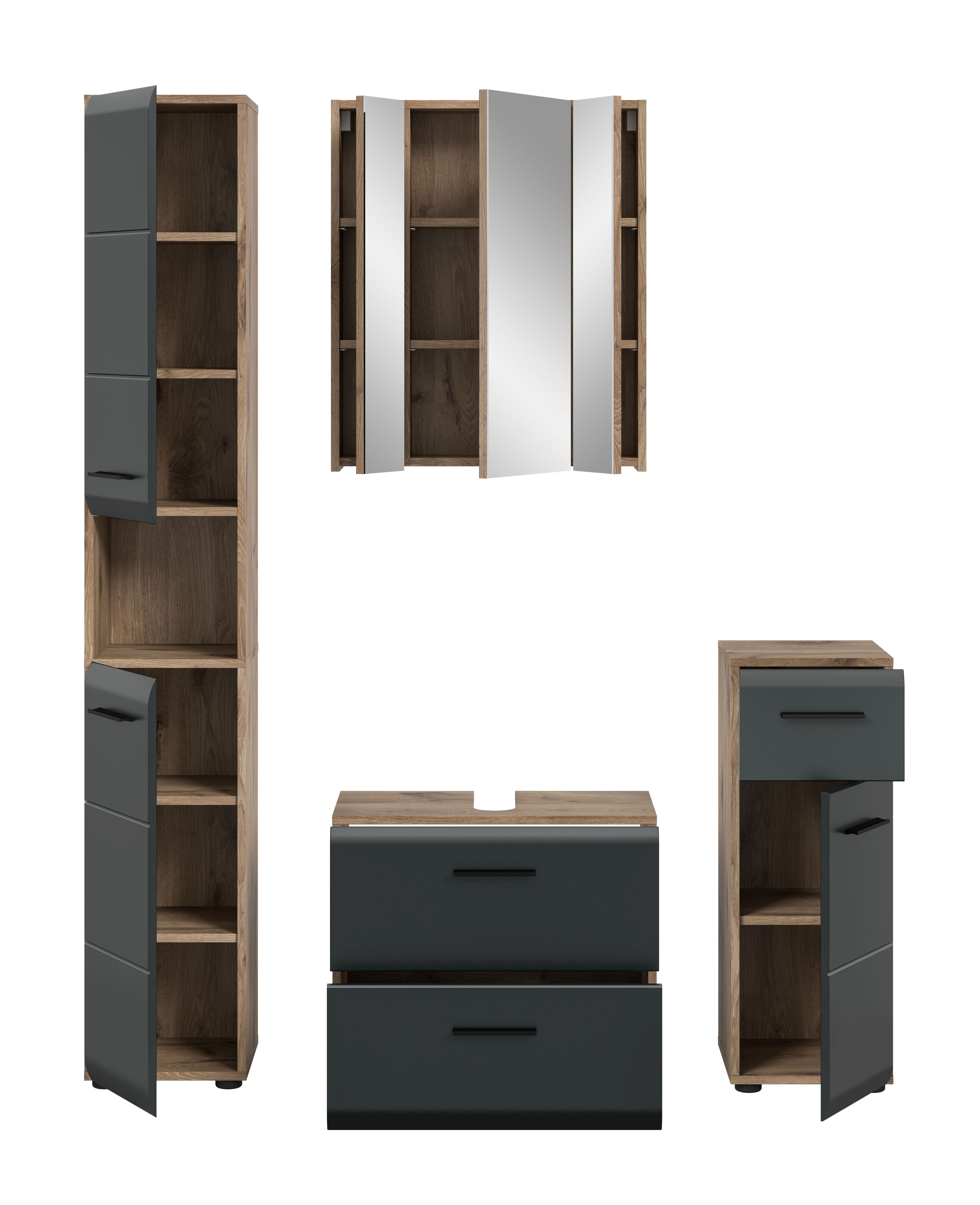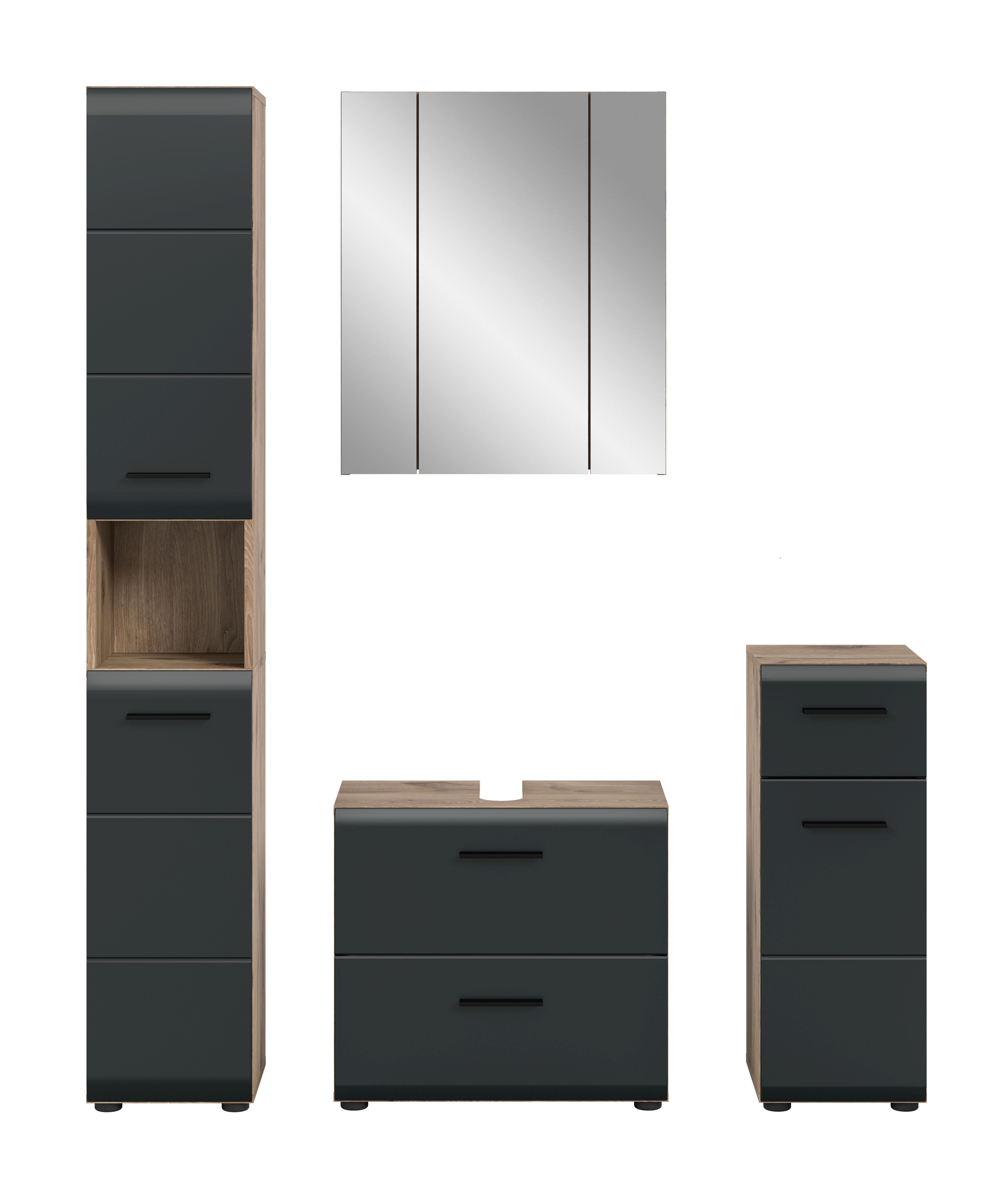 Entdecken Sie unsere elegante Badezimmer Badkombination in Schwarz matt und Nox Eiche Holznachbildung. Diese durchdachte Kombination aus verschiedenen Badmöbeln bietet nicht nur Stauraum für Ihre Badutensilien, sondern verleiht Ihrem Badezimmer auch einen modernen und aufgeräumten Look.