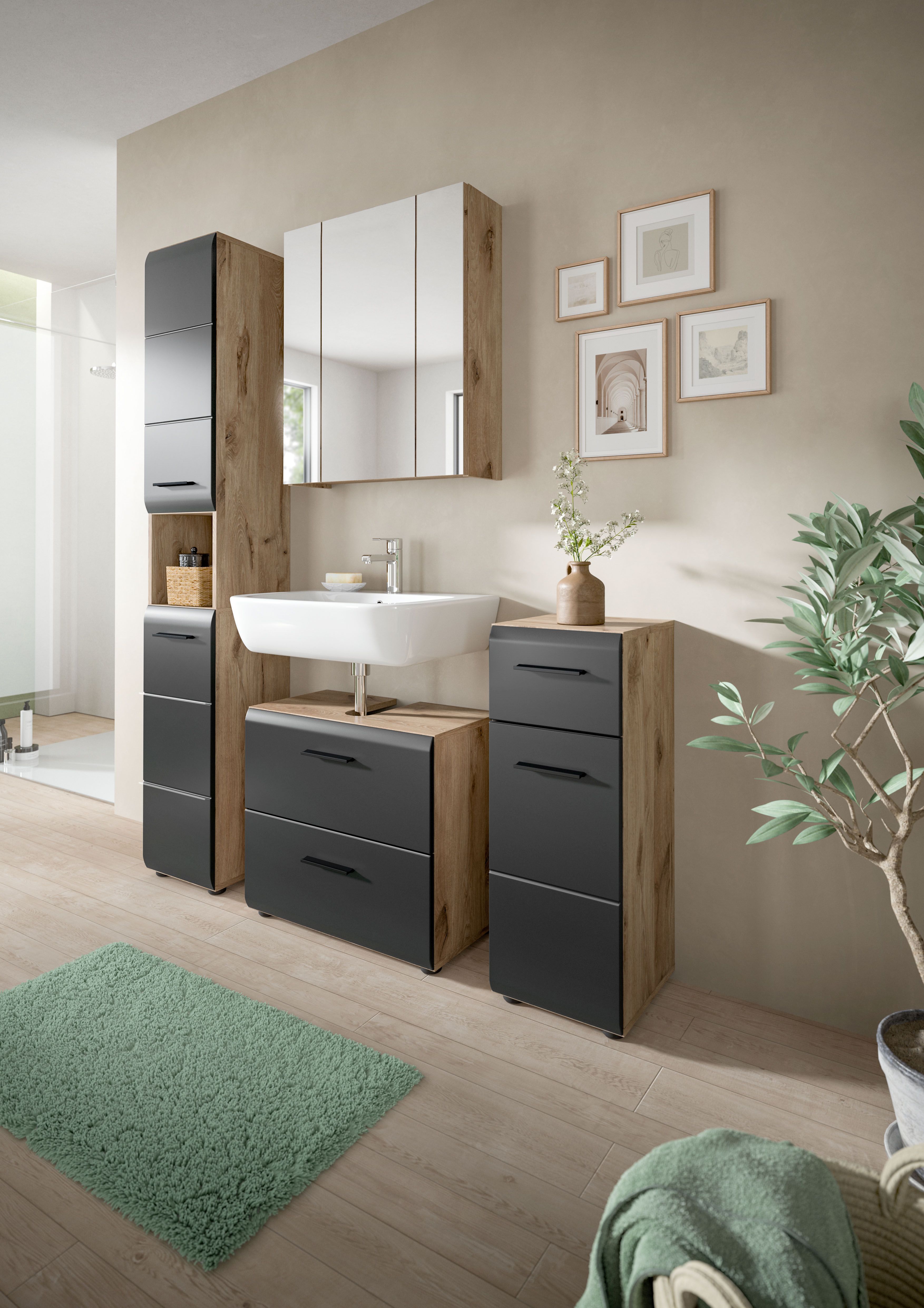 - Funktionalität: Kombination aus Waschbeckenunterschrank, Spiegelschrank, Hochschrank und Badkommode für eine umfassende und platzsparende Lösung zur Aufbewahrung und Nutzung im Badezimmer.