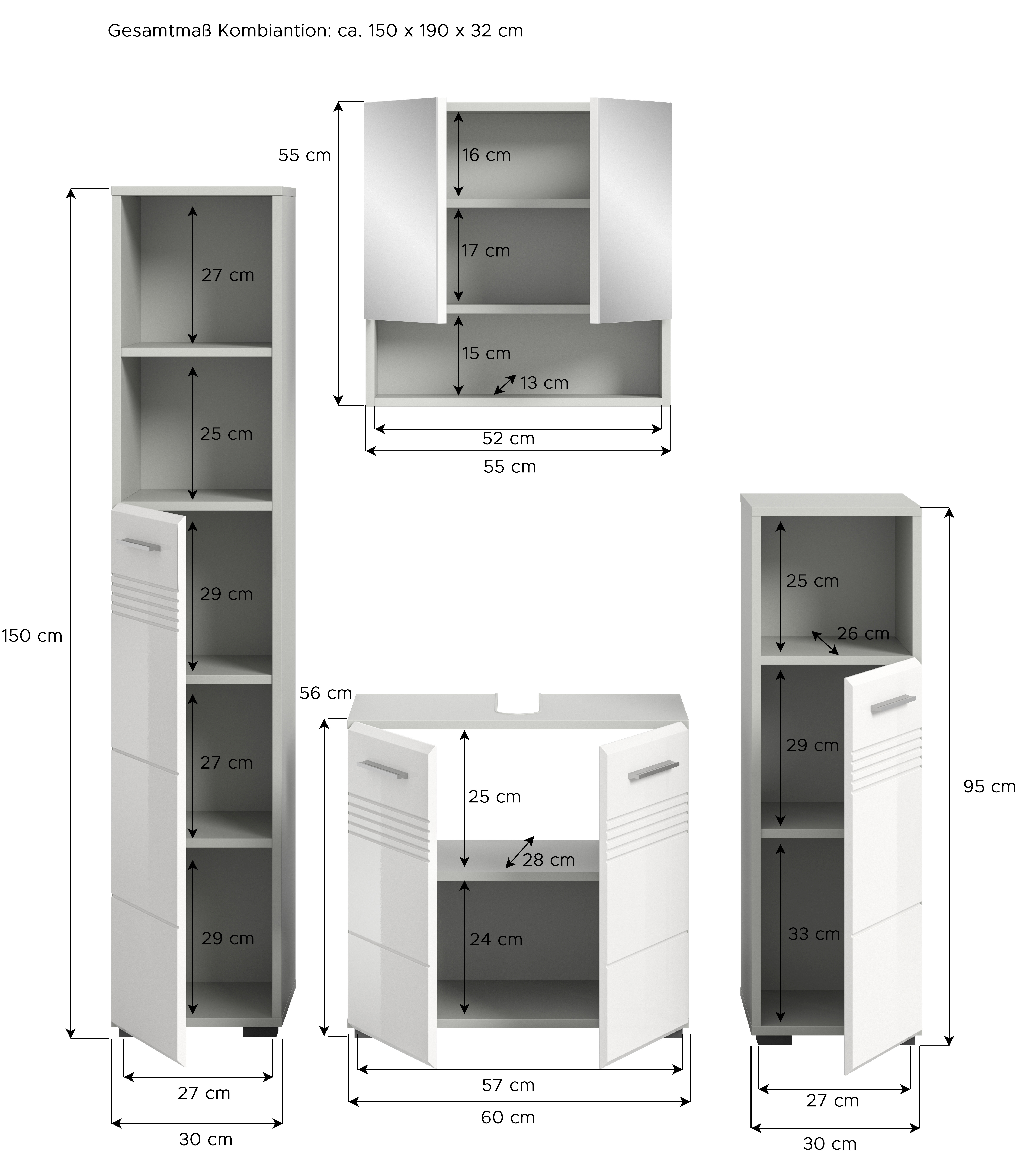 - Funktionalität: Die Badkombination bietet großzügigen Stauraum mit vielen Fächern für Badutensilien und Handtücher, während sie dank ihrer kompakten Größe ideal für jedes Badezimmer geeignet ist.
