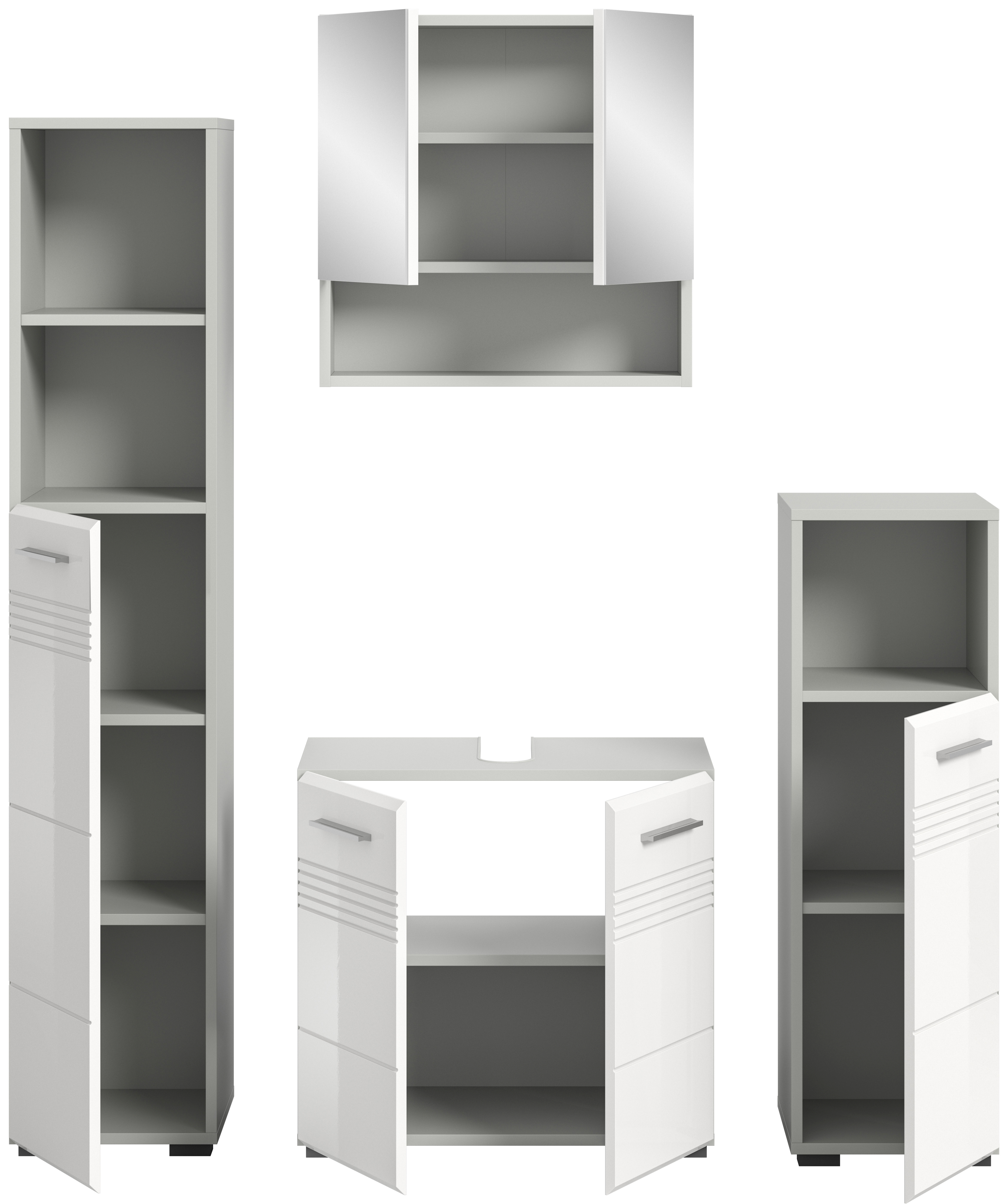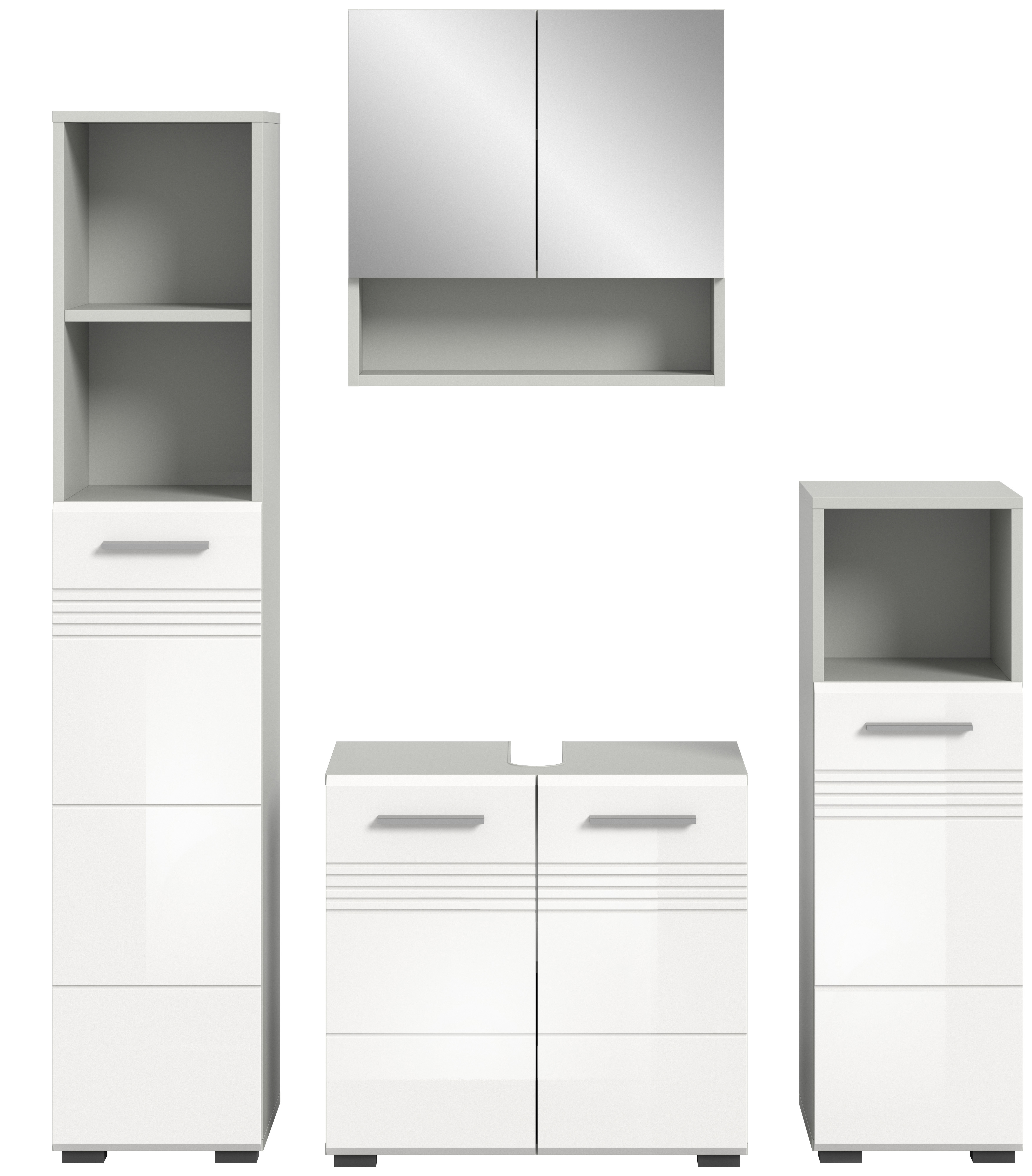 Entdecken Sie unsere moderne Badkombination in eleganter Hellgrau Nachbildung und strahlendem weißem Hochglanz, tiefgezogen für ein glänzendes Finish. Diese Kombination vereint Funktionalität und Stil und bietet mit ihrem zeitgemäßen Design eine perfekte Lösung für Ihr Badezimmer. Mit hochwertiger Verarbeitung und praktischem Stauraum ist sie die ideale Wahl für eine stilvolle und organisierte Badezimmereinrichtung.