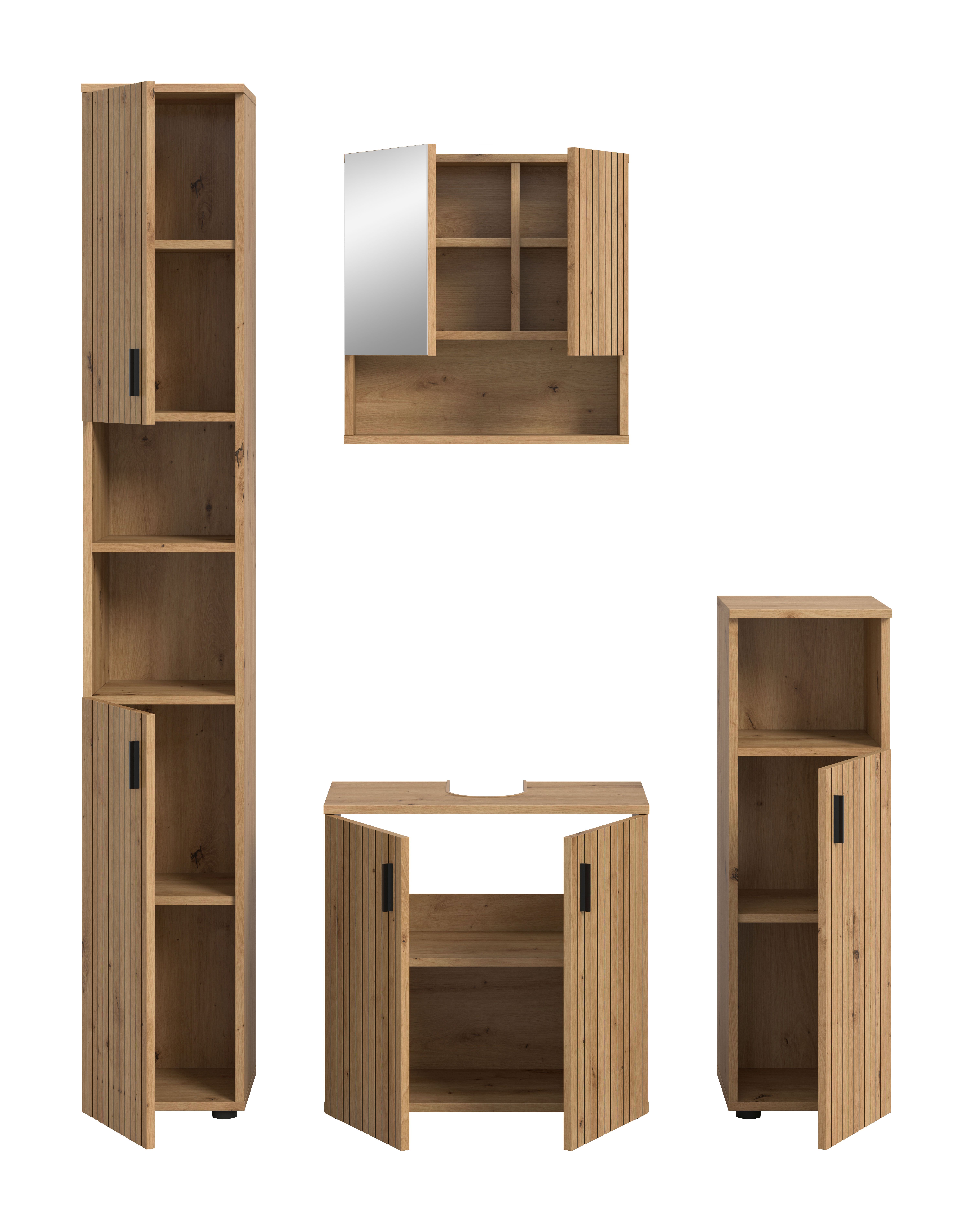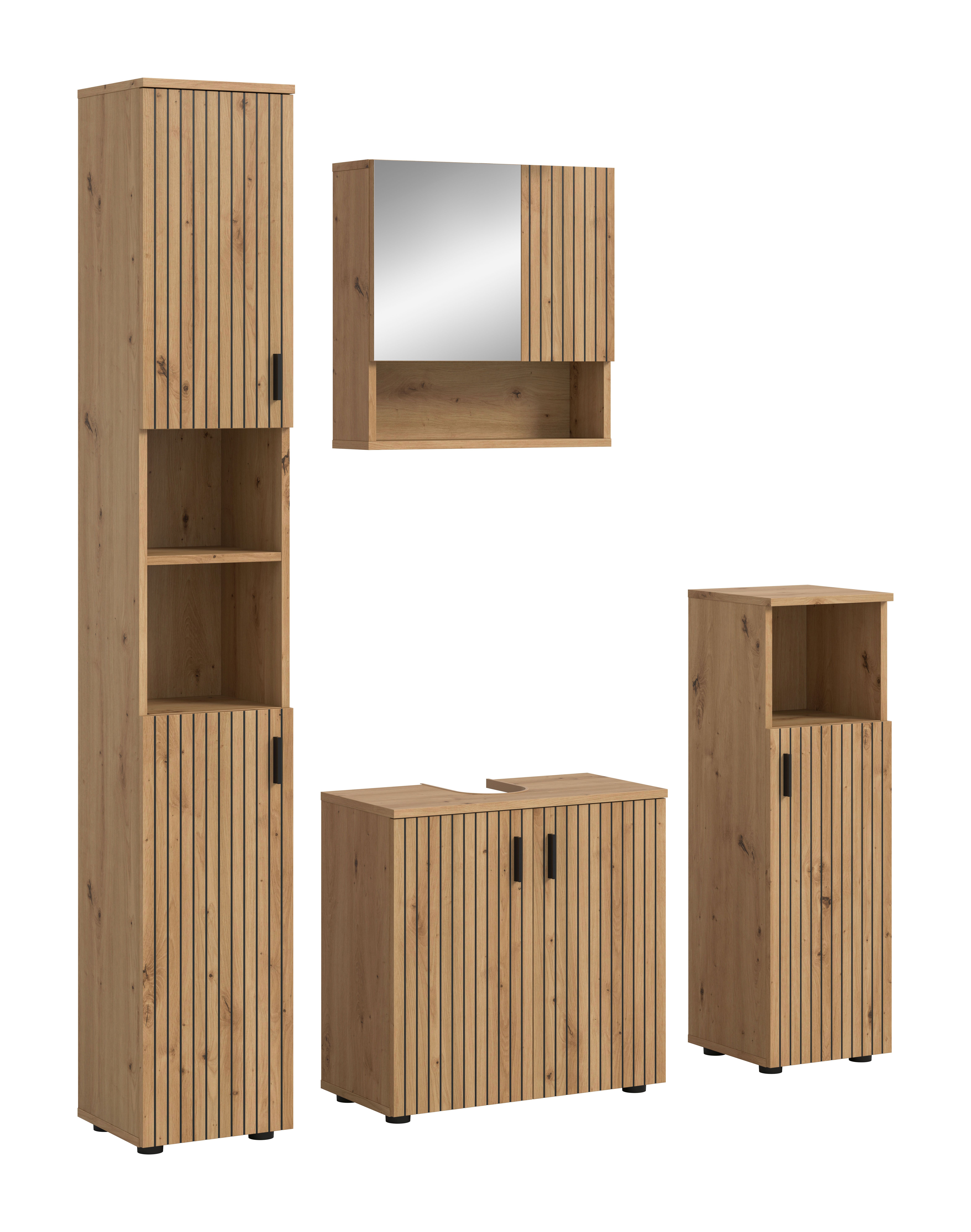 Die 4-teilige Badkombination in Artisan Oak Nachbildung (150 x 192 x 30 cm) besteht aus zwei Badschränken, einem Waschbeckenunterschrank und einem Spiegelschrank. Die pflegeleichte Front mit eingefräster Paneeloptik ist hochwertig verarbeitet und verleiht deinem Bad eine warme, natürliche Ausstrahlung. Dieses Set bietet dir viel Stauraum für Handtücher, Pflegeprodukte und weitere Badutensilien, sodass dein Bad stets ordentlich und funktional bleibt. Die robusten Möbel sind langlebig und pflegeleicht, was den Alltag erleichtert. Durch die vielfältigen Kombinationsmöglichkeiten der Serie kannst du dein Bad individuell gestalten und flexibel an deine Bedürfnisse anpassen. Dieses Set verbindet modernes Design mit praktischer Nutzung und sorgt für ein stilvolles und organisiertes Badezimmer.