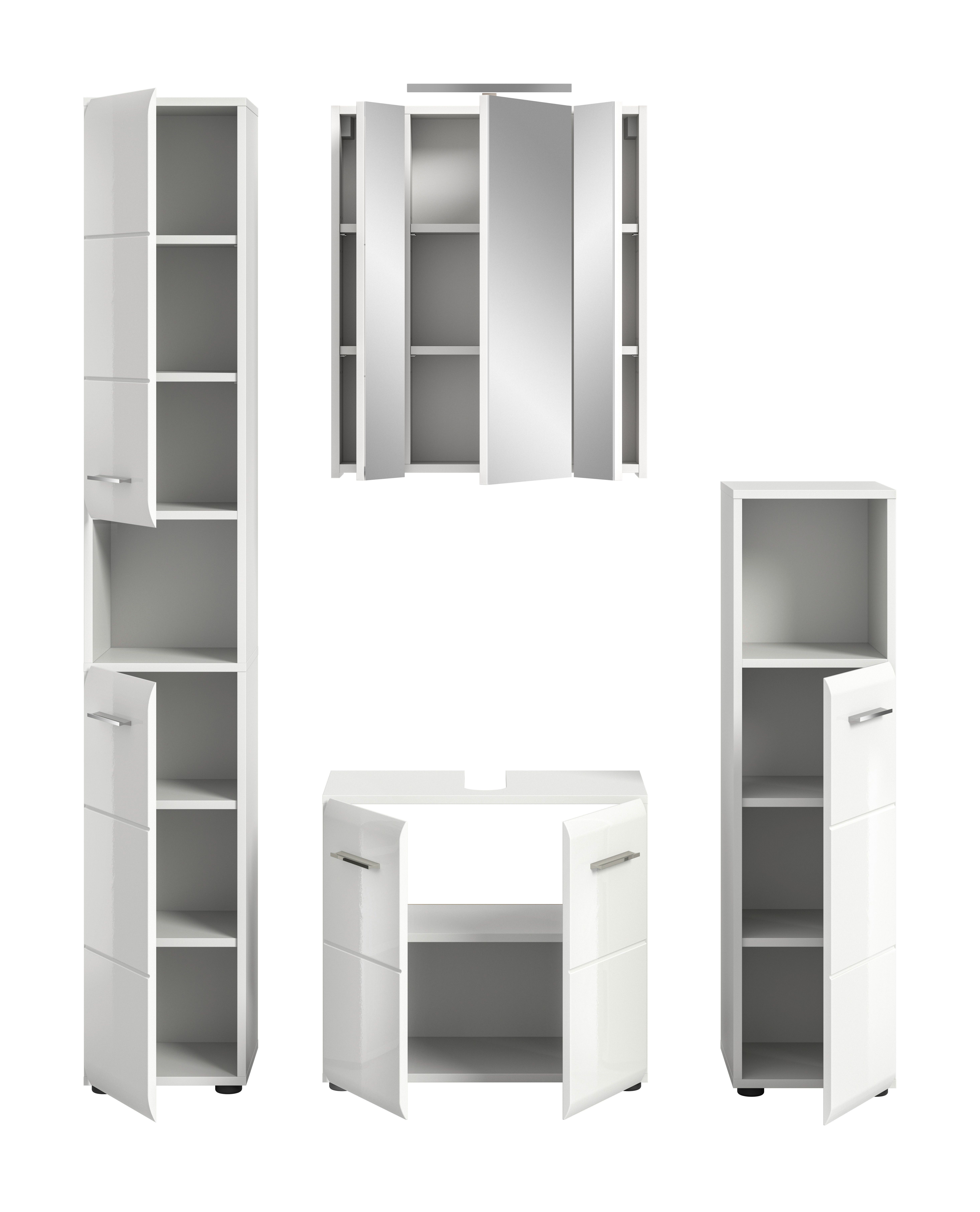 - 5-teilige Badkombination beteht aus 1x Hochschrank, 1x WBU, 1x Spiegelschrank inkl. Beleuchtung, 1x Standschrank hoch