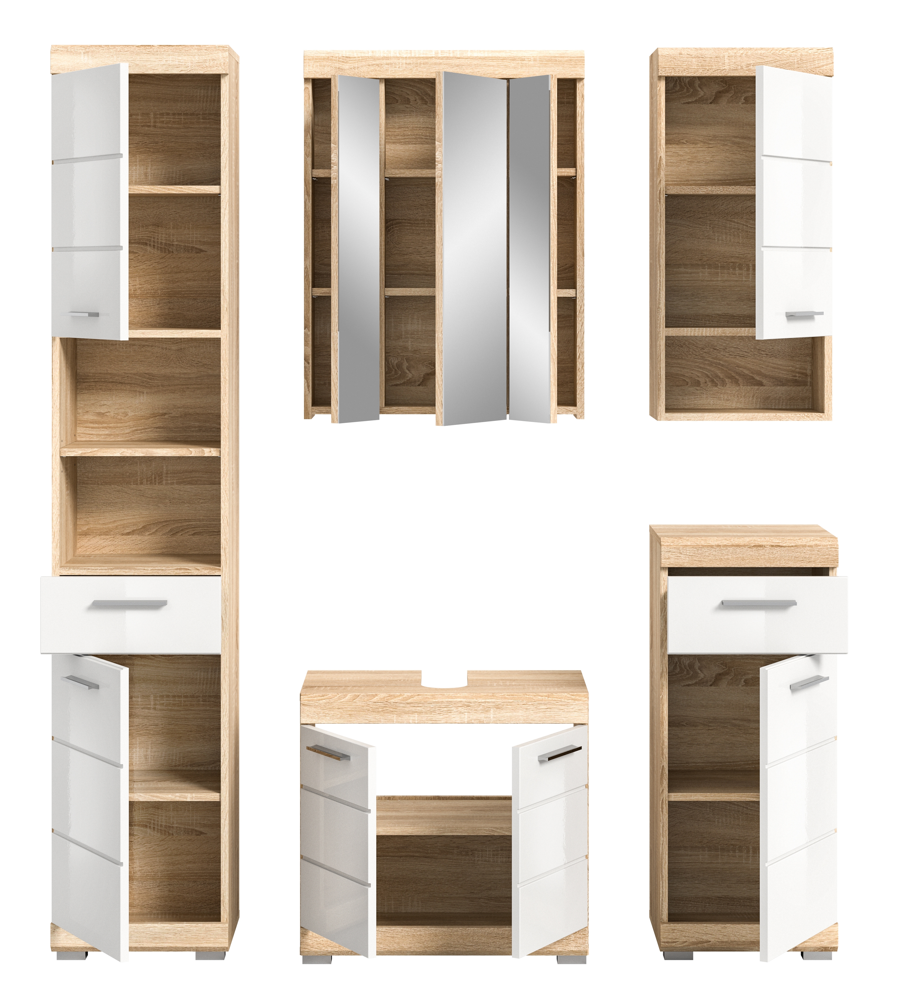 Entdecken Sie die perfekte Kombination aus Stil und Funktionalität für Ihr Badezimmer mit unserer Badkombination in Sonoma Eiche hell und weißem Hochglanz. Sie bietet bietet ausreichend Stauraum und verleiht Ihrem Raum einen modernen und ansprechenden Look. Tauchen Sie ein in zeitlose Eleganz und optimale Organisation mit diesem einzigartigen Möbelstück.