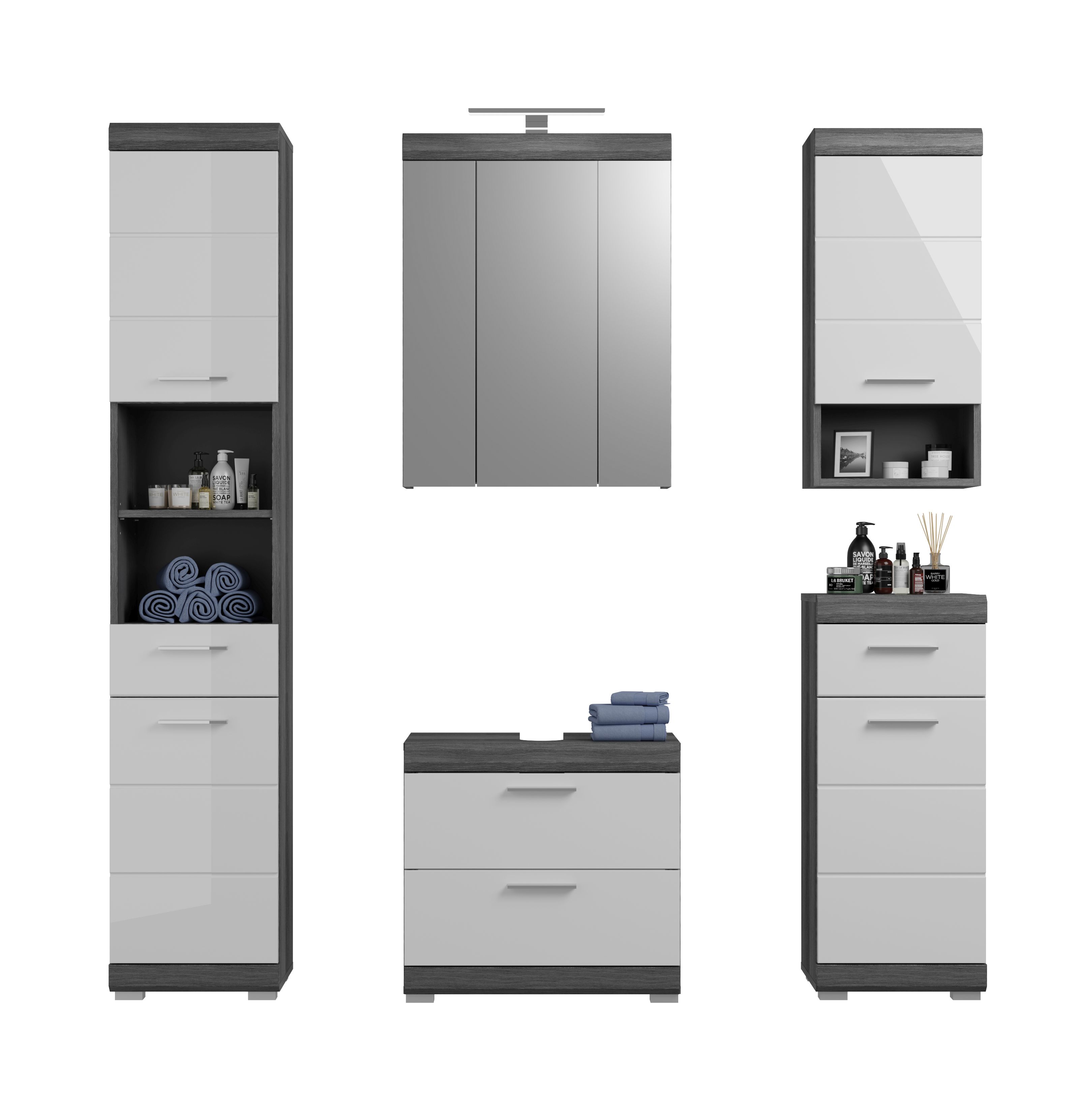 Verleihe deinem Badezimmer den ultimativen Style mit unserer Badkombination in angesagtem Rauchsilber Nachbildung und weißem Hochglanz tiefgezogenem Finish. Mit ihrem trendigen Design und der hochwertigen Verarbeitung setzt sie ein modernes Statement in deinem Zuhause. Entdecke jetzt die perfekte Verbindung von Coolness und Funktionalität für dein Badezimmer!