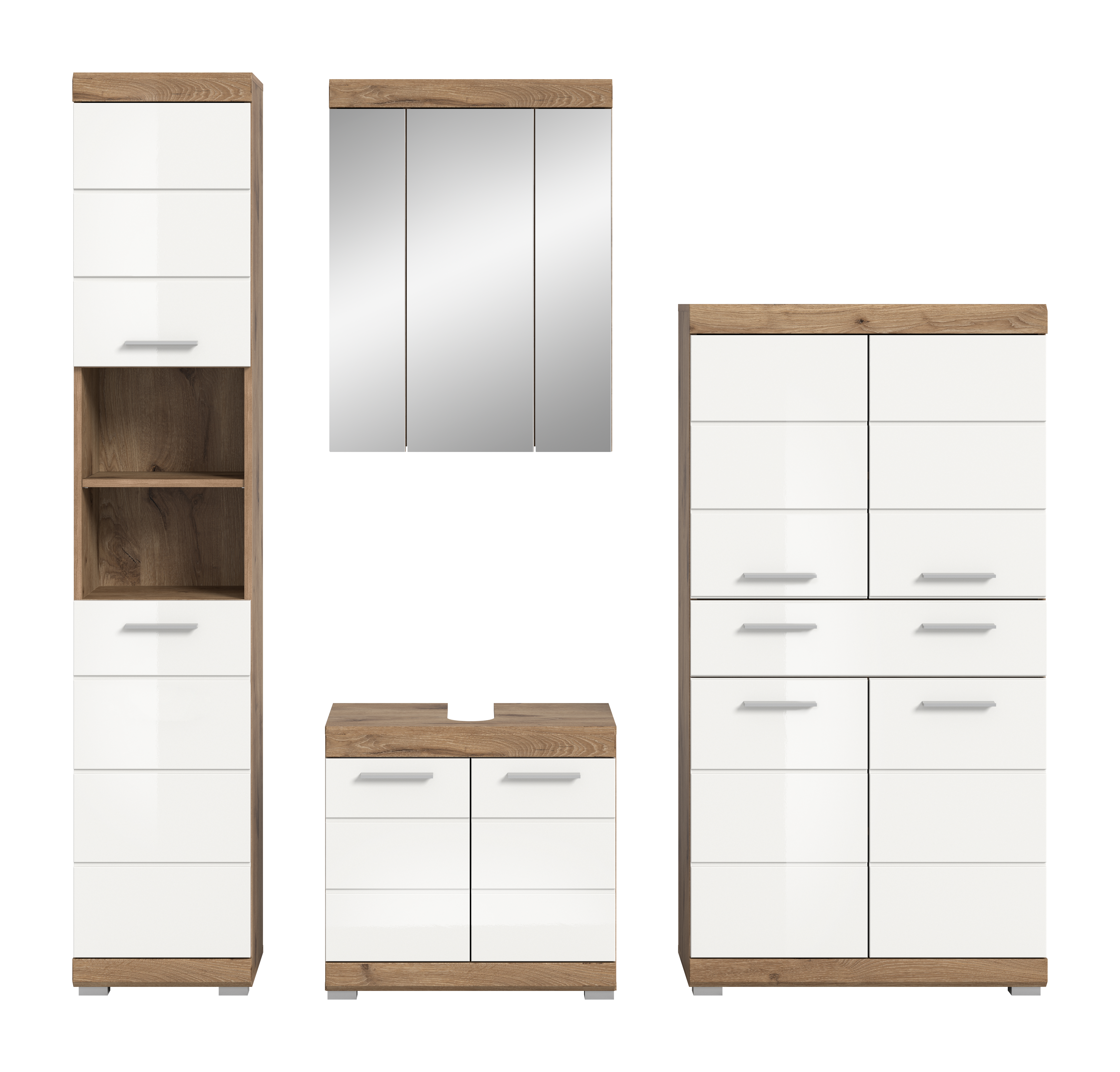 Diese stilvolle Badkombination kombiniert modernes Design mit praktischer Funktionalität. Sie bietet eine platzsparende Lösung für kleinere Badezimmer, ohne dabei auf Stauraum zu verzichten. Die elegante Kombination aus weißem Hochglanz und Nox Oak Nachbildung verleiht Ihrem Badezimmer ein zeitgemäßes und einladendes Ambiente. Die Kombination verfügt über zwei Türen und drei Spiegeltüren, die nicht nur Ihre Utensilien optimal verstauen, sondern auch eine praktische Spiegeloberfläche für Ihre tägliche Routine bieten. Der Standschrank und Hochschrank bieten zusätzlichen Stauraum. Das Design sorgt für eine klare Linienführung und einen aufgeräumten Look.