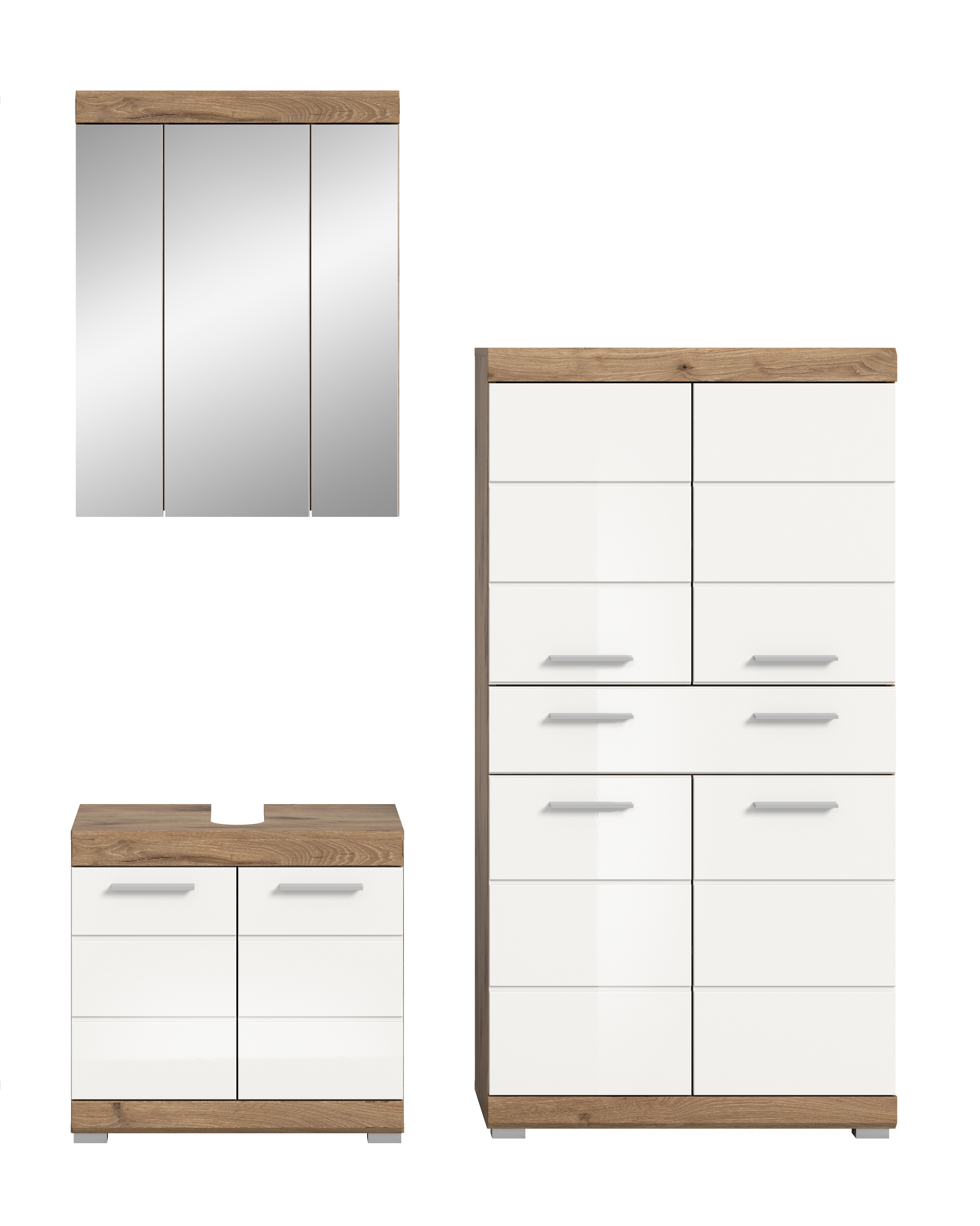 Diese stilvolle Badkombination kombiniert modernes Design mit praktischer Funktionalität. Sie bietet eine platzsparende Lösung für kleinere Badezimmer, ohne dabei auf Stauraum zu verzichten. Die elegante Kombination aus weißem Hochglanz und Nox Oak Nachbildung verleiht Ihrem Badezimmer ein zeitgemäßes und einladendes Ambiente. Die Kombination verfügt über zwei Türen und drei Spiegeltüren, die nicht nur Ihre Utensilien optimal verstauen, sondern auch eine praktische Spiegeloberfläche für Ihre tägliche Routine bieten. Der Standschrank bietet zusätzlichen Stauraum. Das Design sorgt für eine klare Linienführung und einen aufgeräumten Look.
