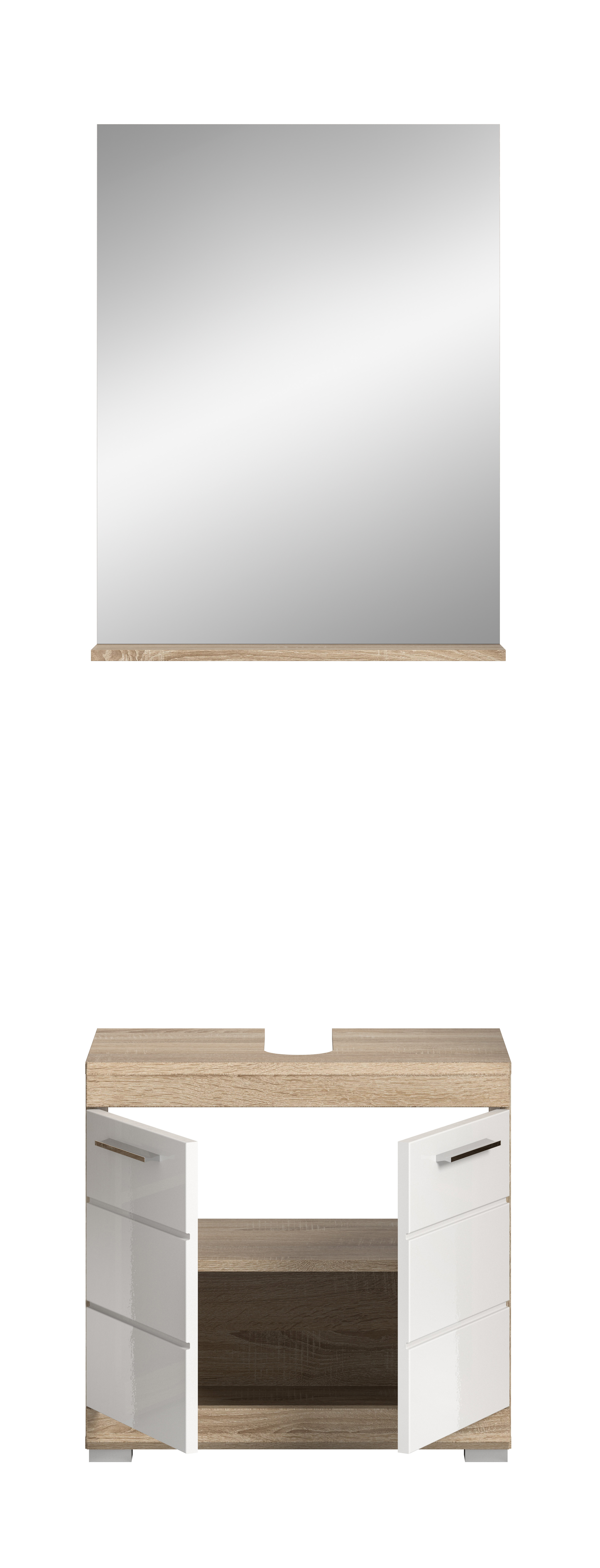 Entdecken Sie die perfekte Kombination aus Stil und Funktionalität für Ihr Badezimmer mit unserer Badkombination in Sonoma Eiche hell und weißem Hochglanz. Sie bietet bietet ausreichend Stauraum und verleiht Ihrem Raum einen modernen und ansprechenden Look. Tauchen Sie ein in zeitlose Eleganz und optimale Organisation mit diesem einzigartigen Möbelstück.