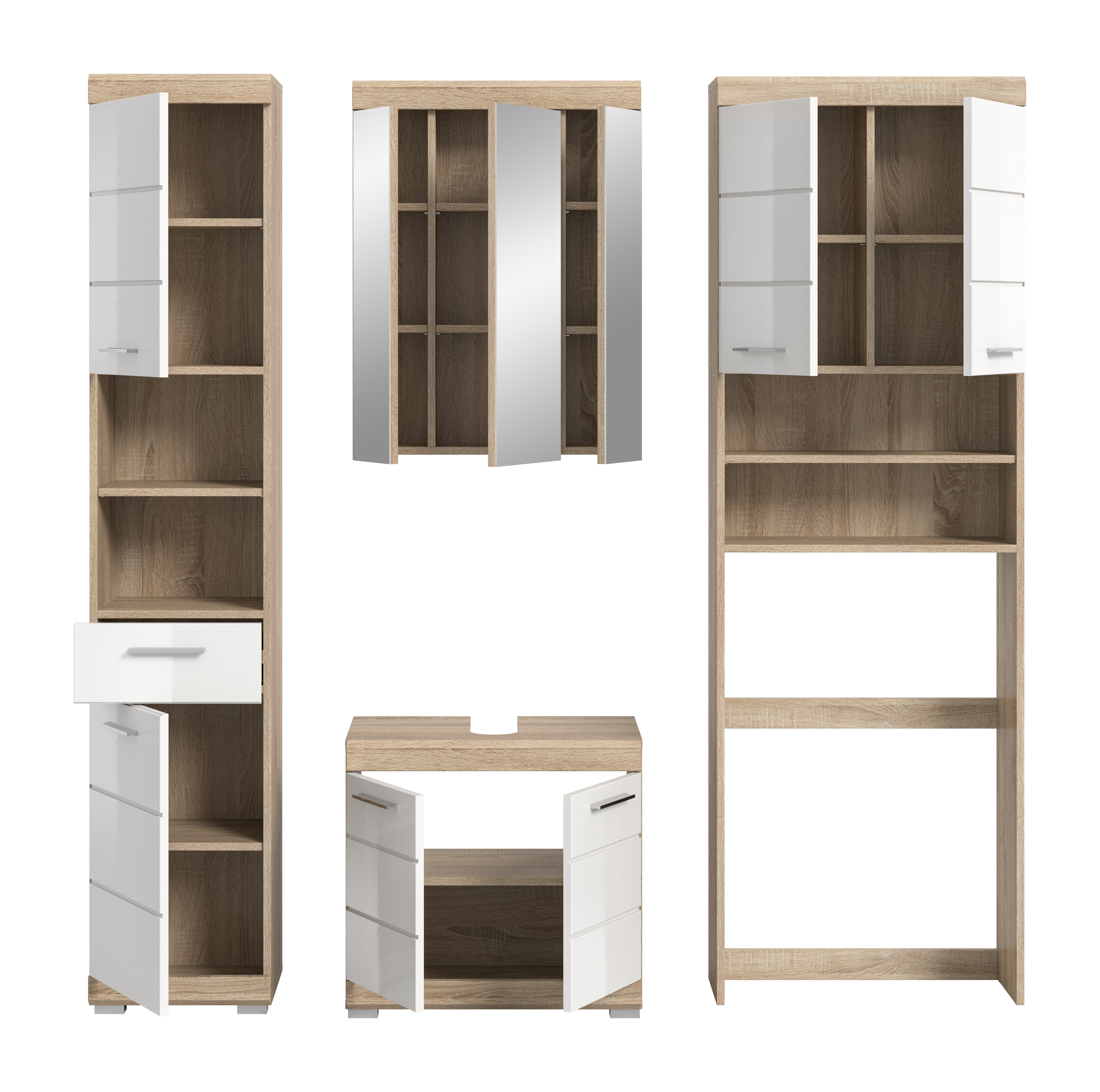 Entdecken Sie die perfekte Kombination aus Stil und Funktionalität für Ihr Badezimmer mit unserer Badkombination in Sonoma Eiche hell und weißem Hochglanz. Sie bietet bietet ausreichend Stauraum und verleiht Ihrem Raum einen modernen und ansprechenden Look. Tauchen Sie ein in zeitlose Eleganz und optimale Organisation mit diesem einzigartigen Möbelstück.