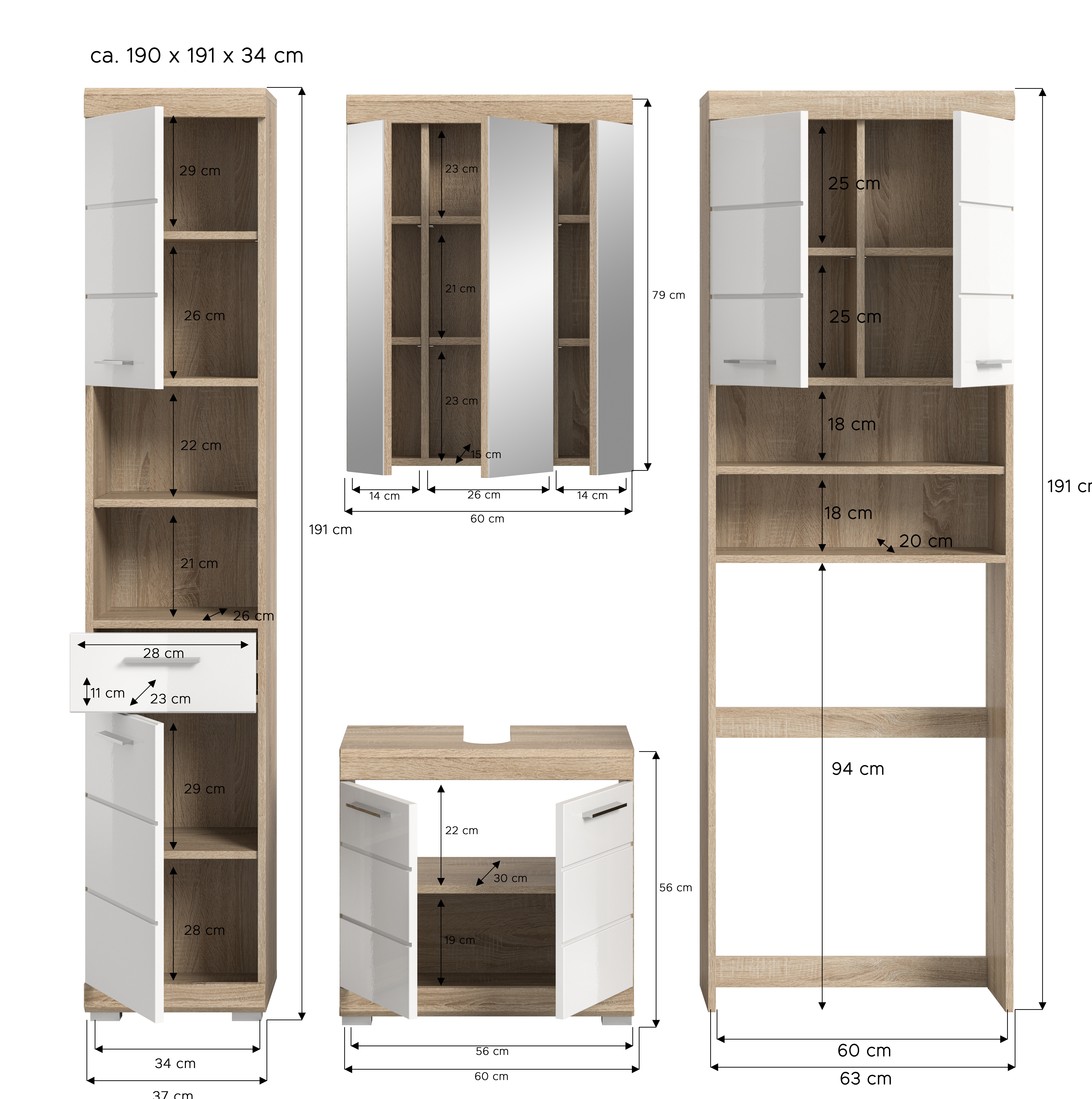 - Design/Stil: Die Kombination aus Sonoma Eiche hell und weißem Hochglanz tiefgezogenem Finish sorgt für ein modernes und ansprechendes Erscheinungsbild im Badezimmer oder Hauswirtschaftsraum.