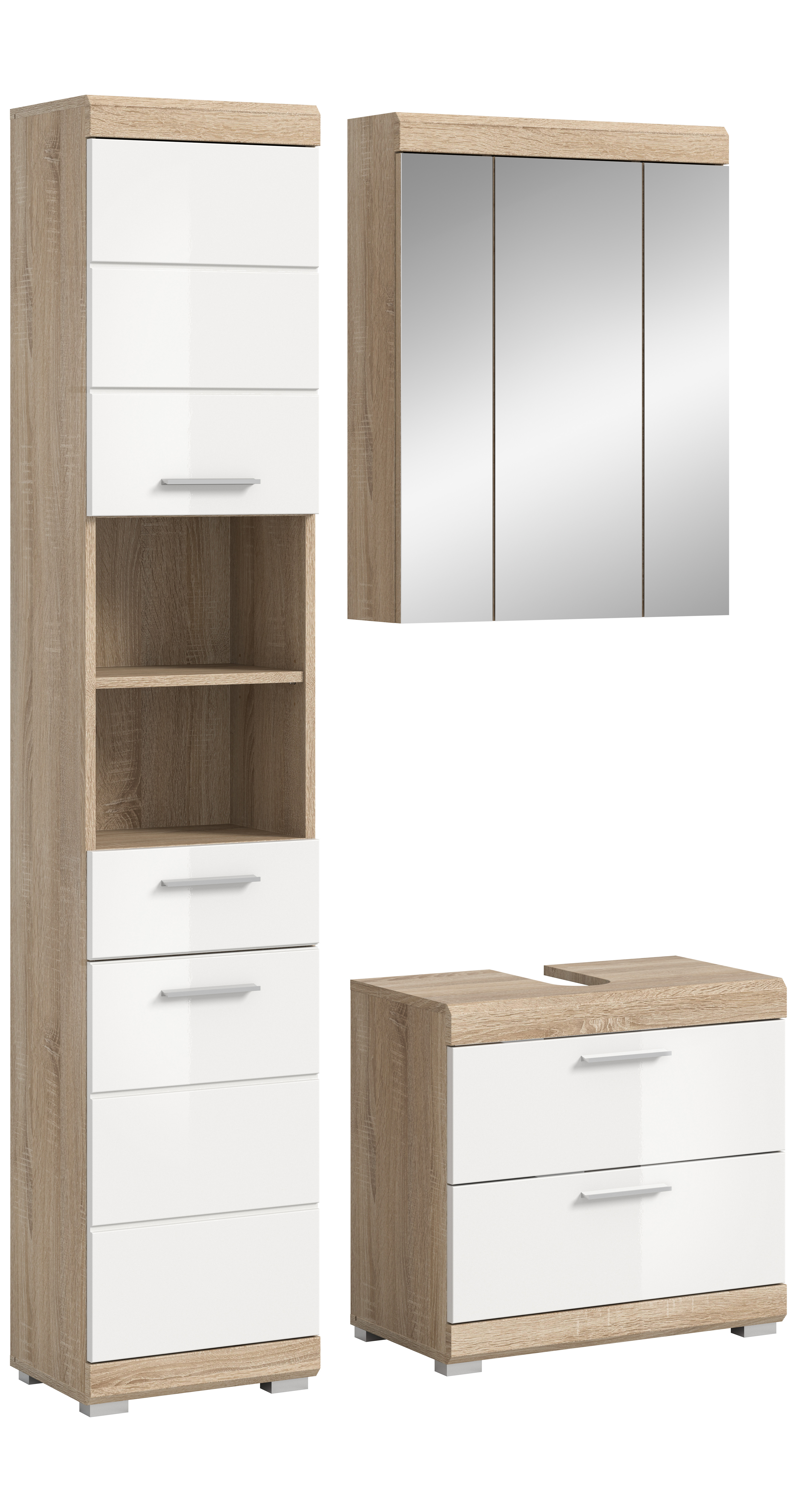 Entdecken Sie die perfekte Kombination aus Stil und Funktionalität für Ihr Badezimmer mit unserer Badkombination in Sonoma Eiche hell und weißem Hochglanz. Sie bietet bietet ausreichend Stauraum und verleiht Ihrem Raum einen modernen und ansprechenden Look. Tauchen Sie ein in zeitlose Eleganz und optimale Organisation mit diesem einzigartigen Möbelstück.