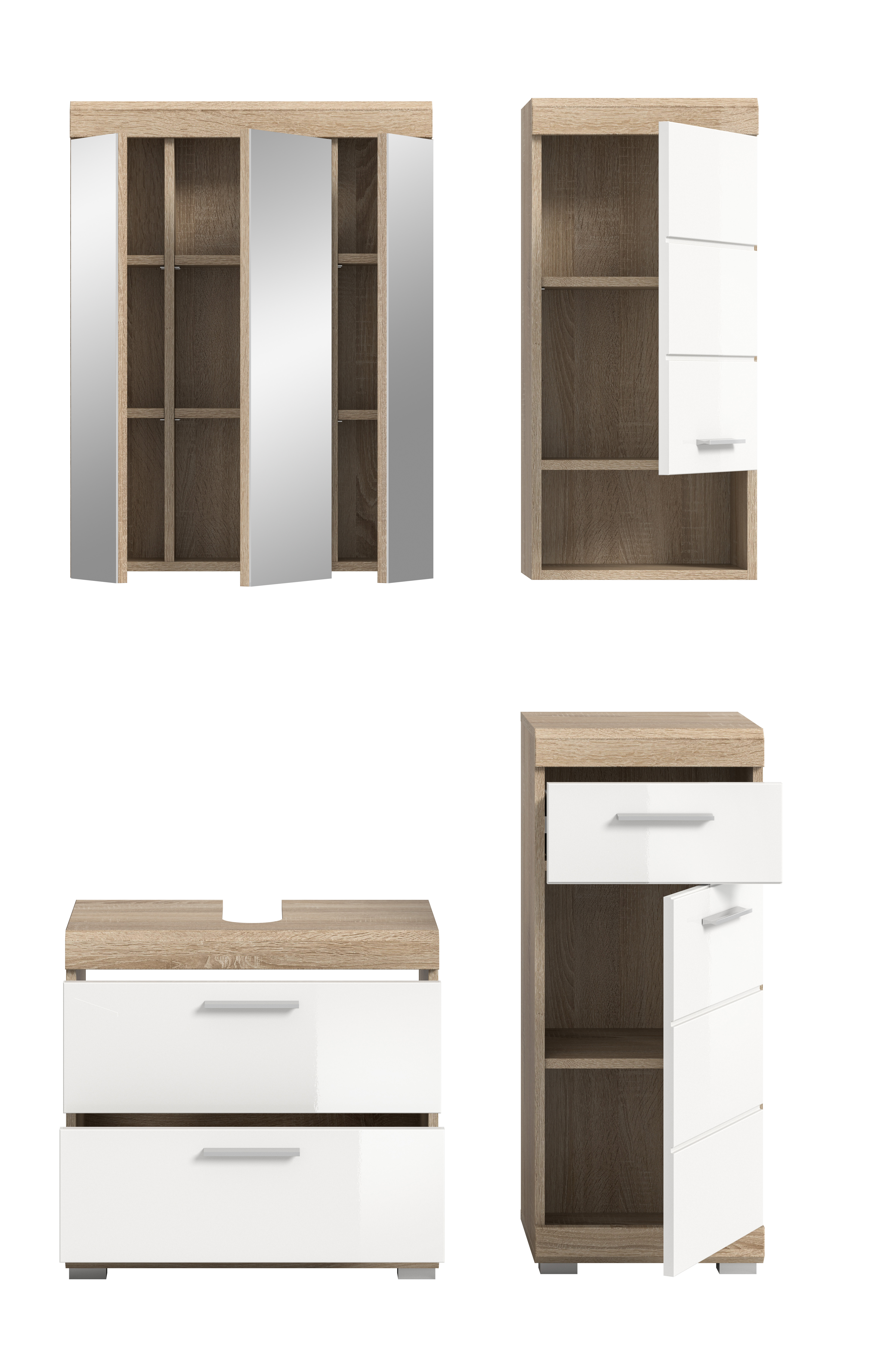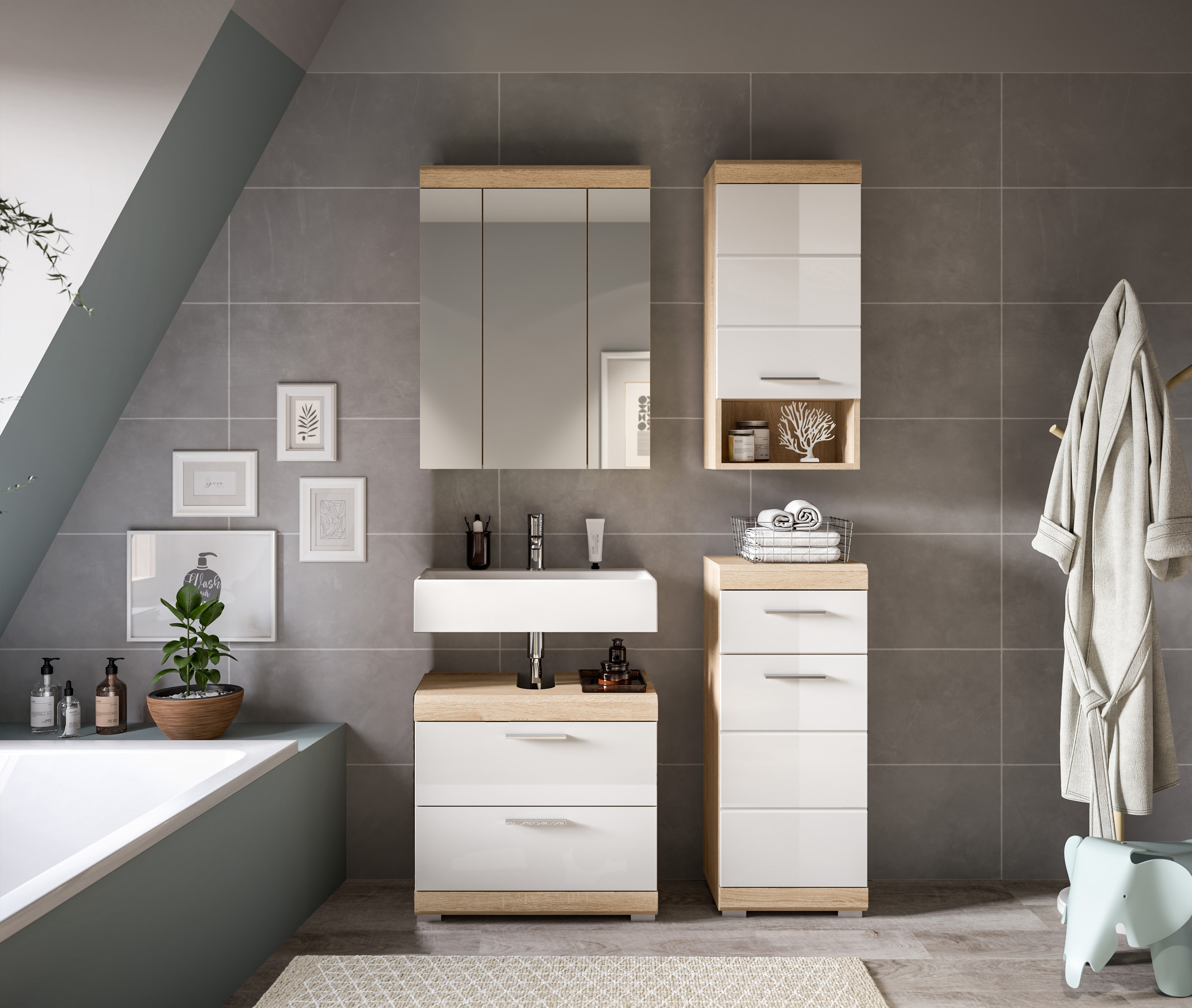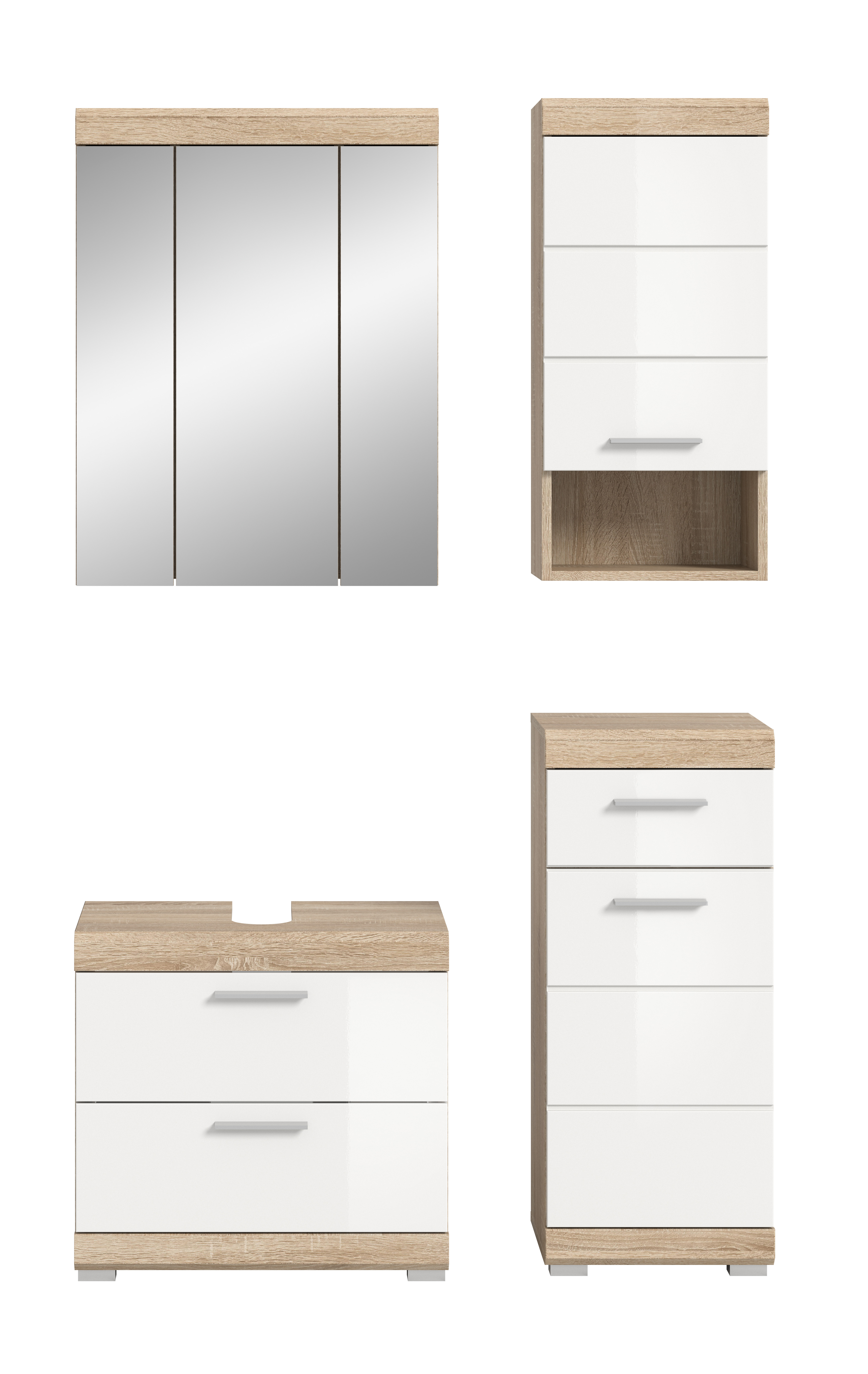 Entdecken Sie die perfekte Kombination aus Stil und Funktionalität für Ihr Badezimmer mit unserer Badkombination in Sonoma Eiche hell und weißem Hochglanz. Sie bietet bietet ausreichend Stauraum und verleiht Ihrem Raum einen modernen und ansprechenden Look. Tauchen Sie ein in zeitlose Eleganz und optimale Organisation mit diesem einzigartigen Möbelstück.