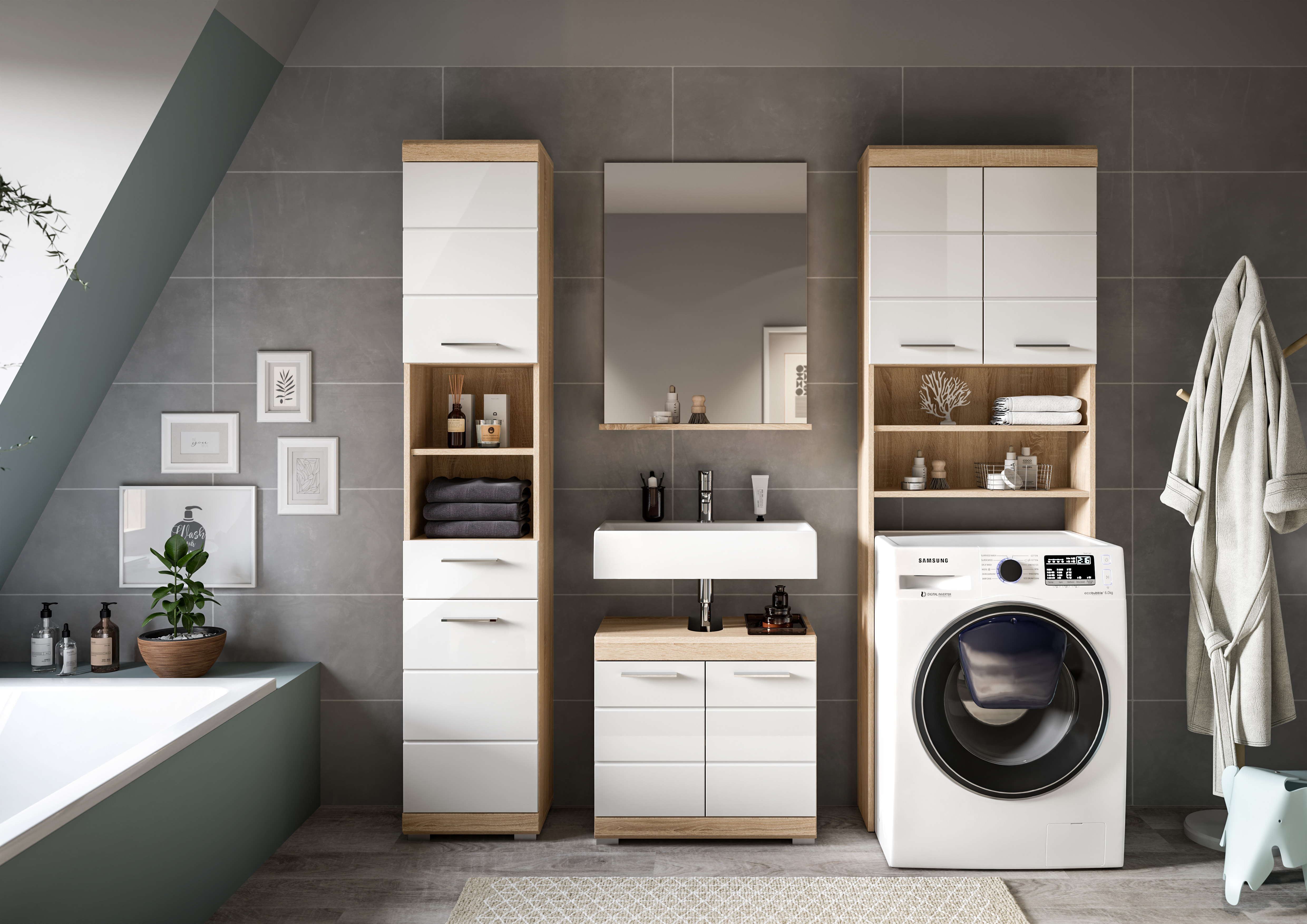 - Design/Stil: Die Kombination aus Sonoma Eiche hell und weißem Hochglanz tiefgezogenem Finish sorgt für ein modernes und ansprechendes Erscheinungsbild im Badezimmer oder Hauswirtschaftsraum.